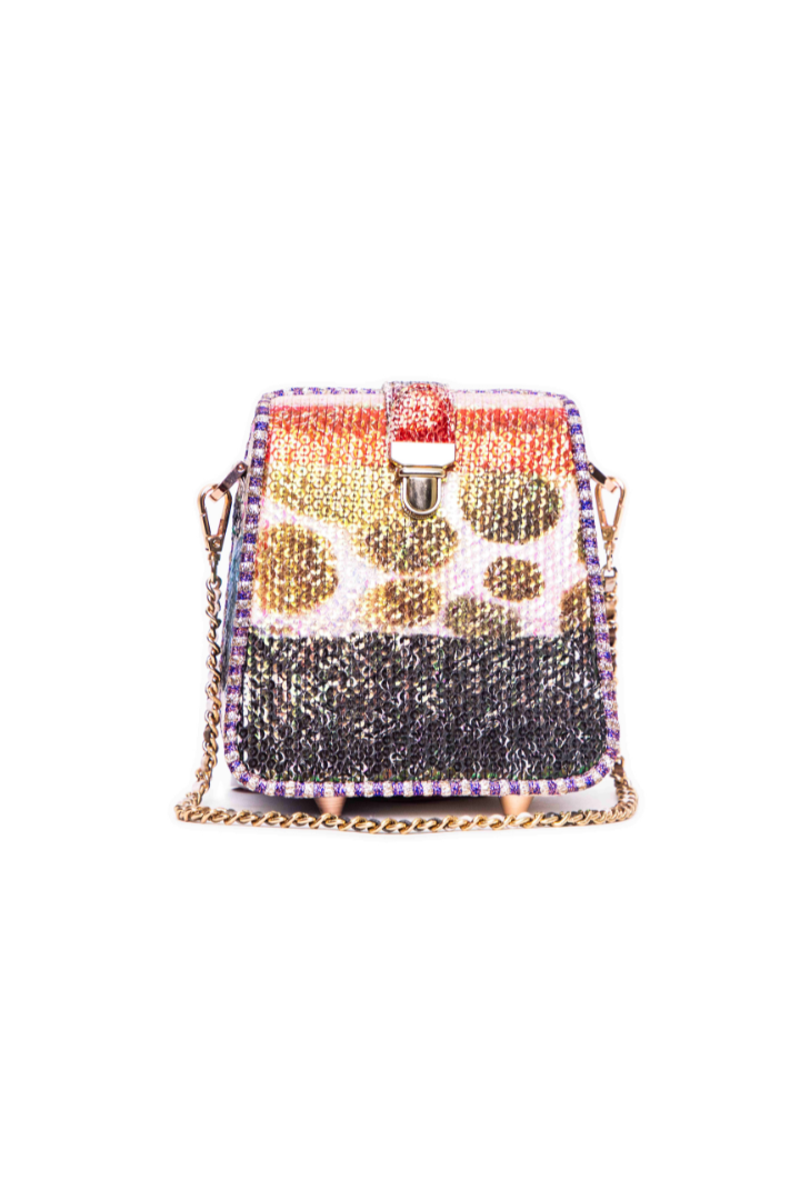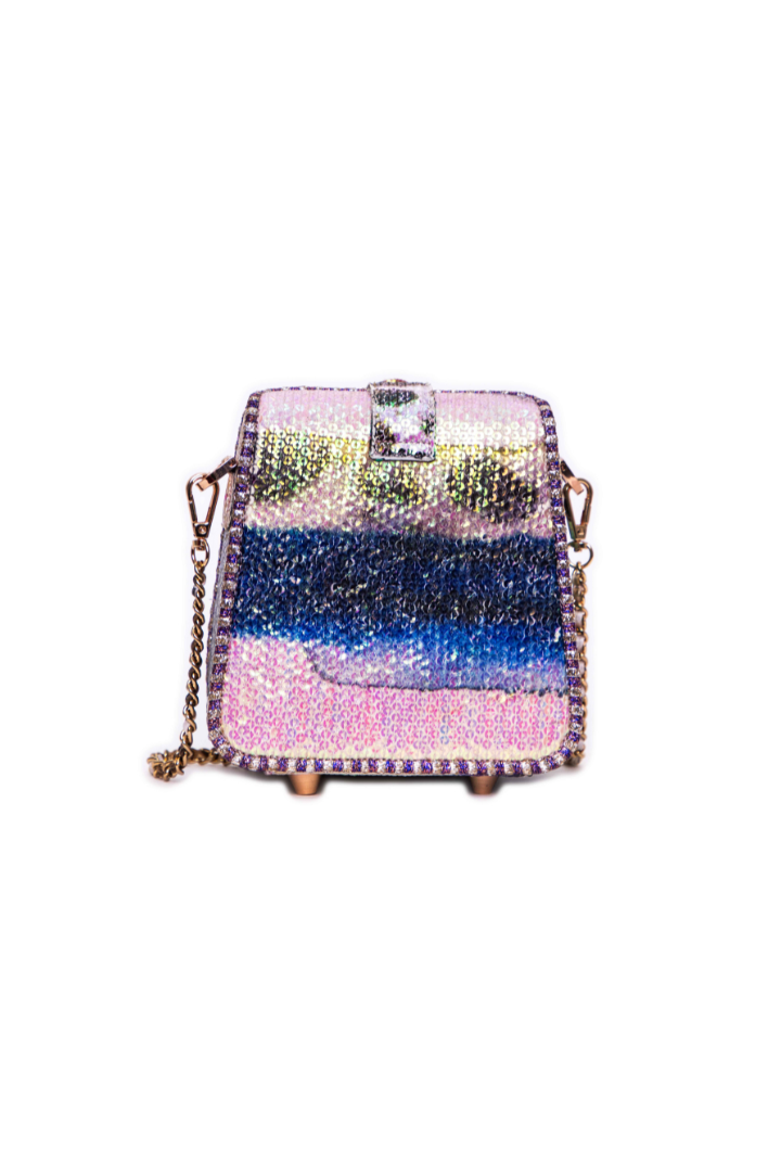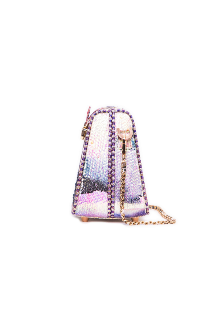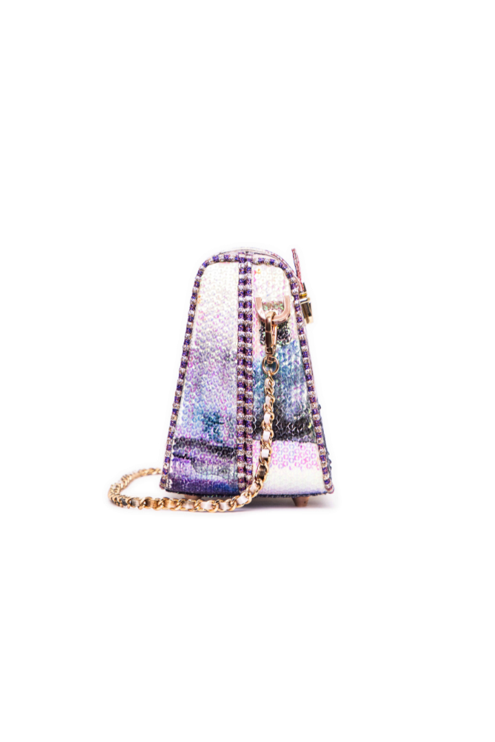Kinfolk mist purple printed sequin tulle box frame bag with strap lock detail & chain handle