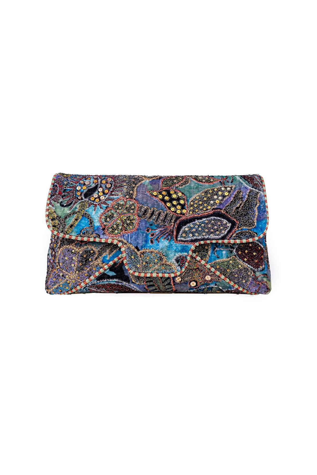 Kinfolk spectrum blue printed embellished velvet baguette bag