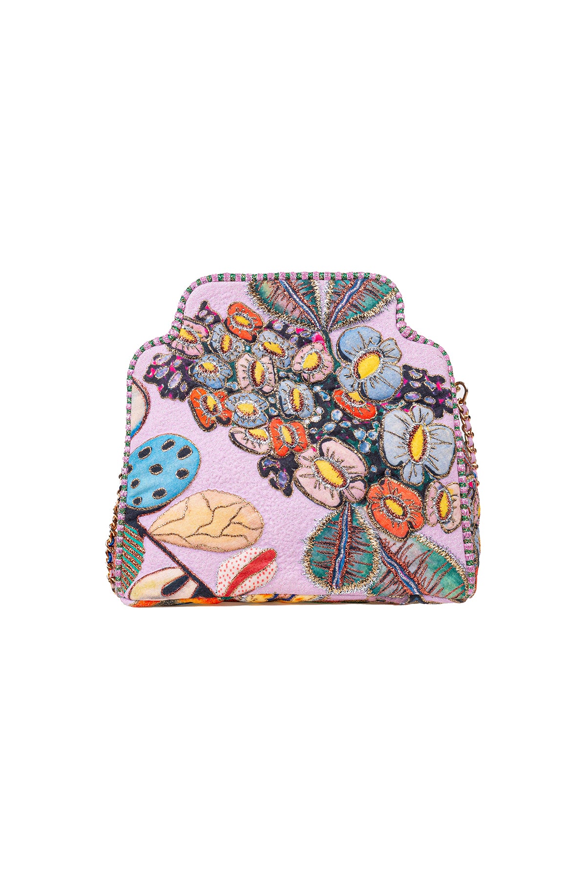 Kinfolk lilac printed embellished canvas frame bag with chain handle