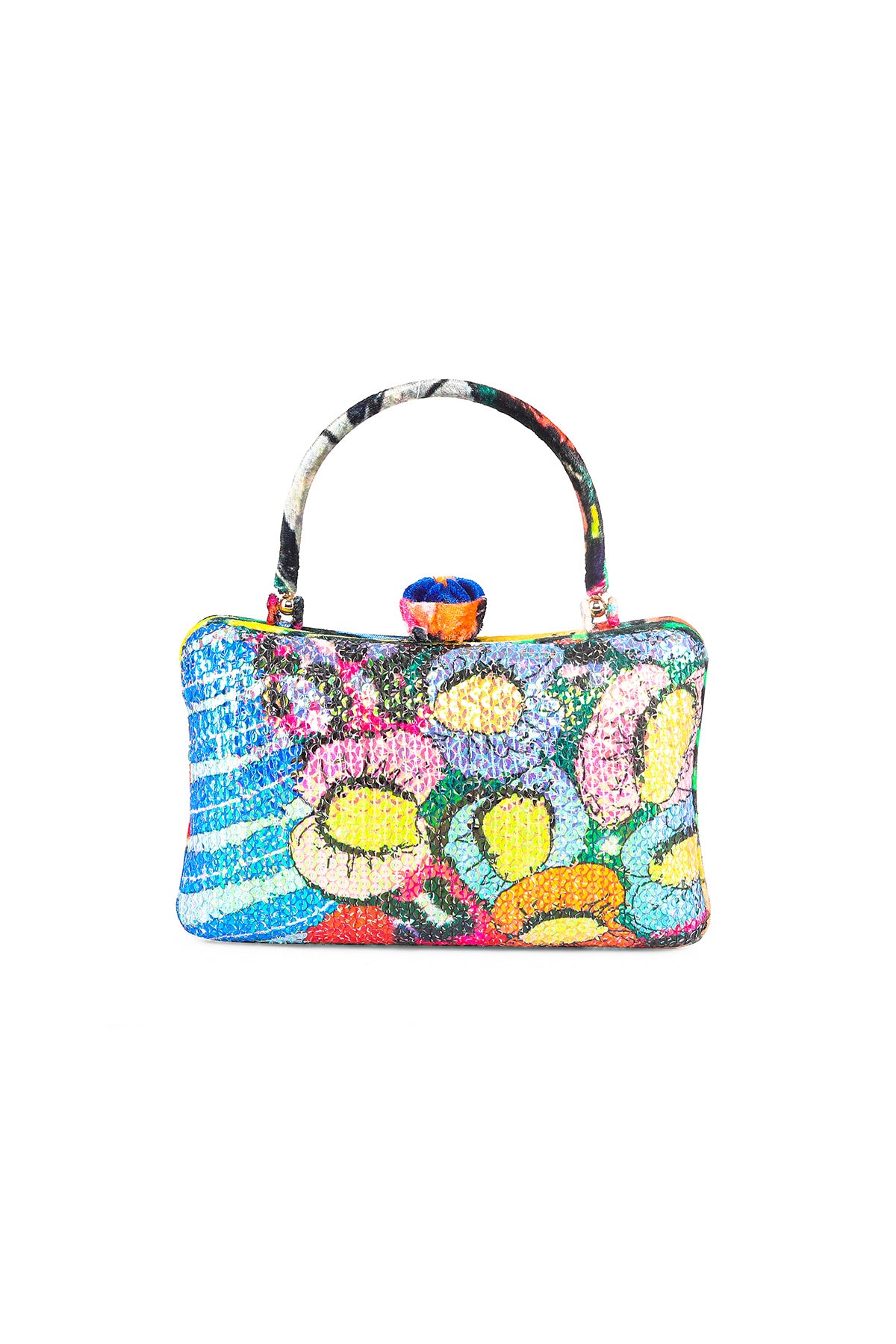 Kinfolk multi-color printed sequin tulle slim box shape minaudiere with handle & flower detail