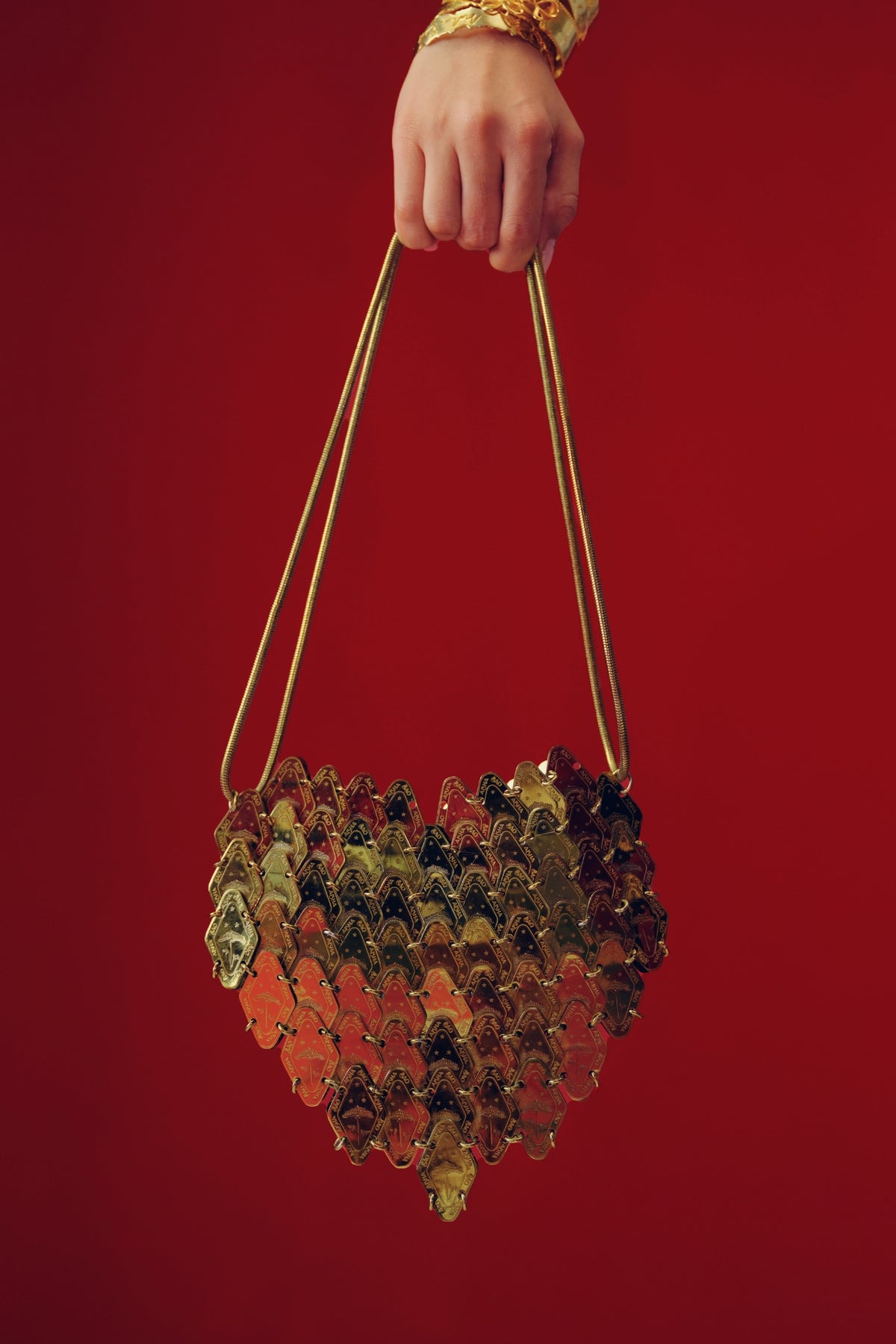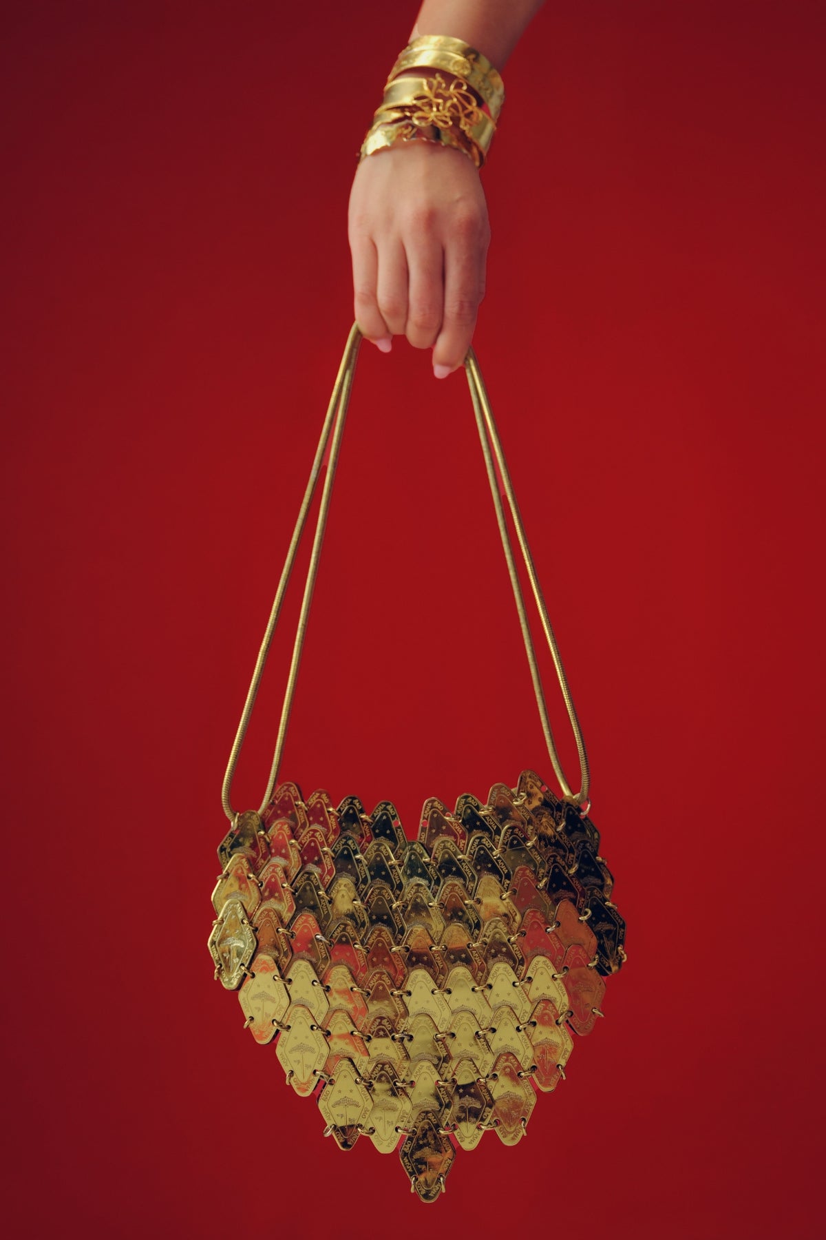 Wild at heart, golden brass, diamond-cut heart chainmail bag with an iron chain
