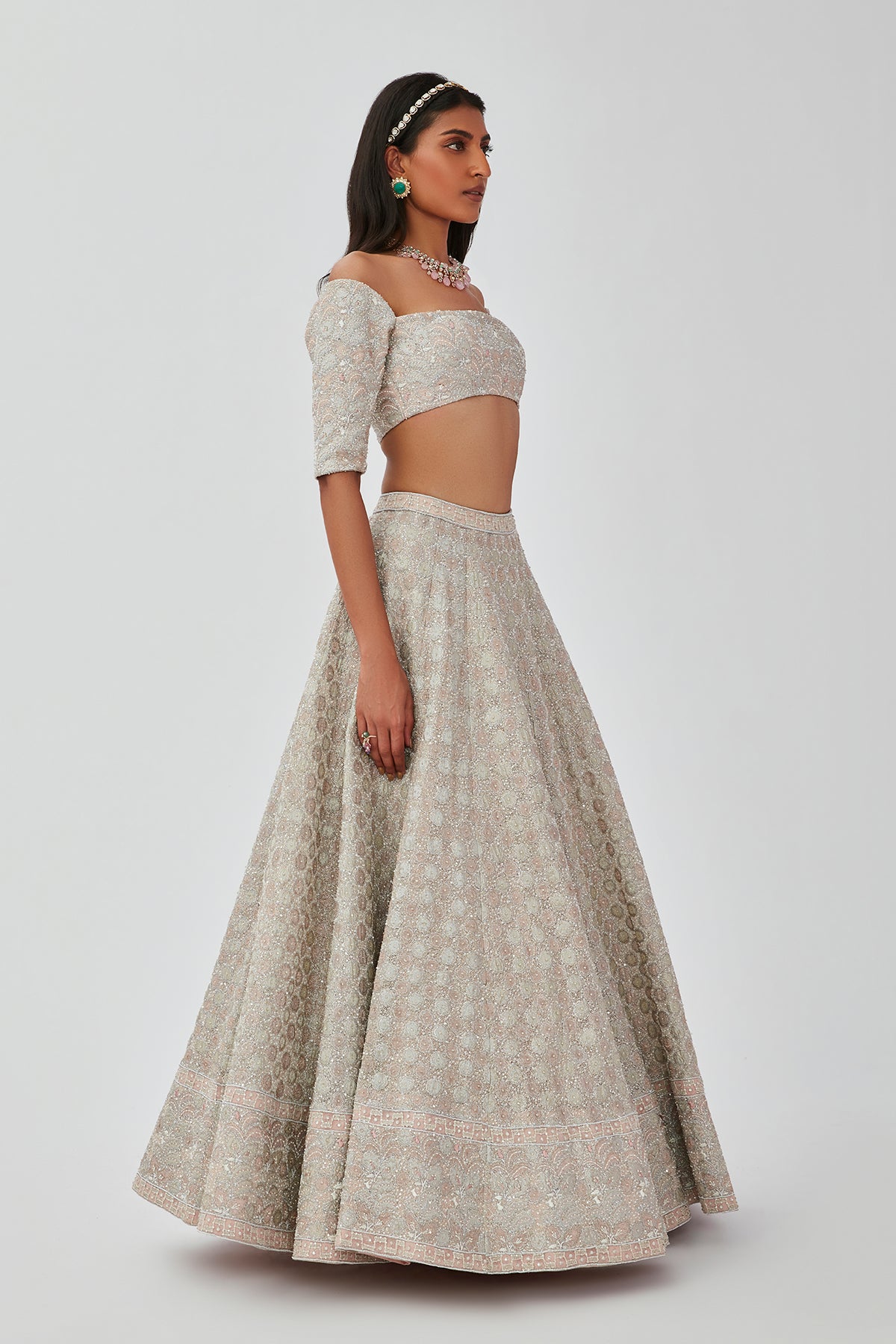Silver pastel tissue appliqued and heavy embellished Tulle lehenga with an off-shoulder blouse and scallop dupatta.