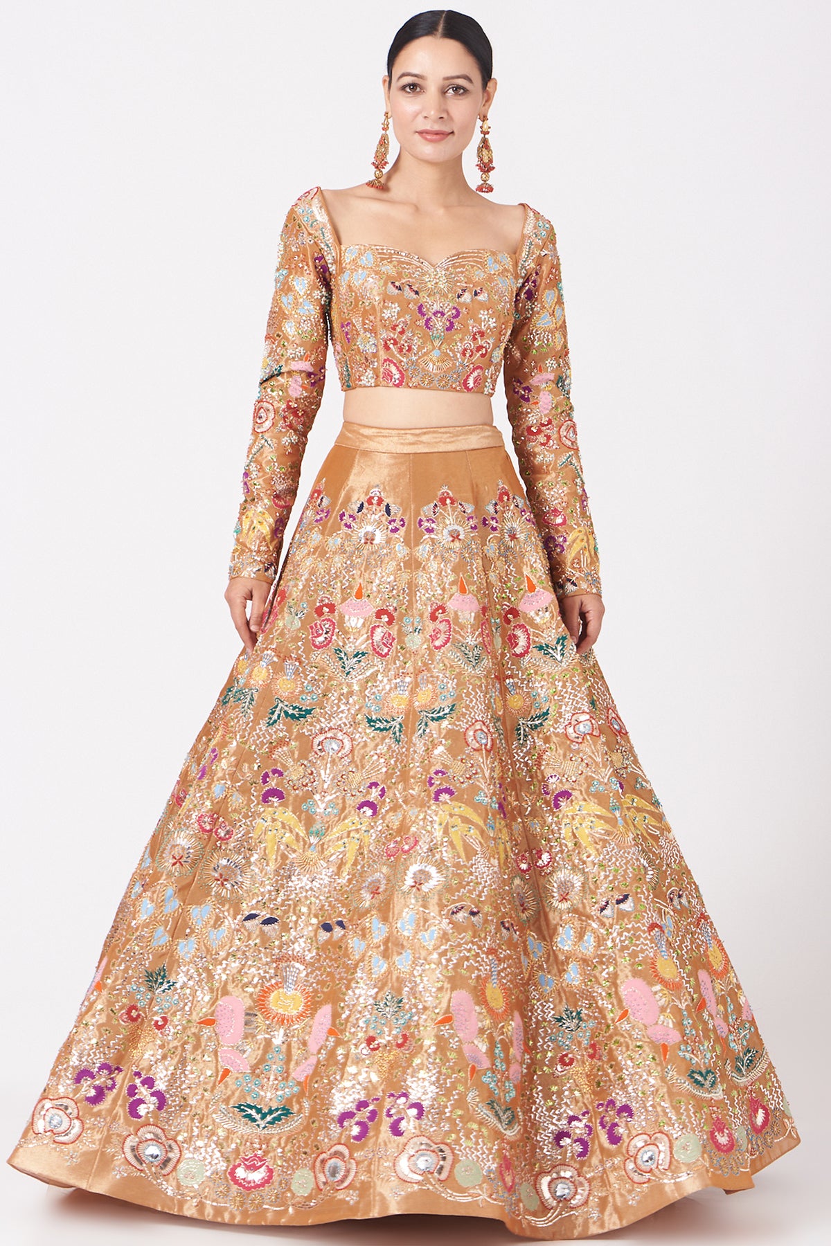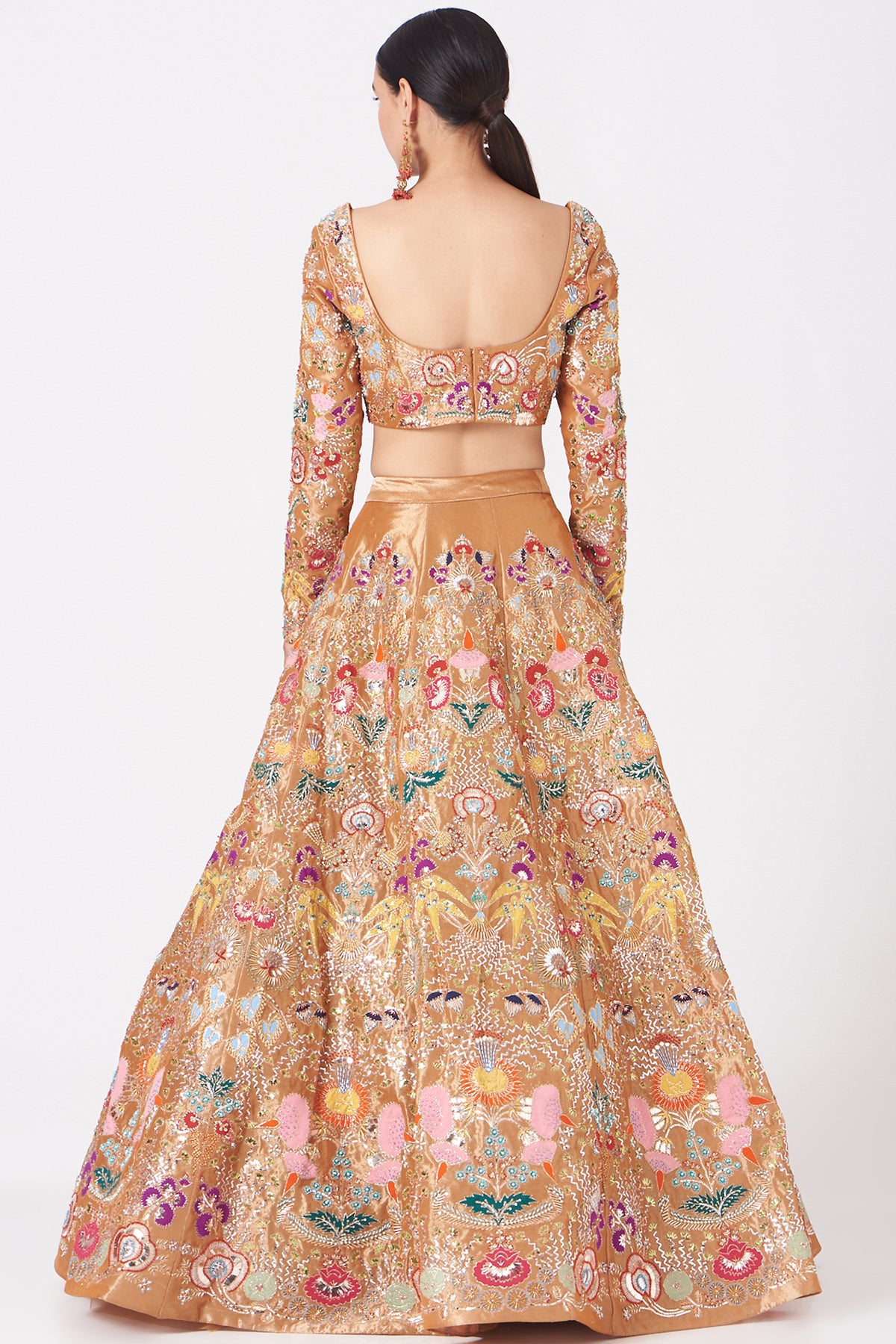 Copper paper dolls tissue appliquéd and embellished lehenga with blouse and cutwork tissue dupatta