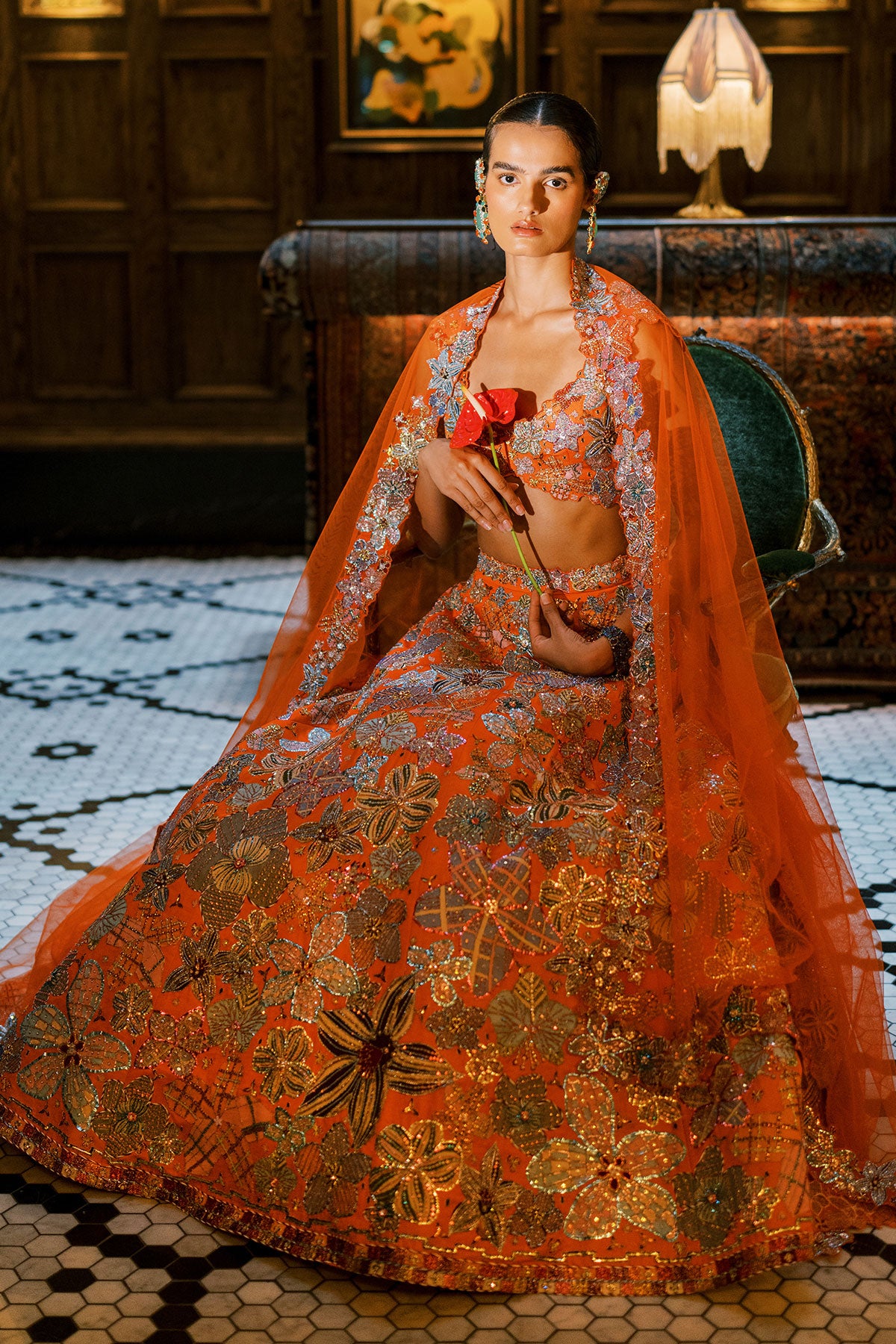 Matilda Orange Printed Embellished Kasab Satin Lehenga With Blouse And Tulle Dupatta