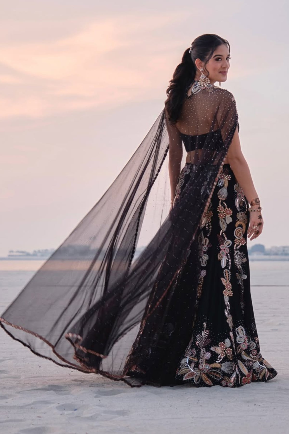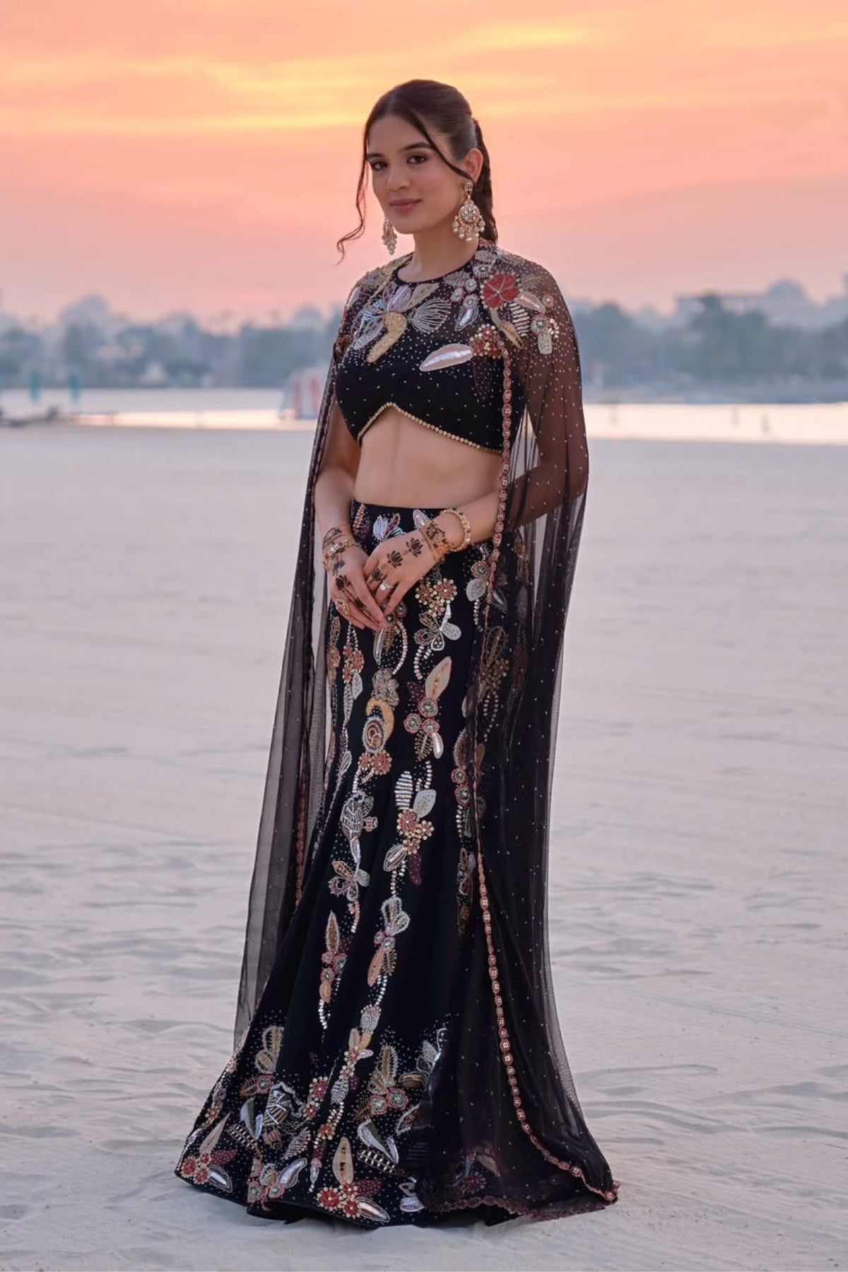 Kinfolk Black applique embellished georgette fish tail lehenga with tulle haulter cape blouse.