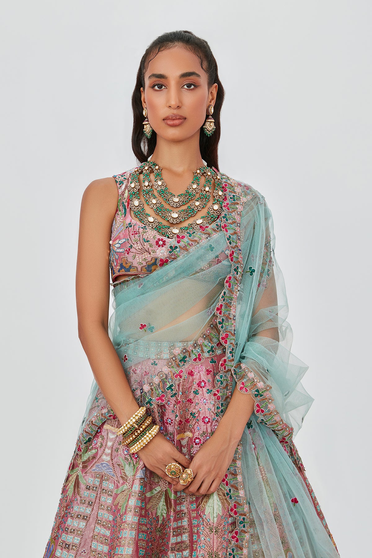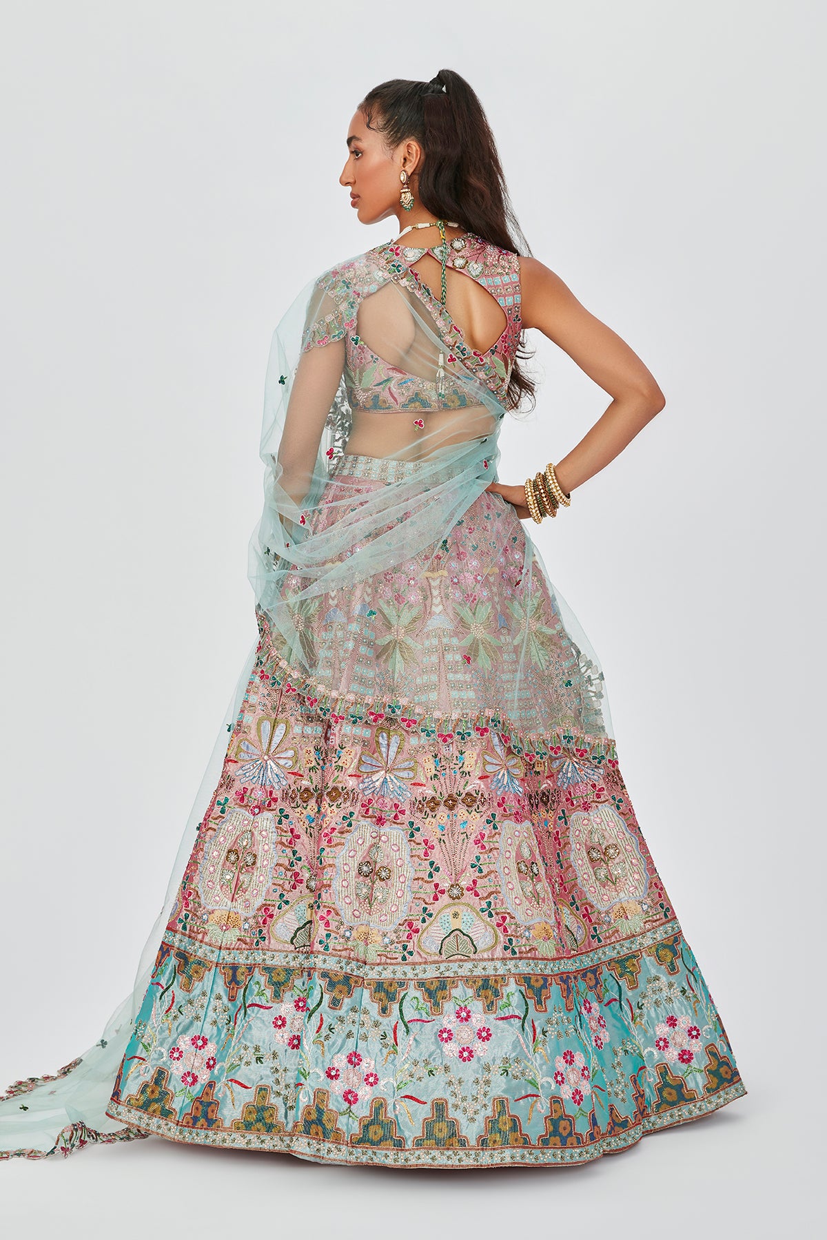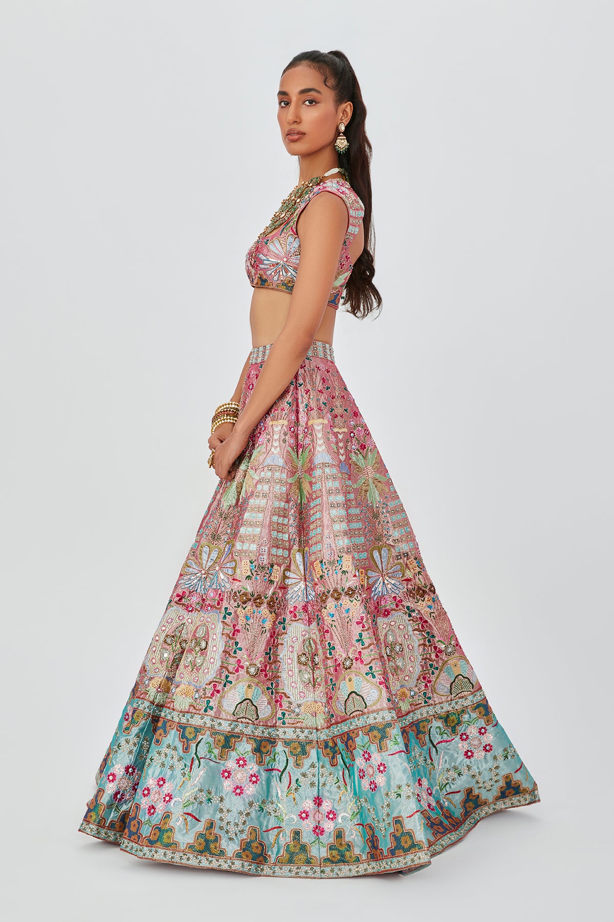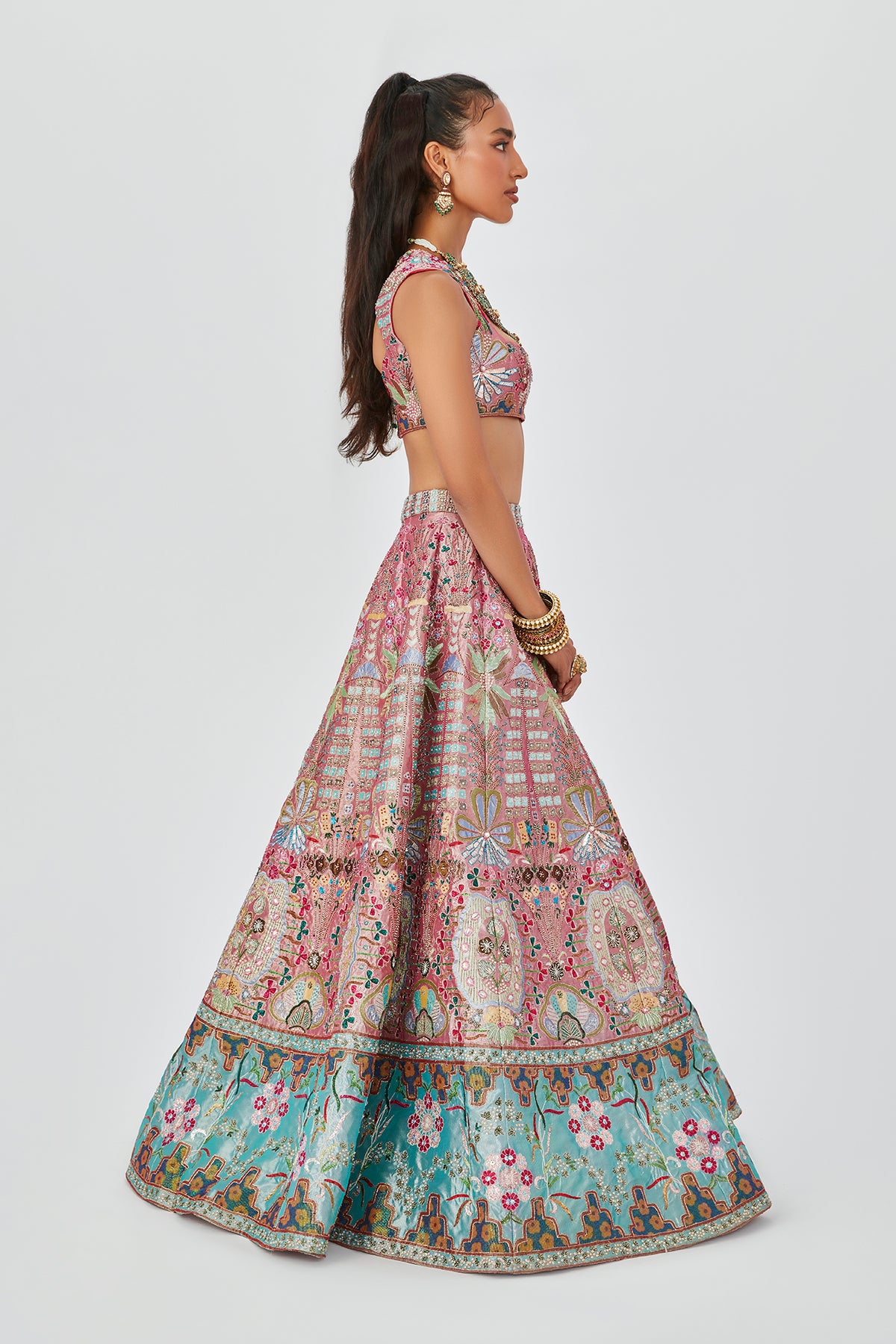 Multicolour Pink/ blue embellished heavy kali Tissue contrast broad border lehenga with sleeveless blouse & scallop dupatta.
