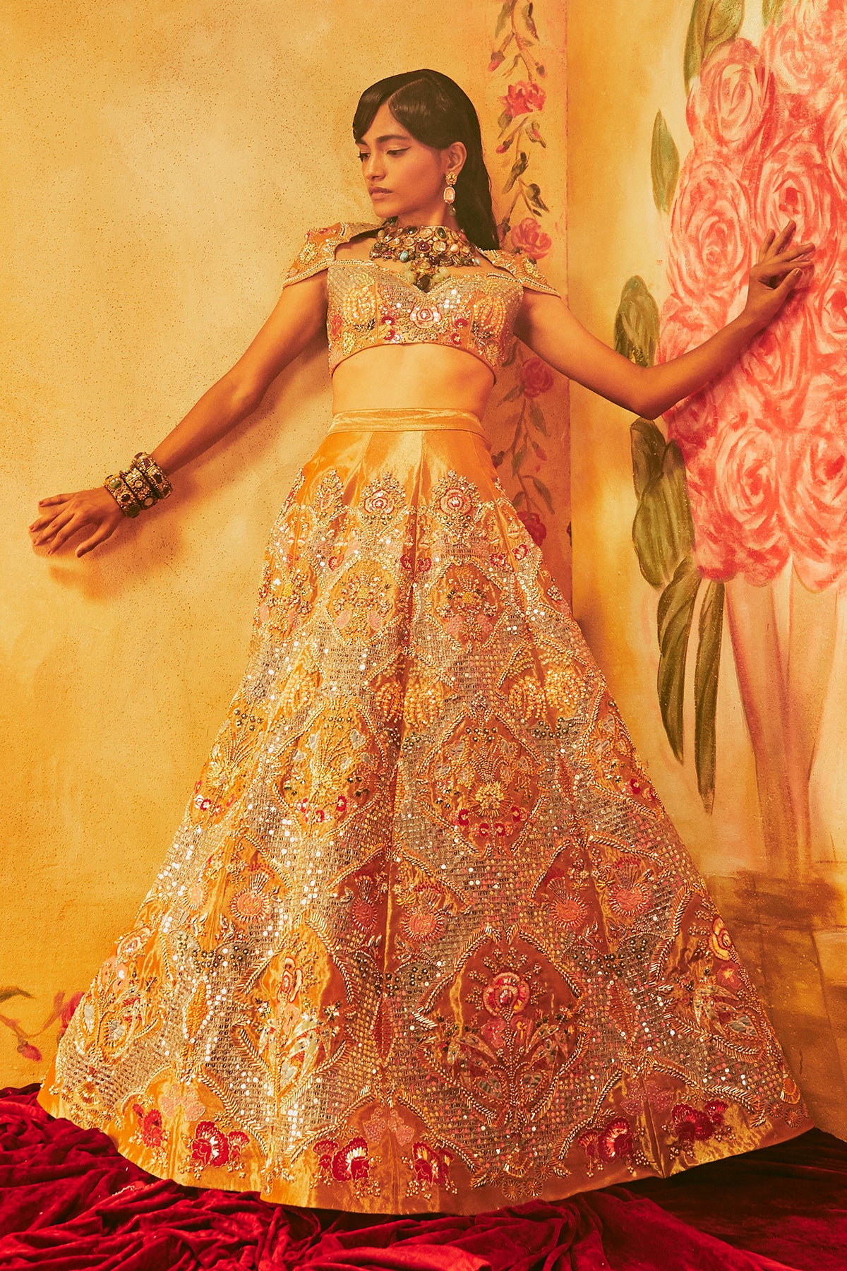 Copper paper dolls tissue appliquéd and embellished lehenga with blouse and cutwork tissue dupatta
