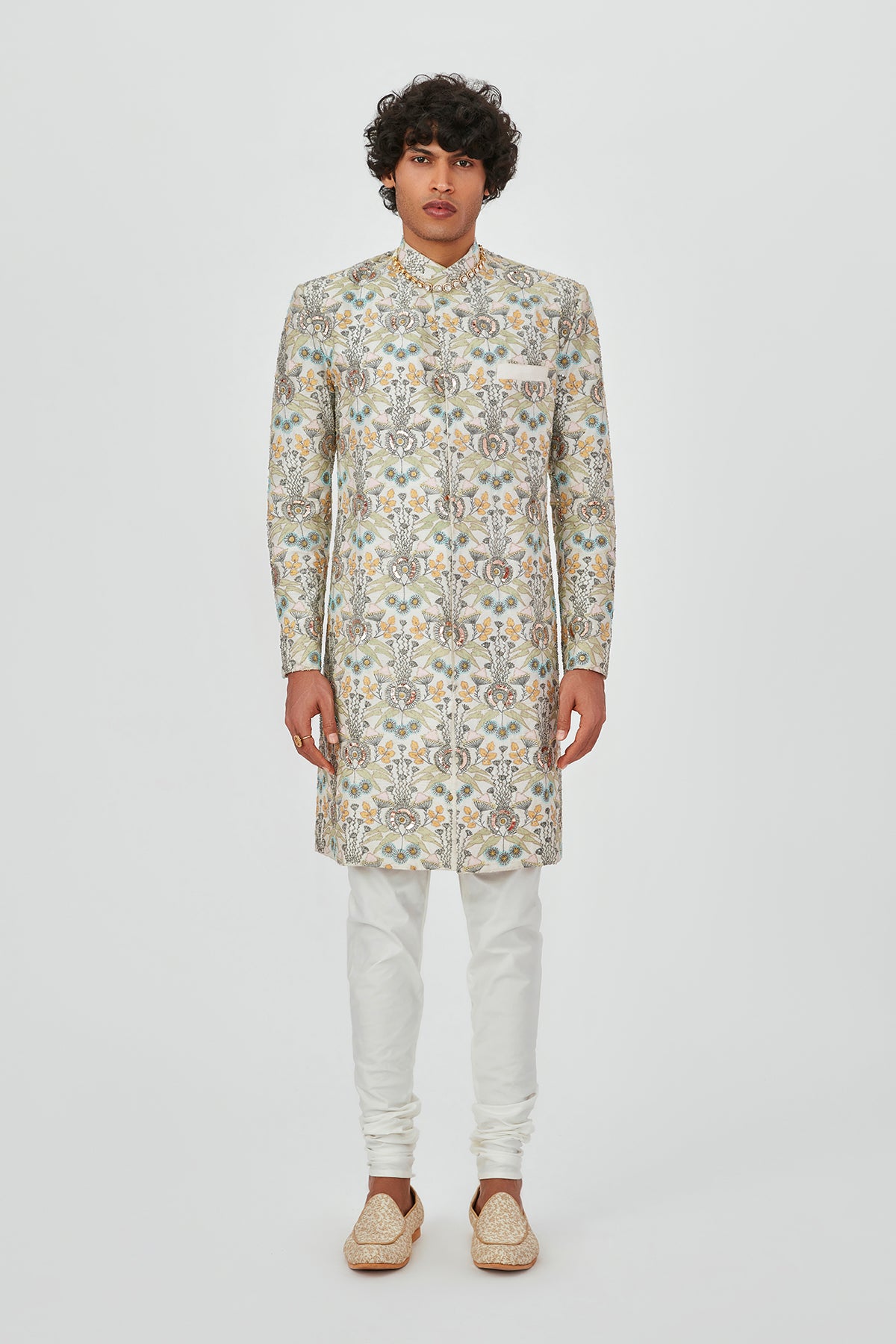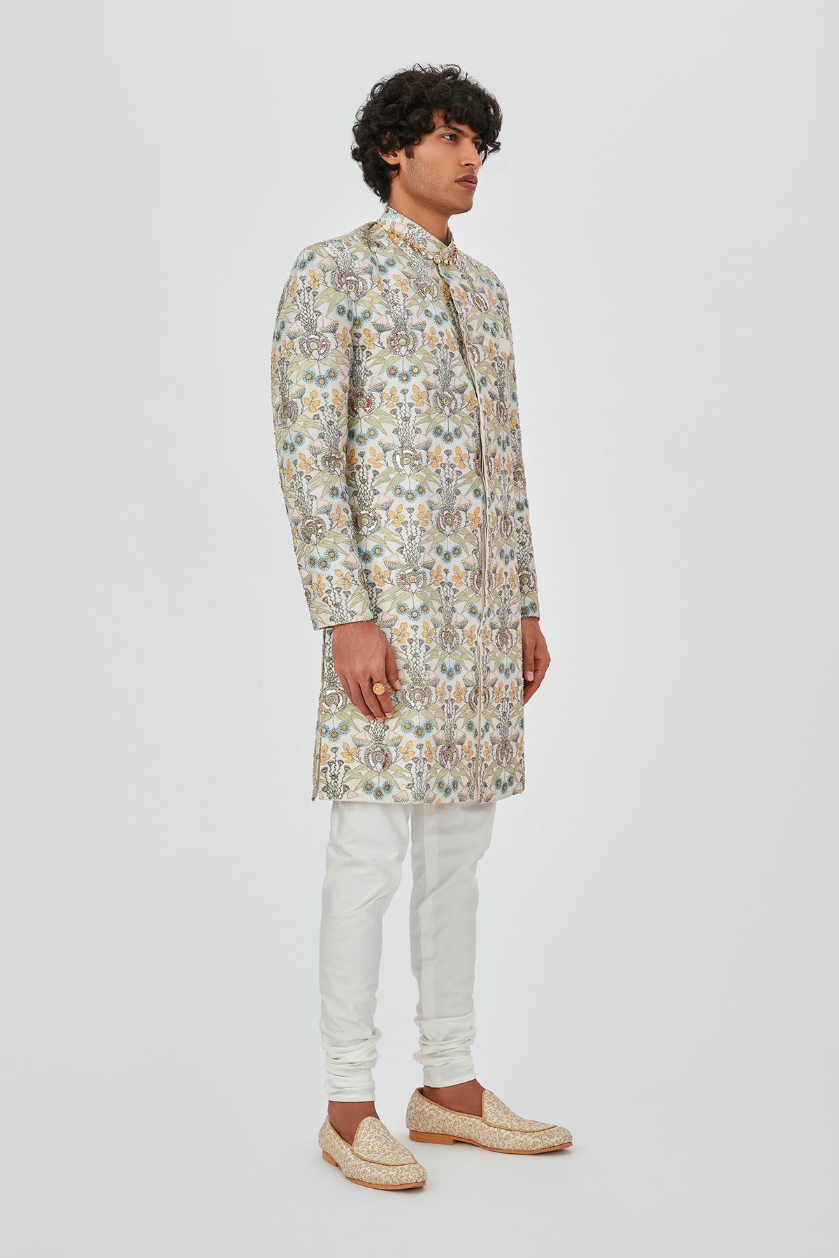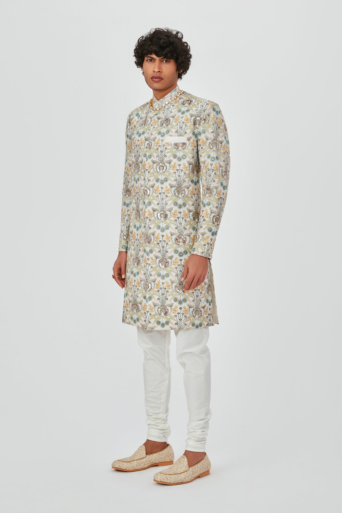 Beige raw silk heavy embellished and appliqued sherwani with churidar.