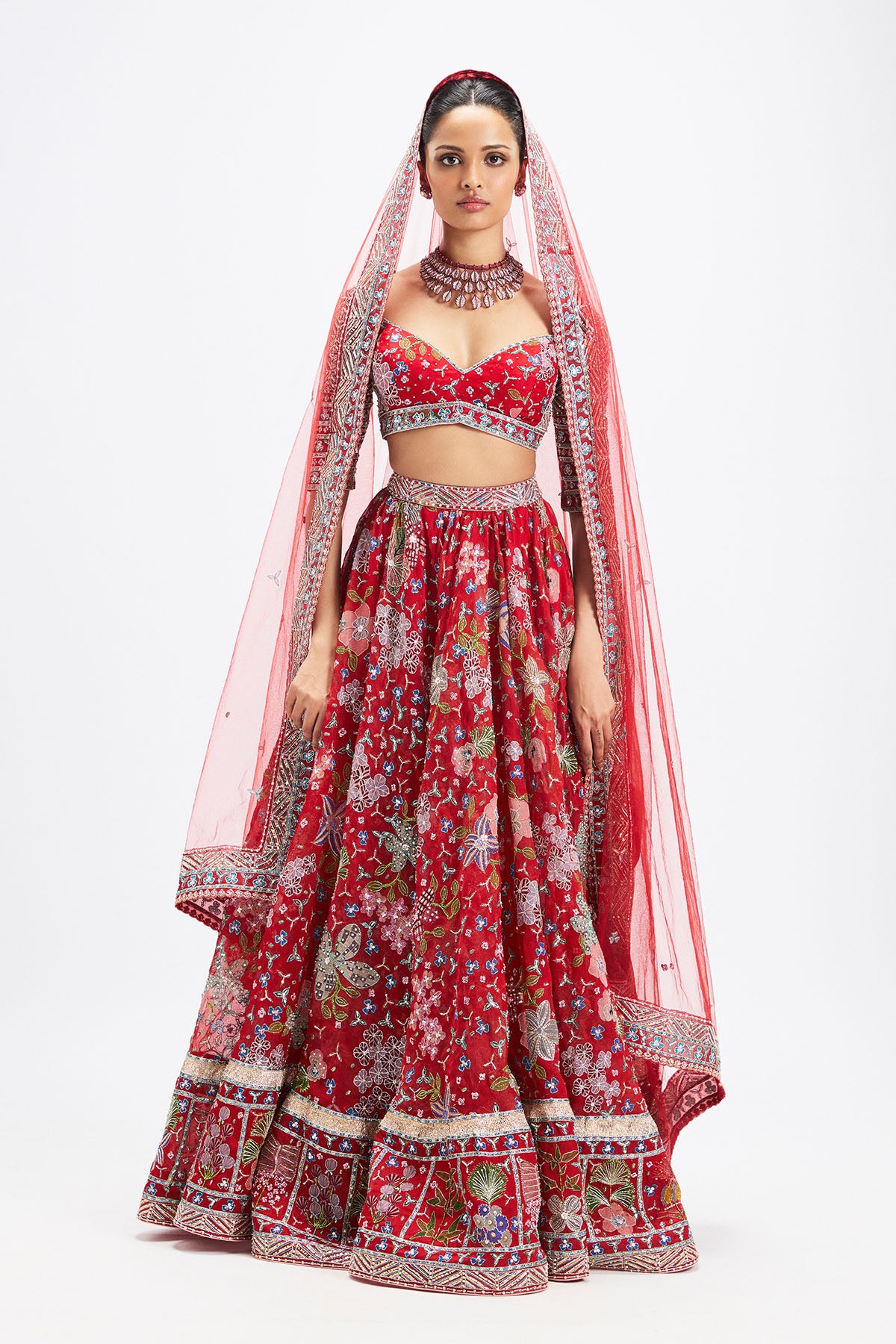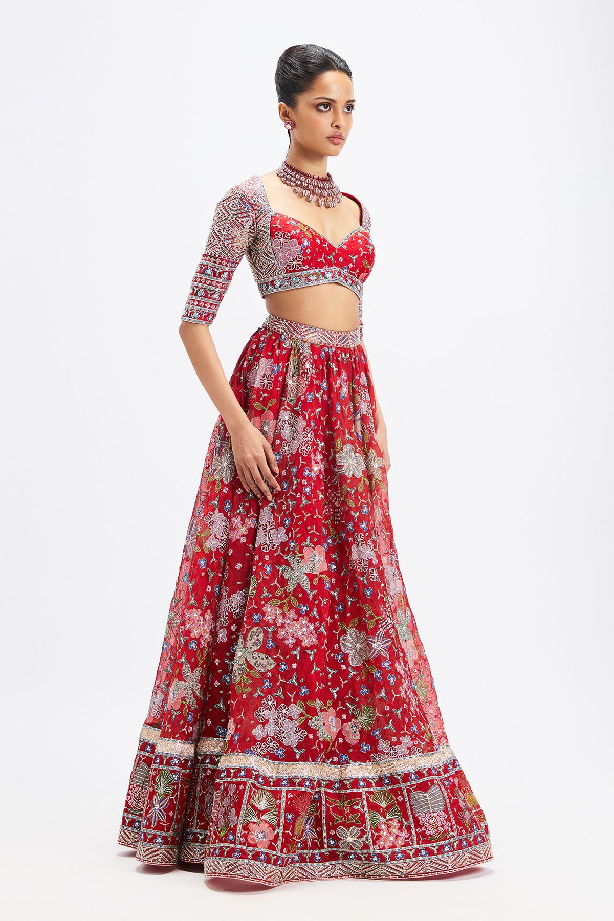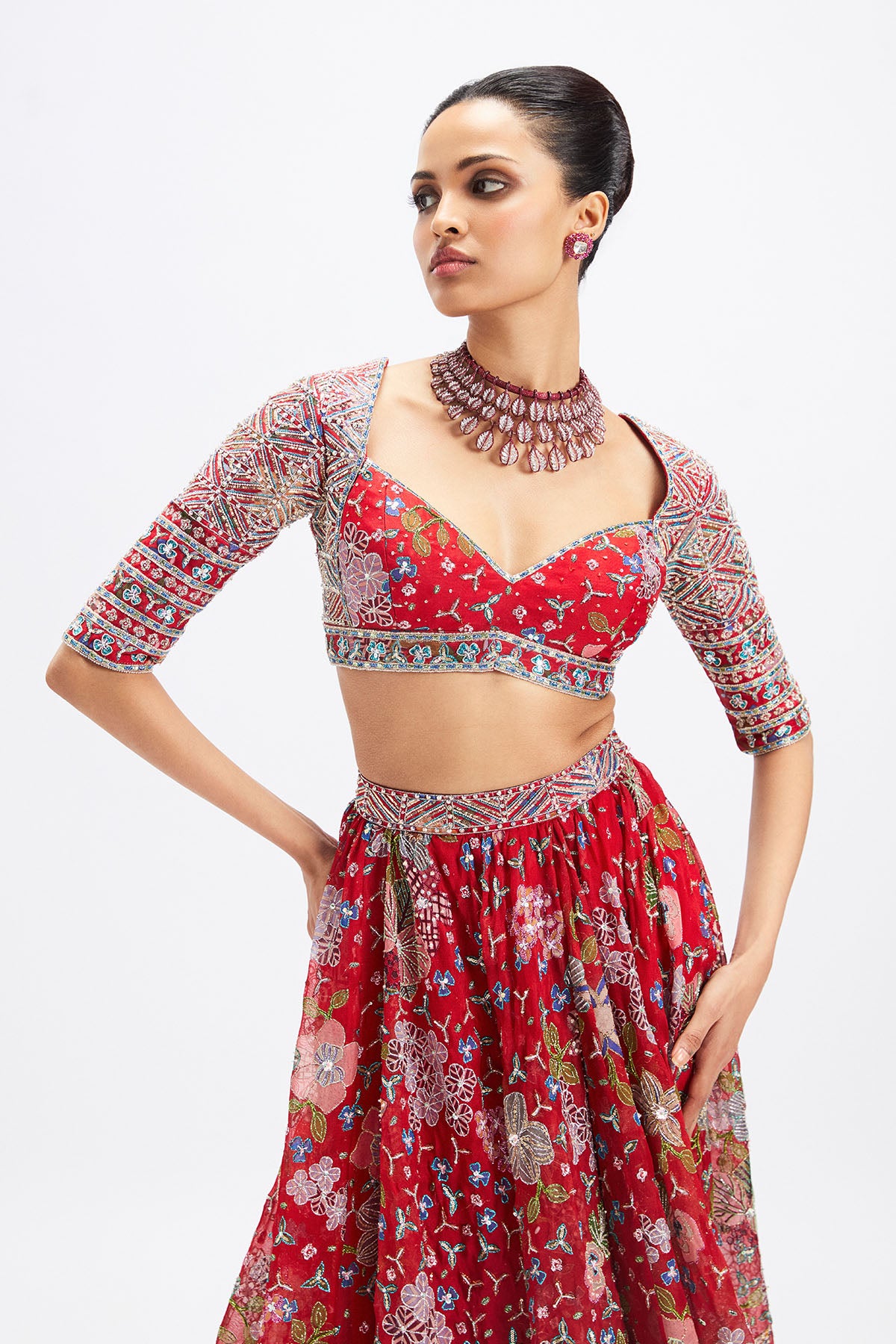 Matilda red printed applique embellished organza gathered lehenga with blouse & tulle dupatta