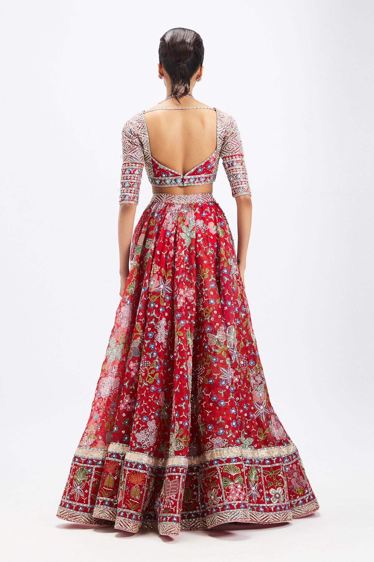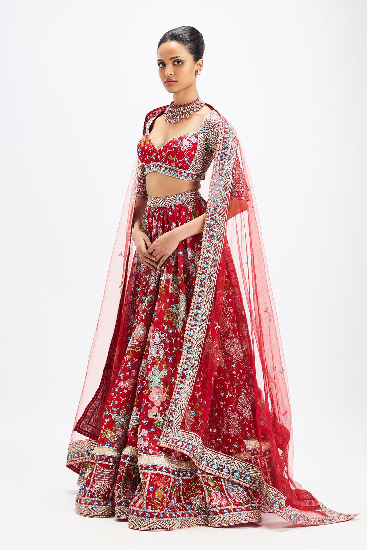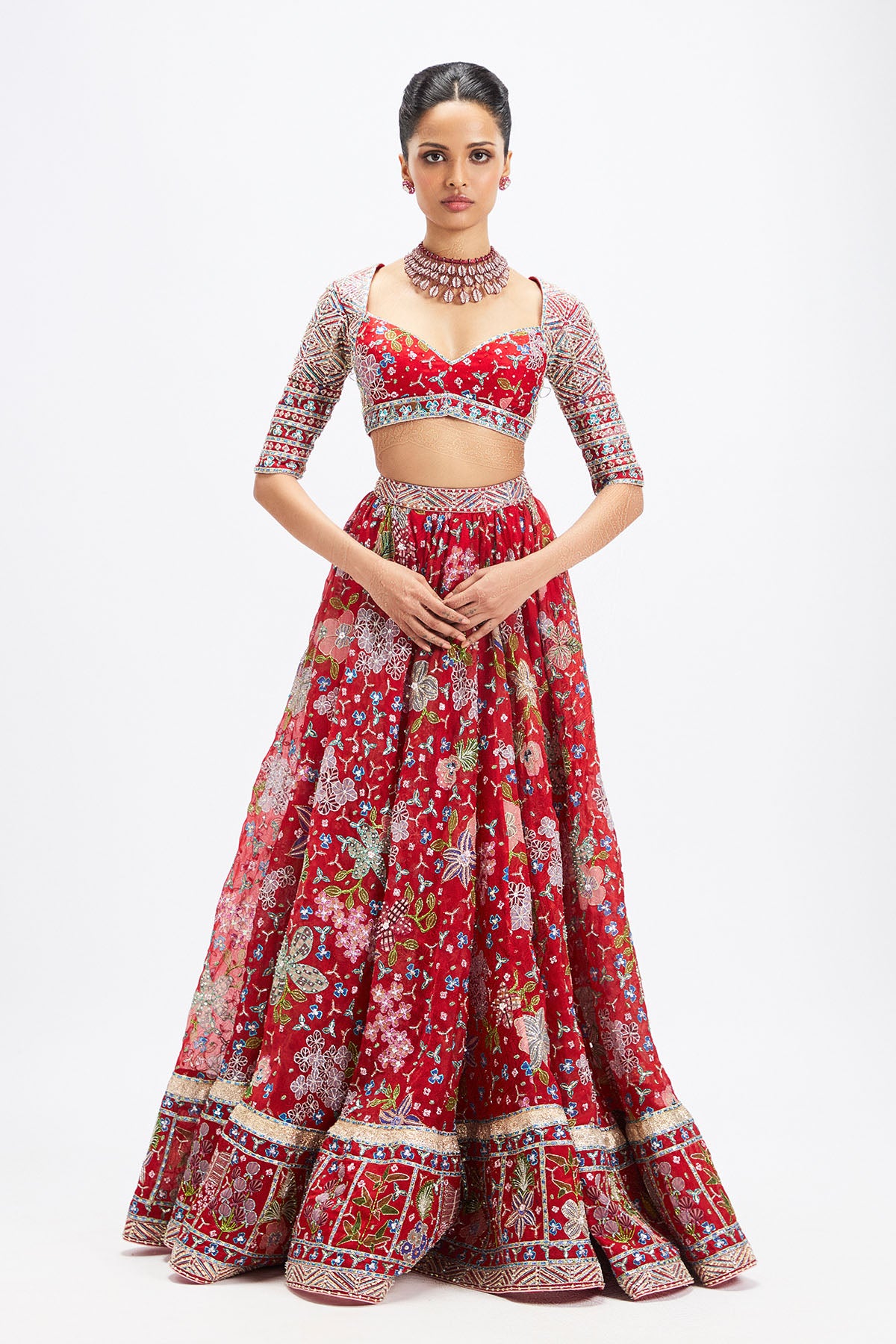 Matilda red printed applique embellished organza gathered lehenga with blouse & tulle dupatta