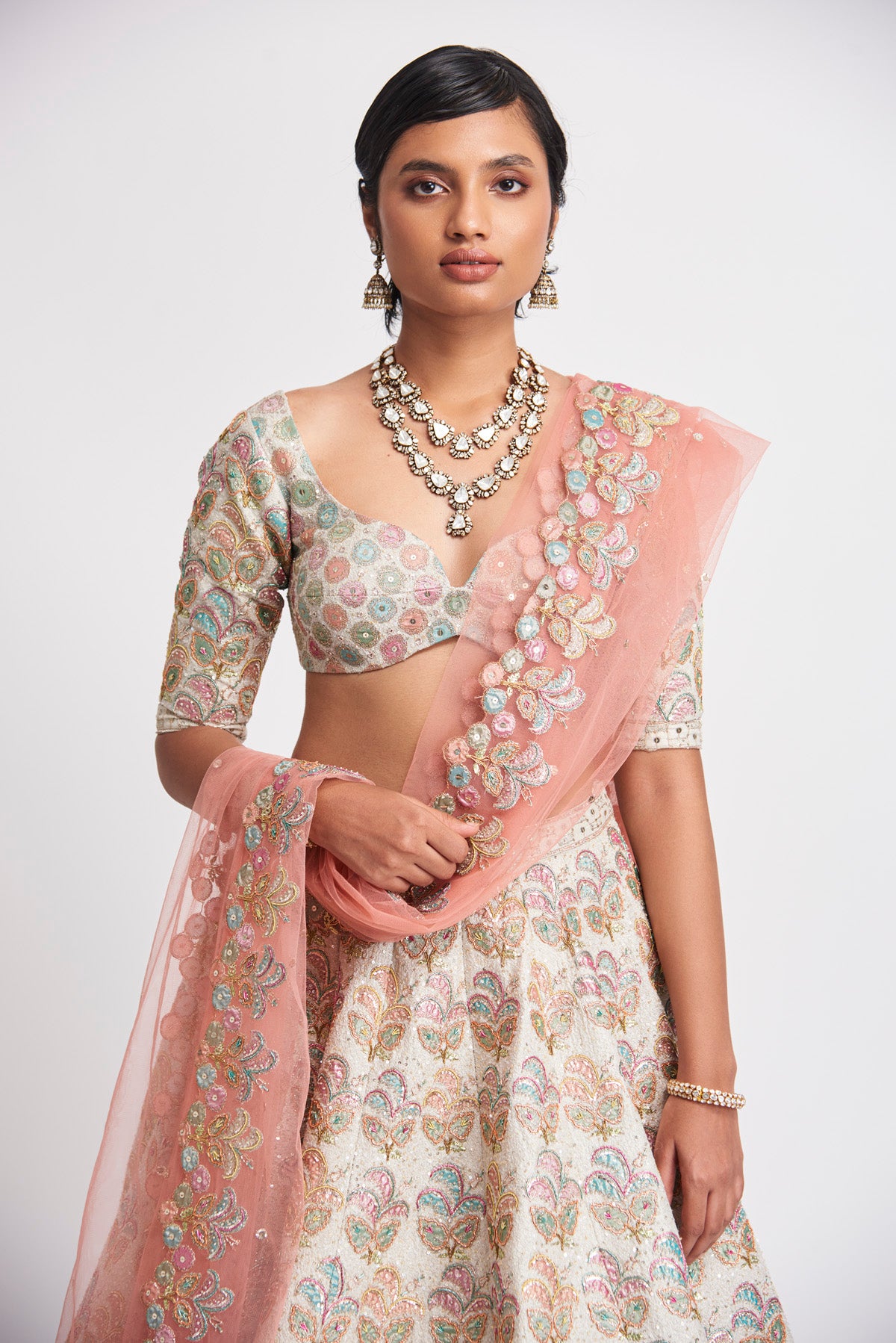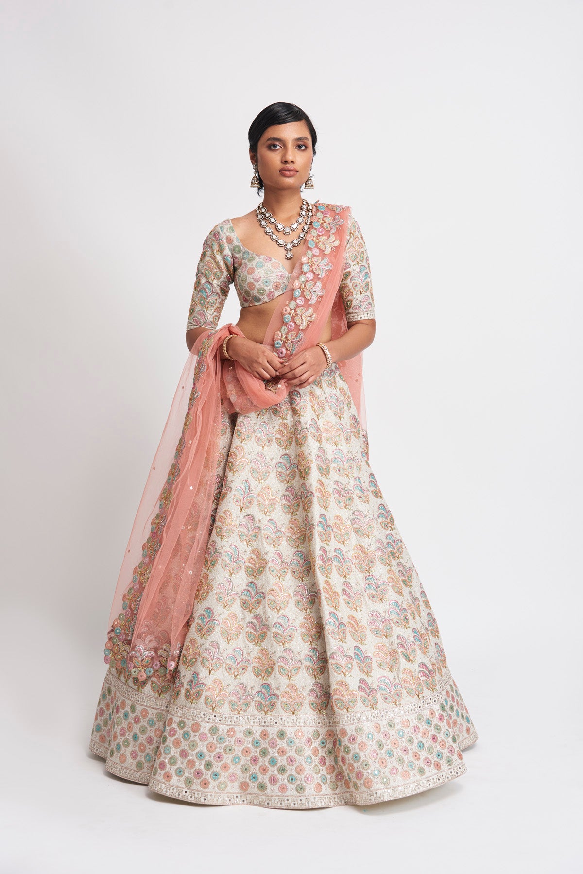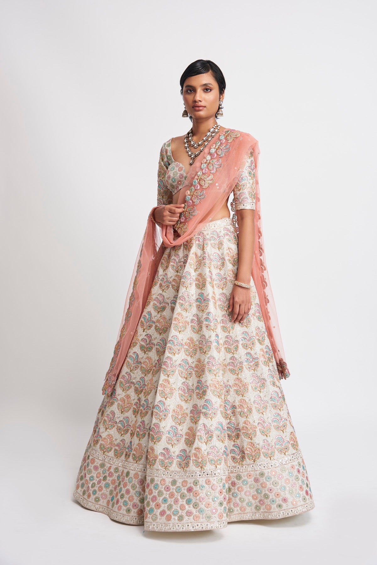 Banafsh Almond applique embellished raw silk lehenga, blouse & tulle dupatta.