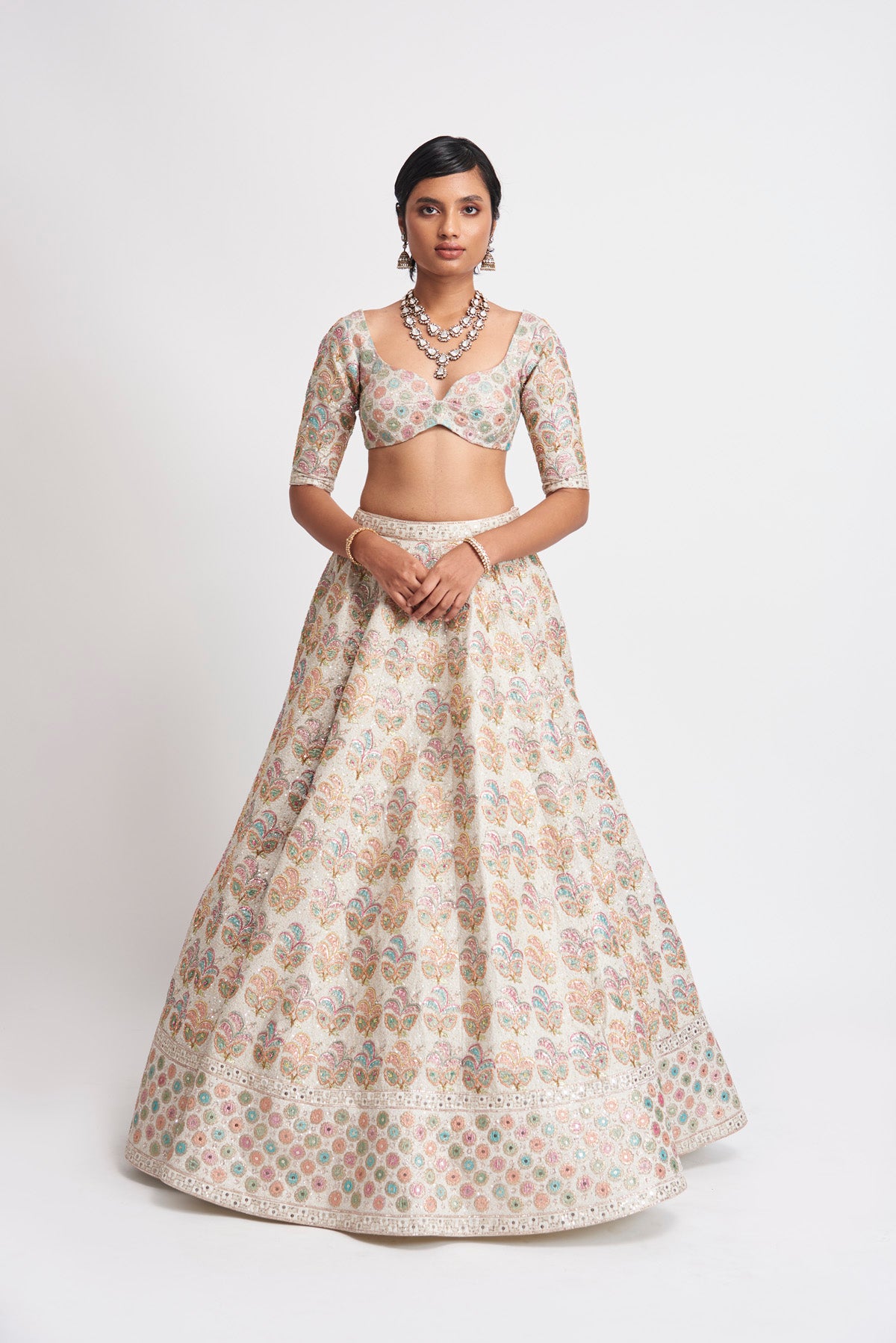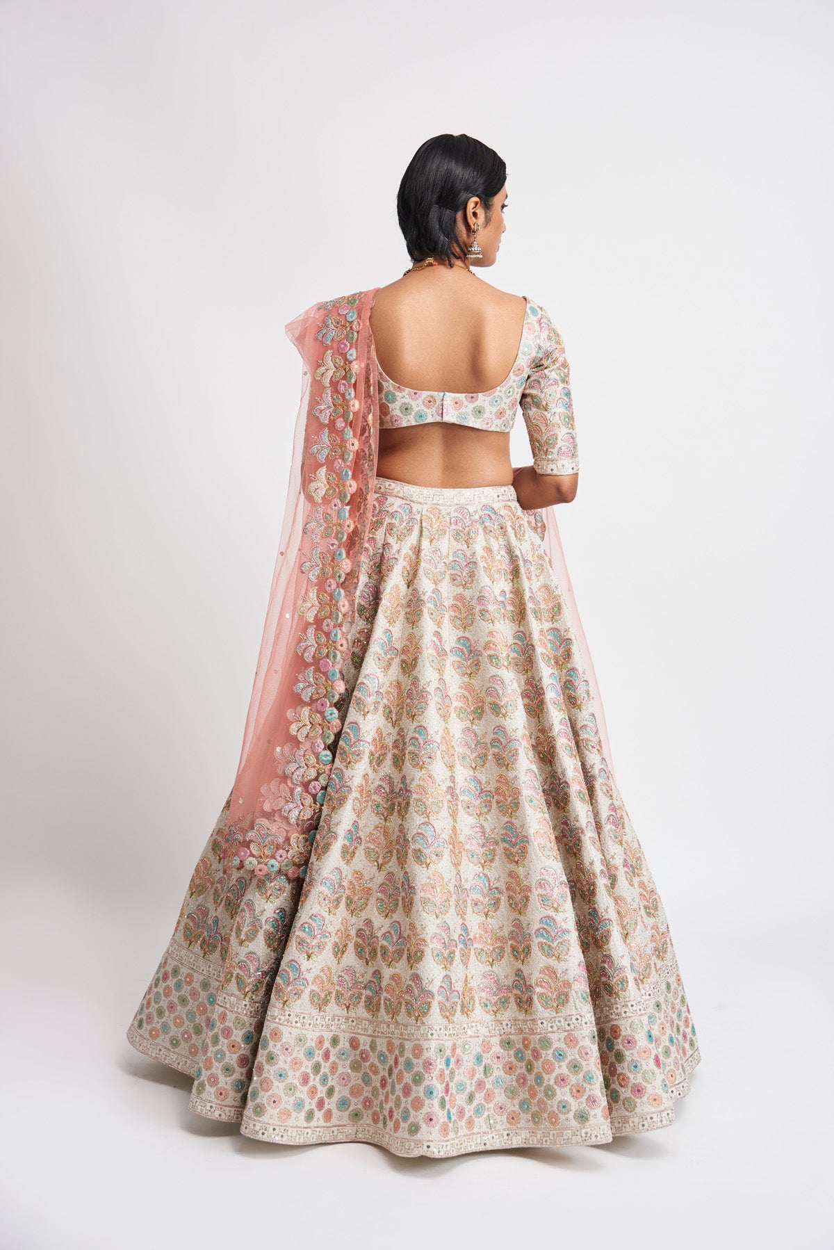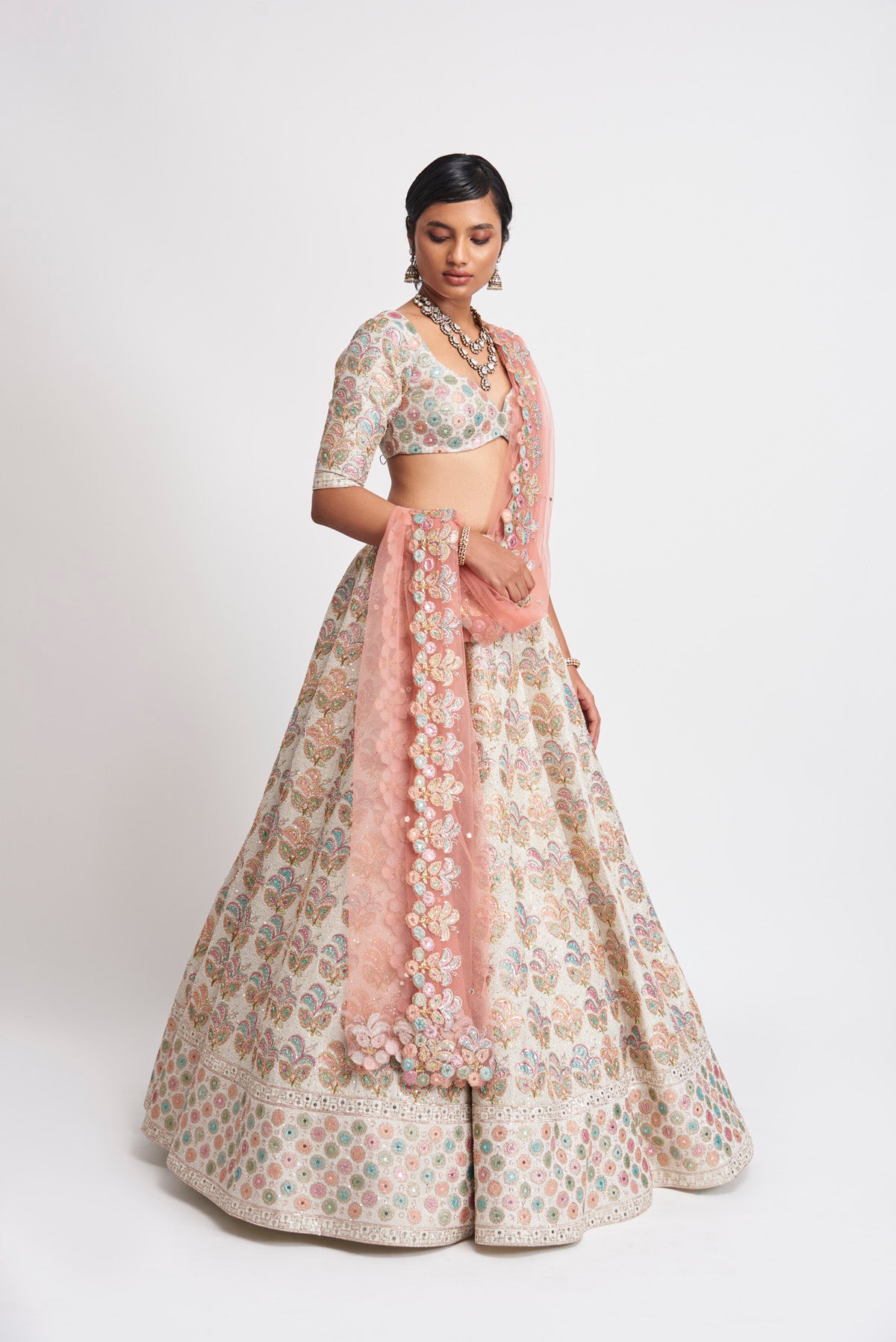 Banafsh Almond applique embellished raw silk lehenga, blouse & tulle dupatta.