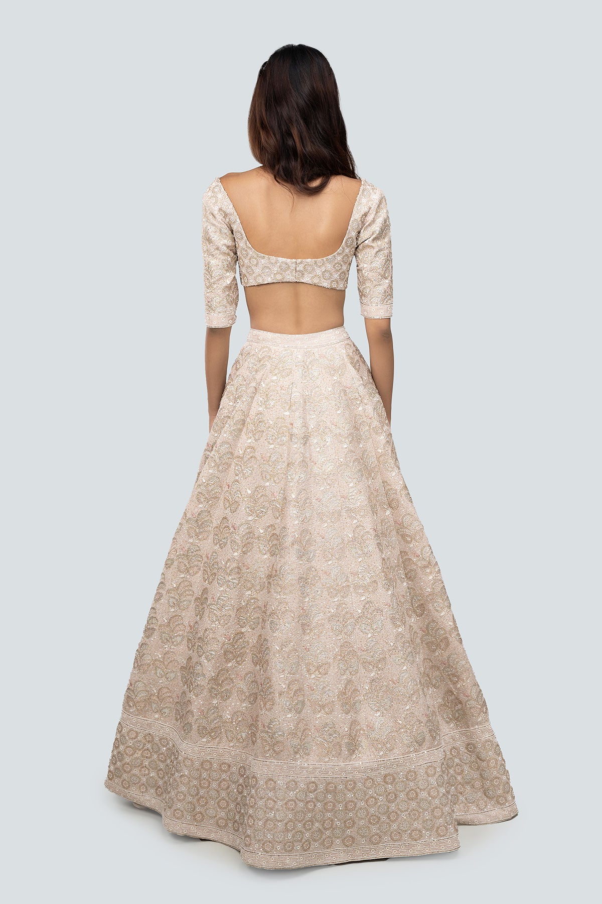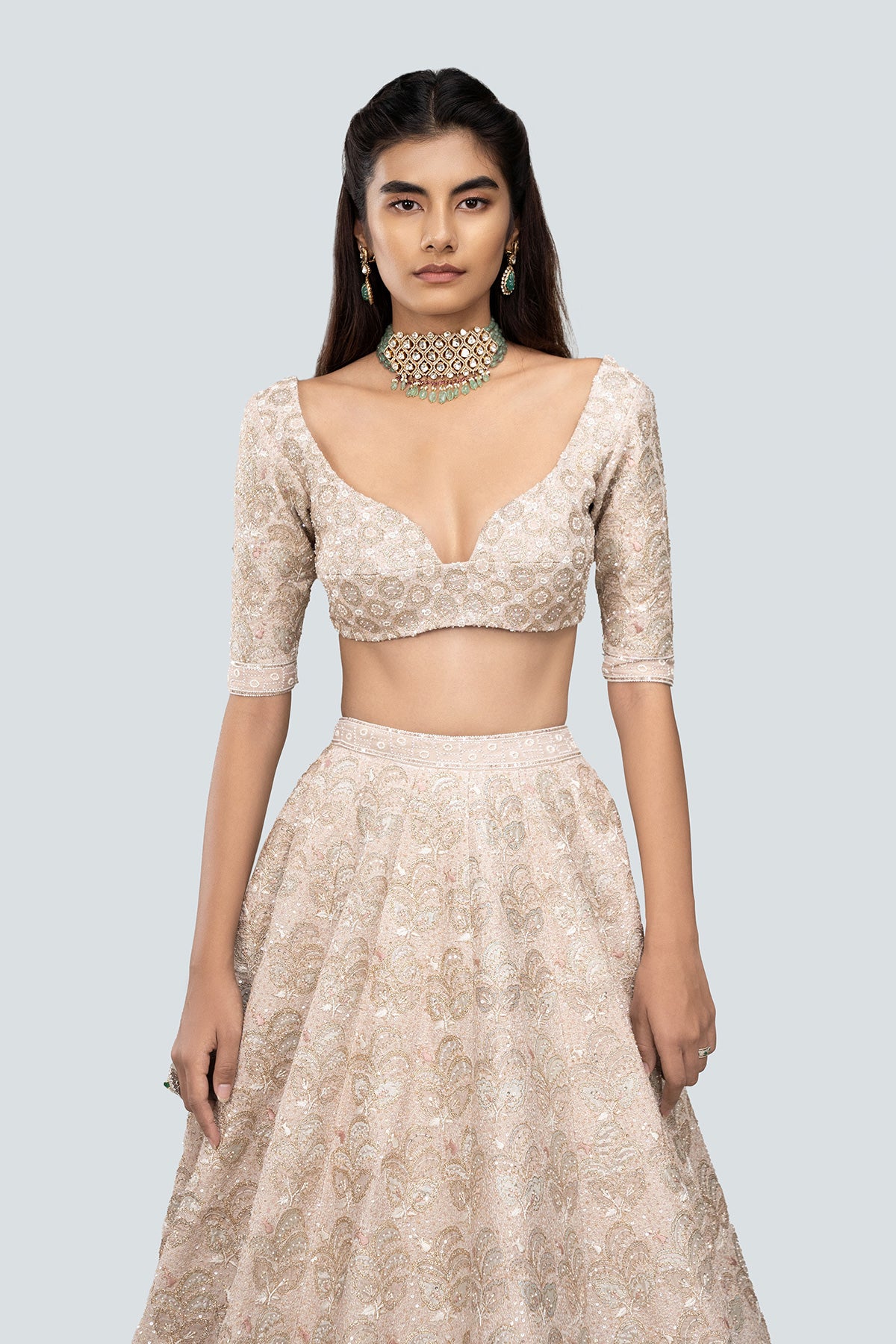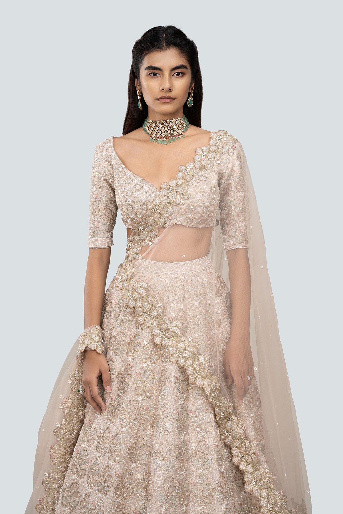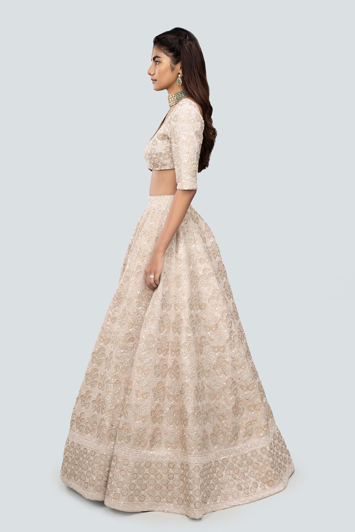 Beige tissue appliqué and heavy embellished raw silk kali lehenga with blouse and cutwork border tulle dupatta.