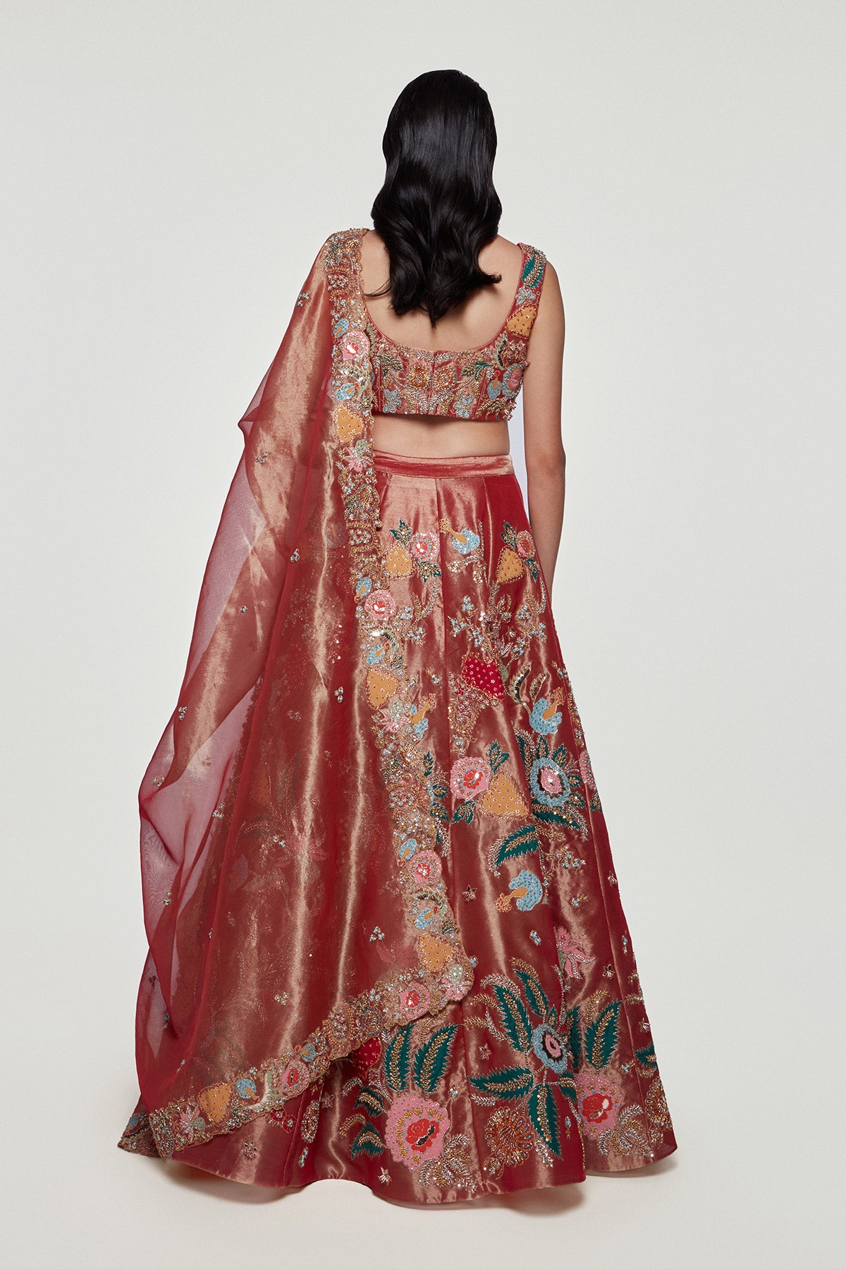 Maroon juna tissue appliquéd and embellished lehenga with blouse and cutwork tissue dupatta