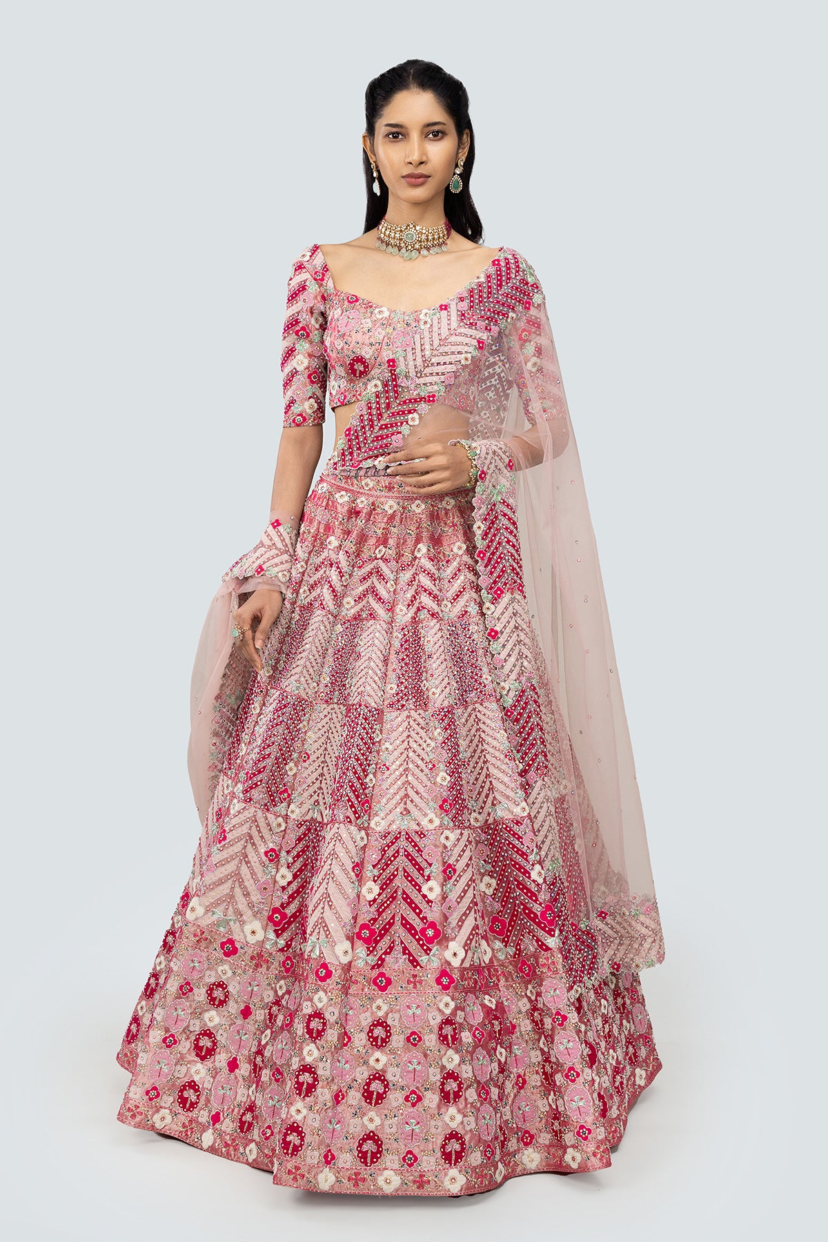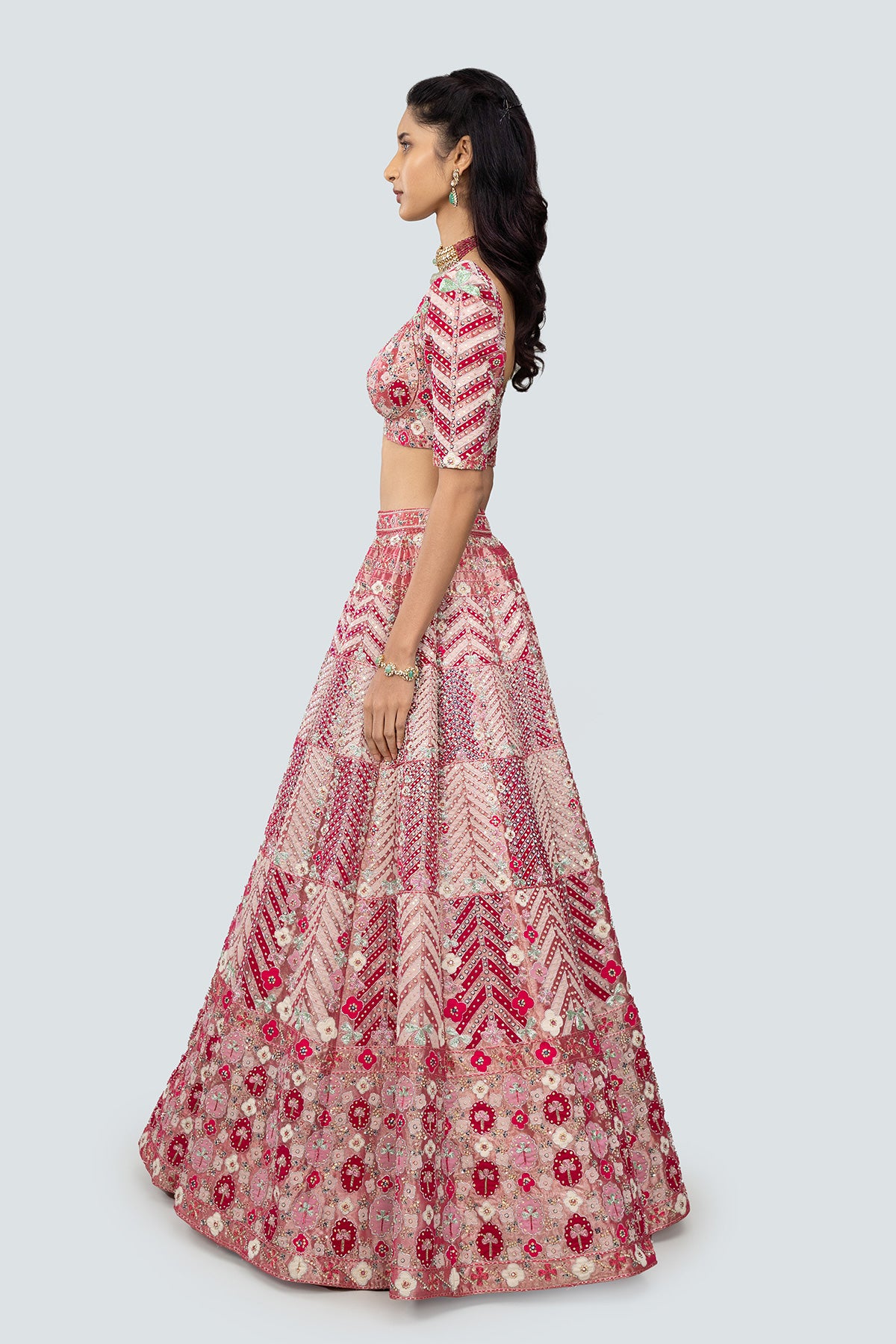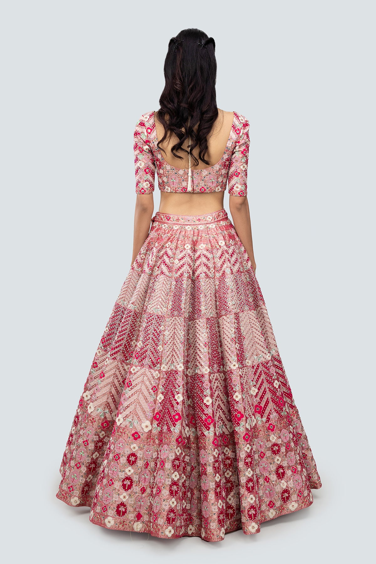 Applique and embellished heavy kali mirror work tissue lehenga with blouse and border tulle dupatta.