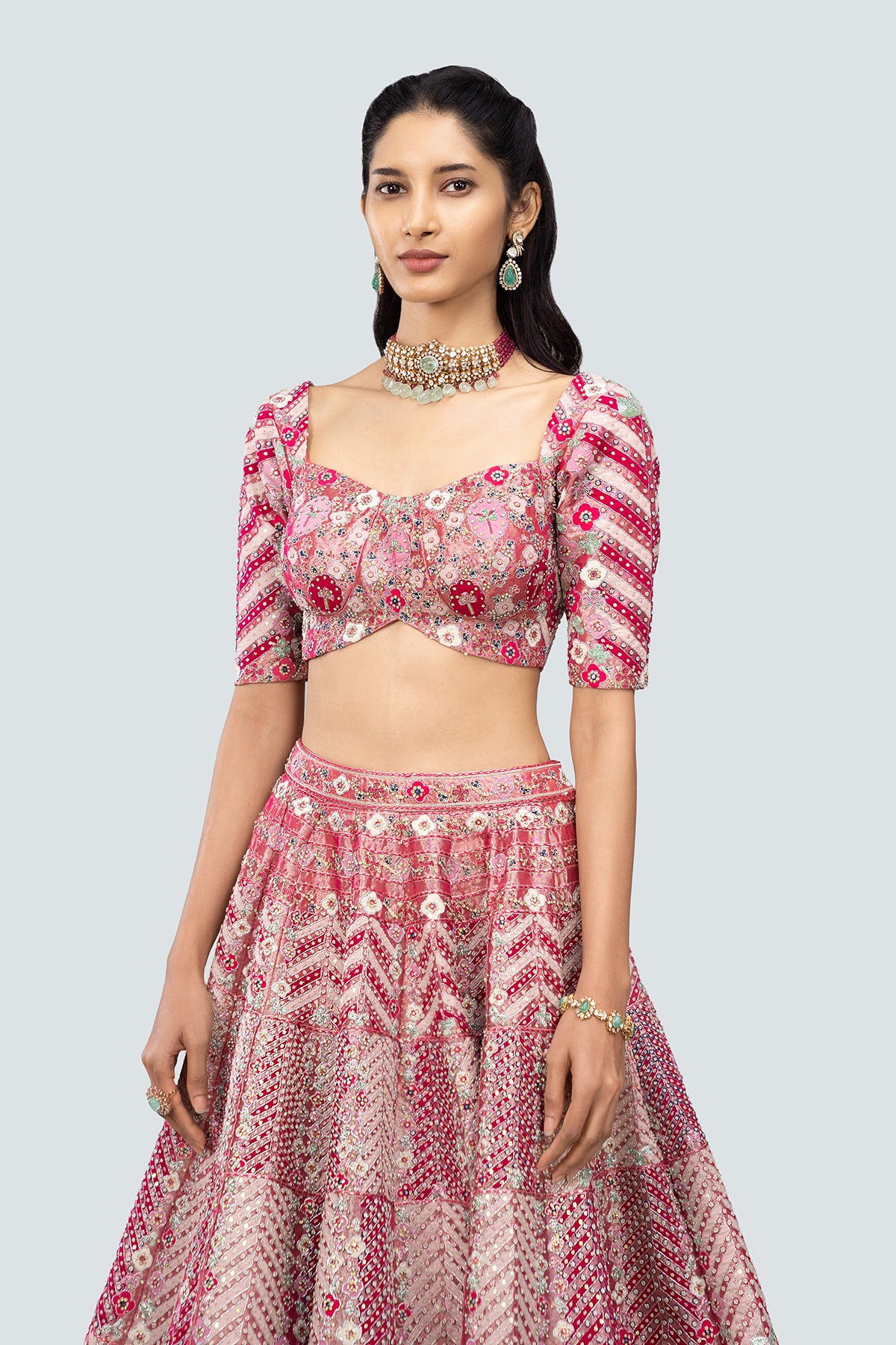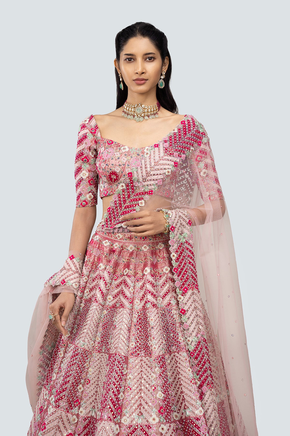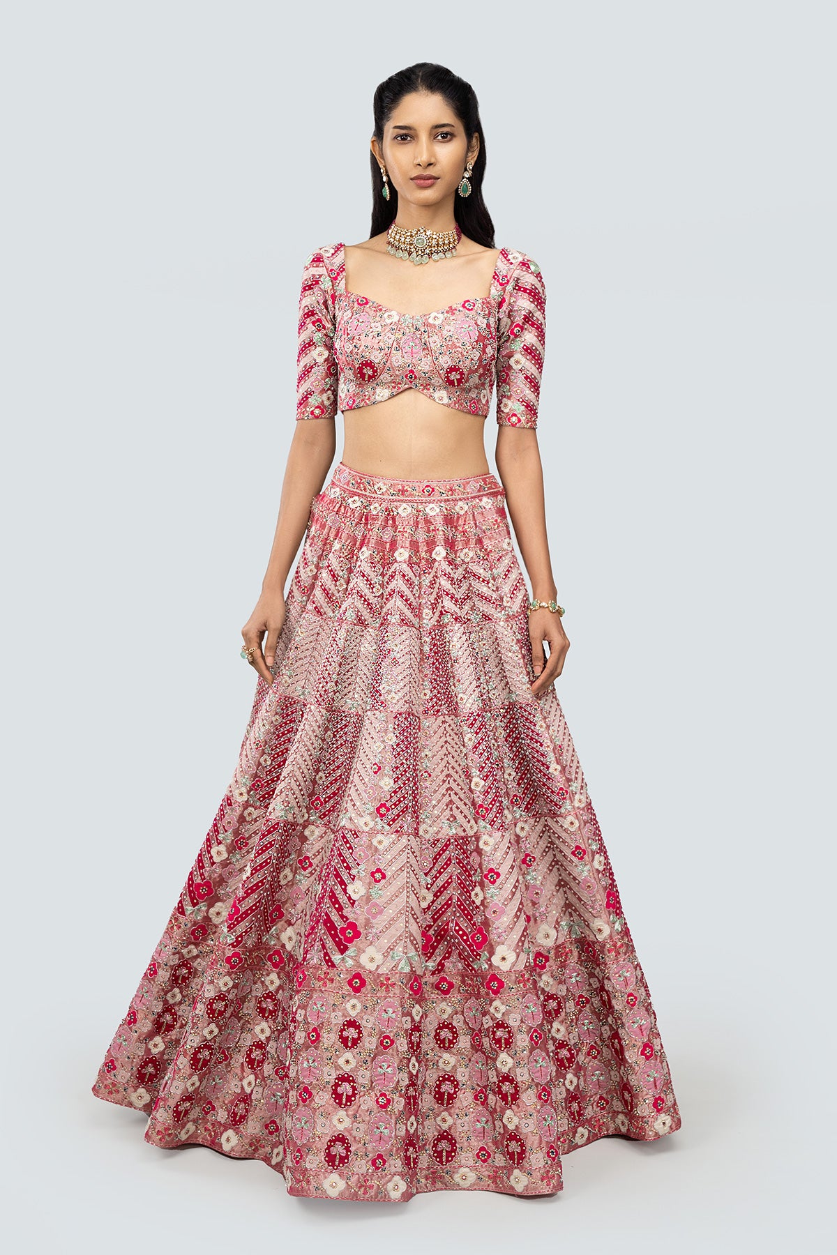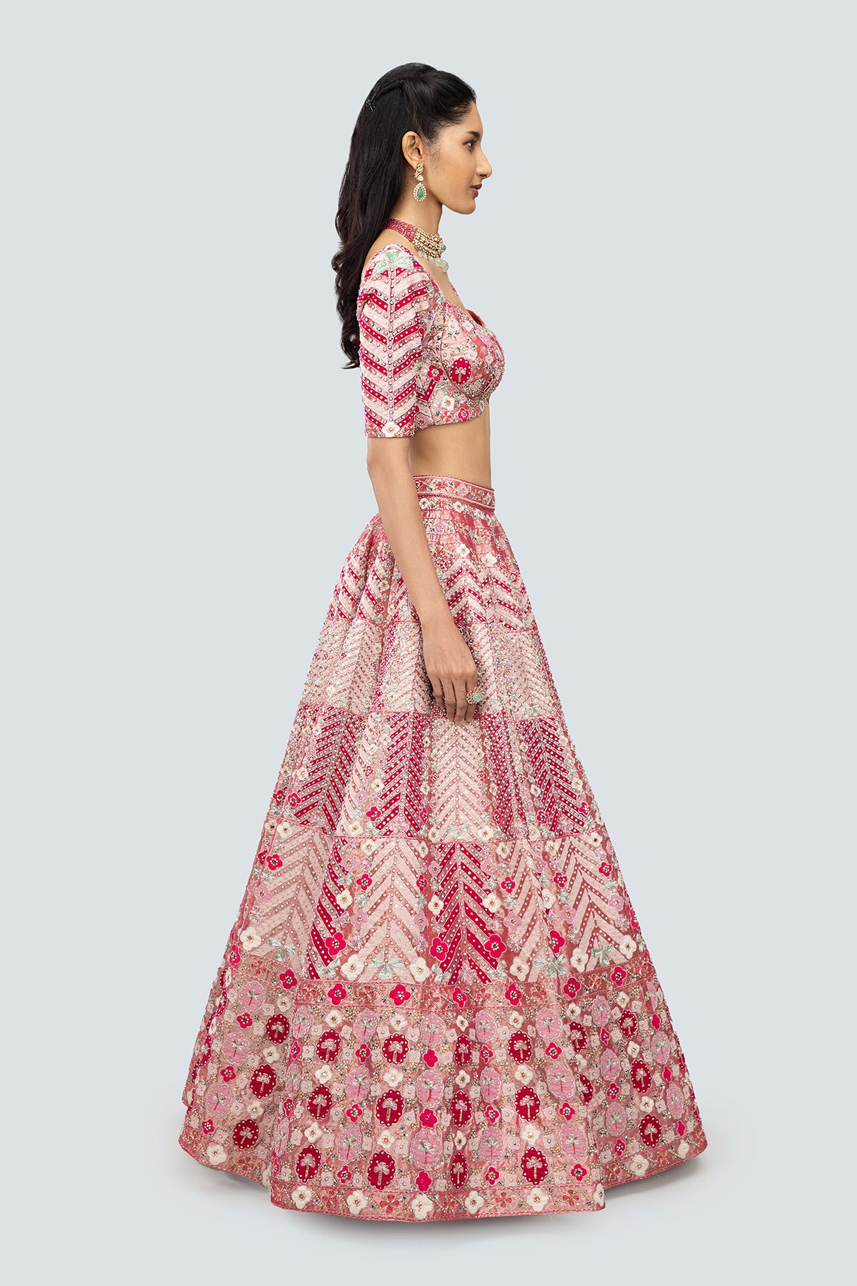 Applique and embellished heavy kali mirror work tissue lehenga with blouse and border tulle dupatta.