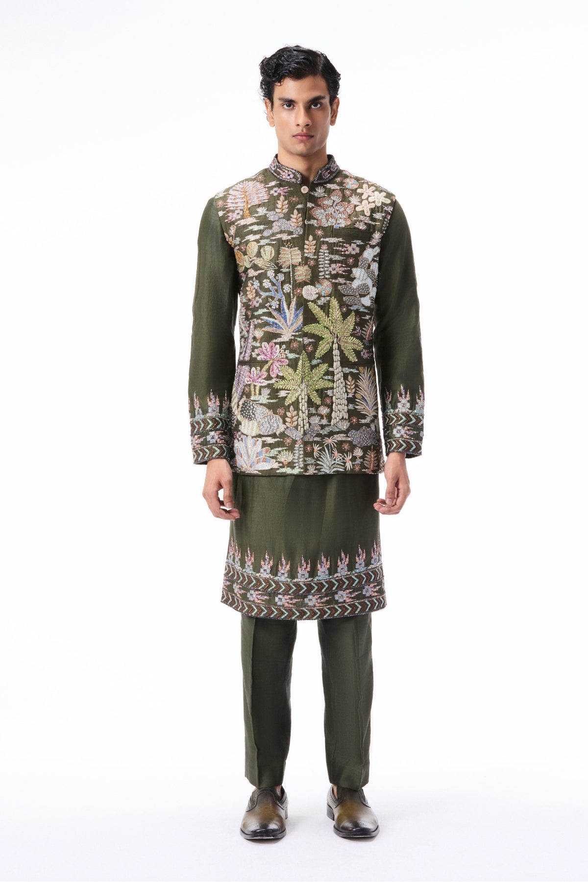 wild at heart lush green applique embellished raw silk bundi with chanderi silk kurta pants.