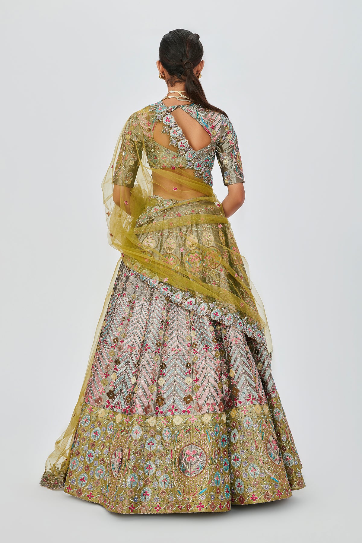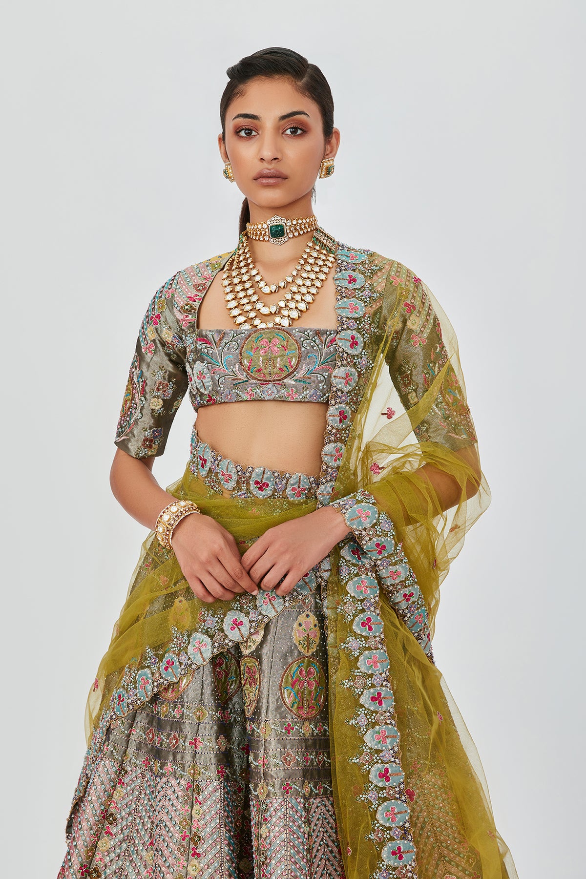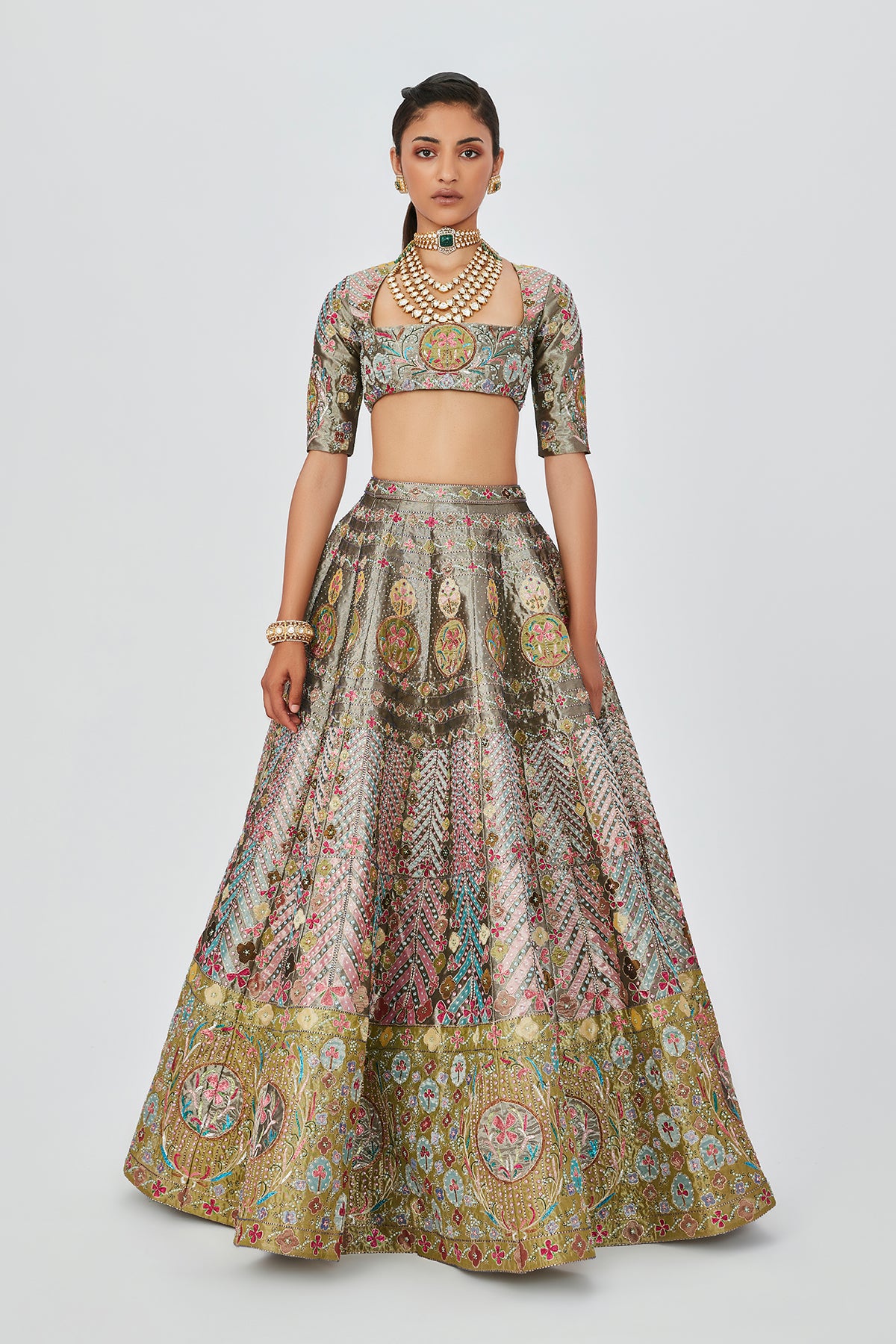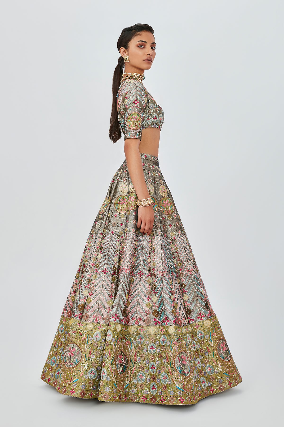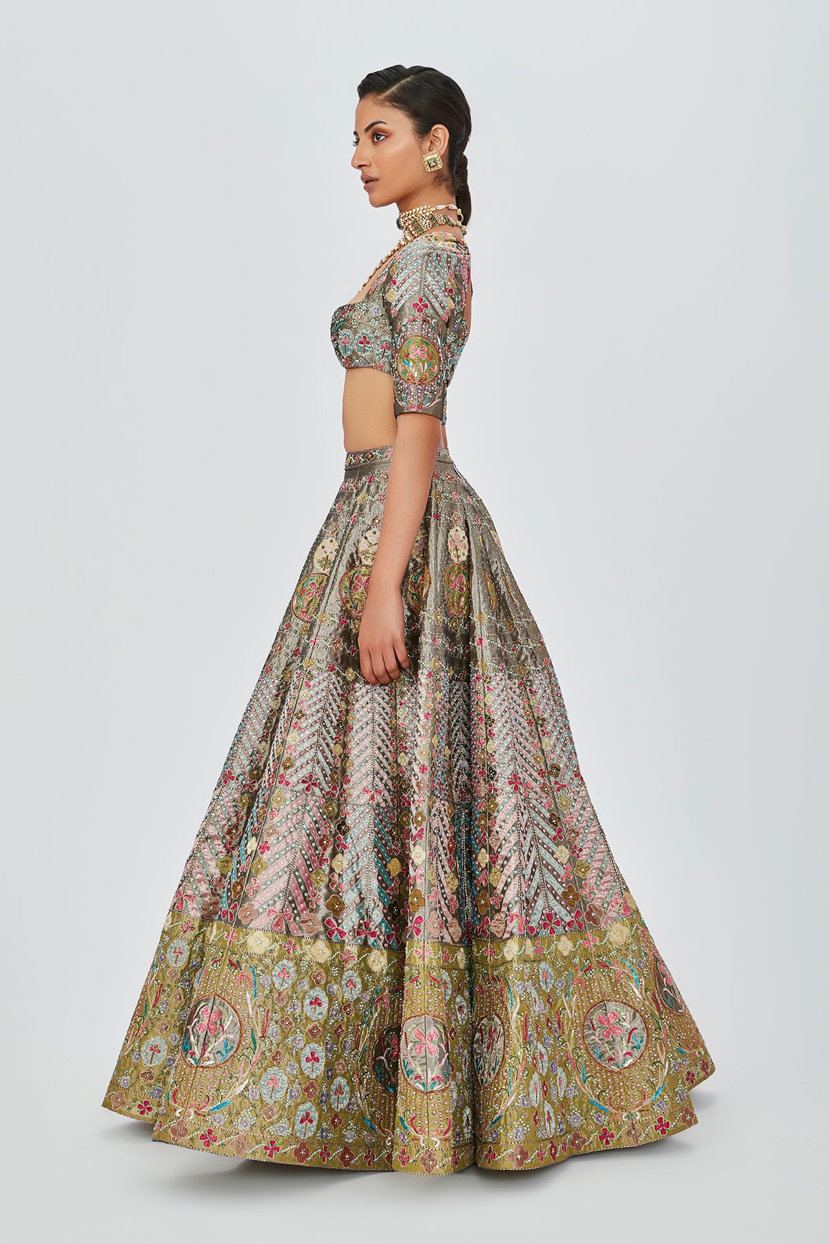 Pewter tissue with heavy embellished and appliqued lehenga with blouse and dupatta.