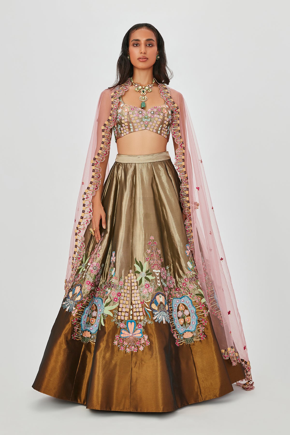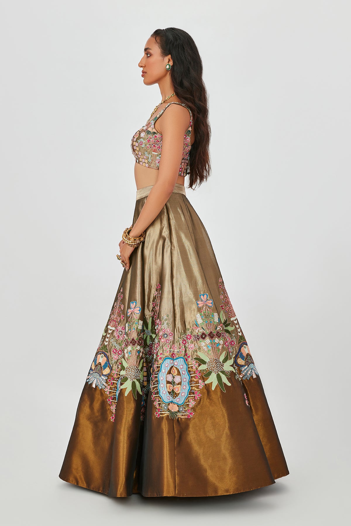 Copper - Gold Tissue appliqued and embellished MK lehenga with sleeveless blouse & scallop dupatta.