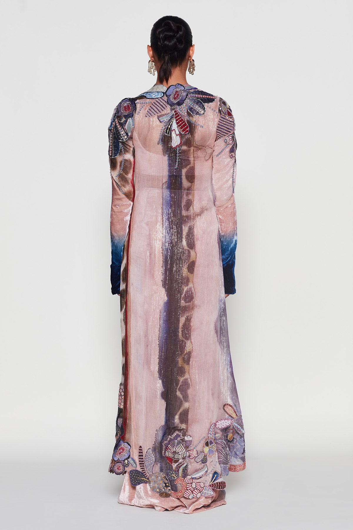 Kinfolk peach- blue printed applique embellished lurex jacket with velvet blouse and front slit skirt.