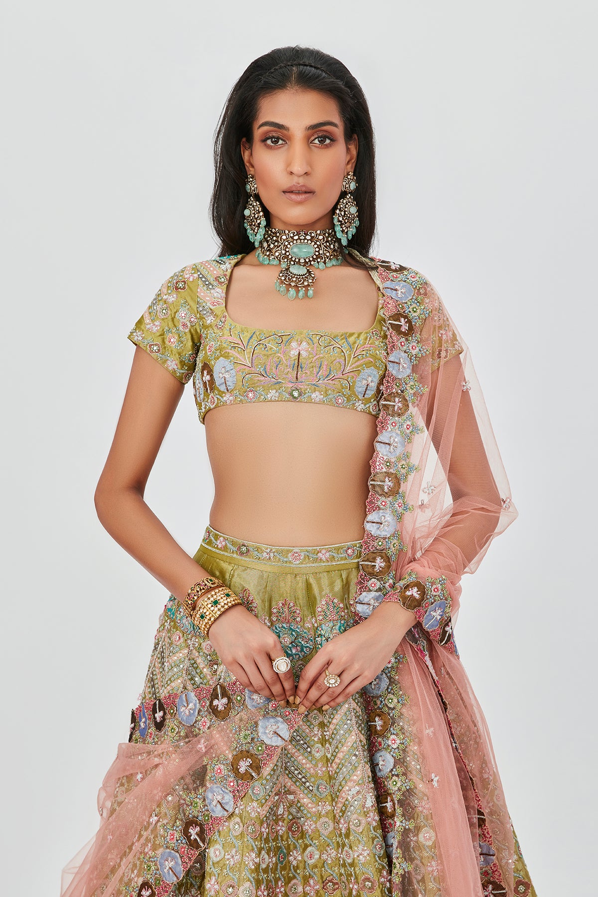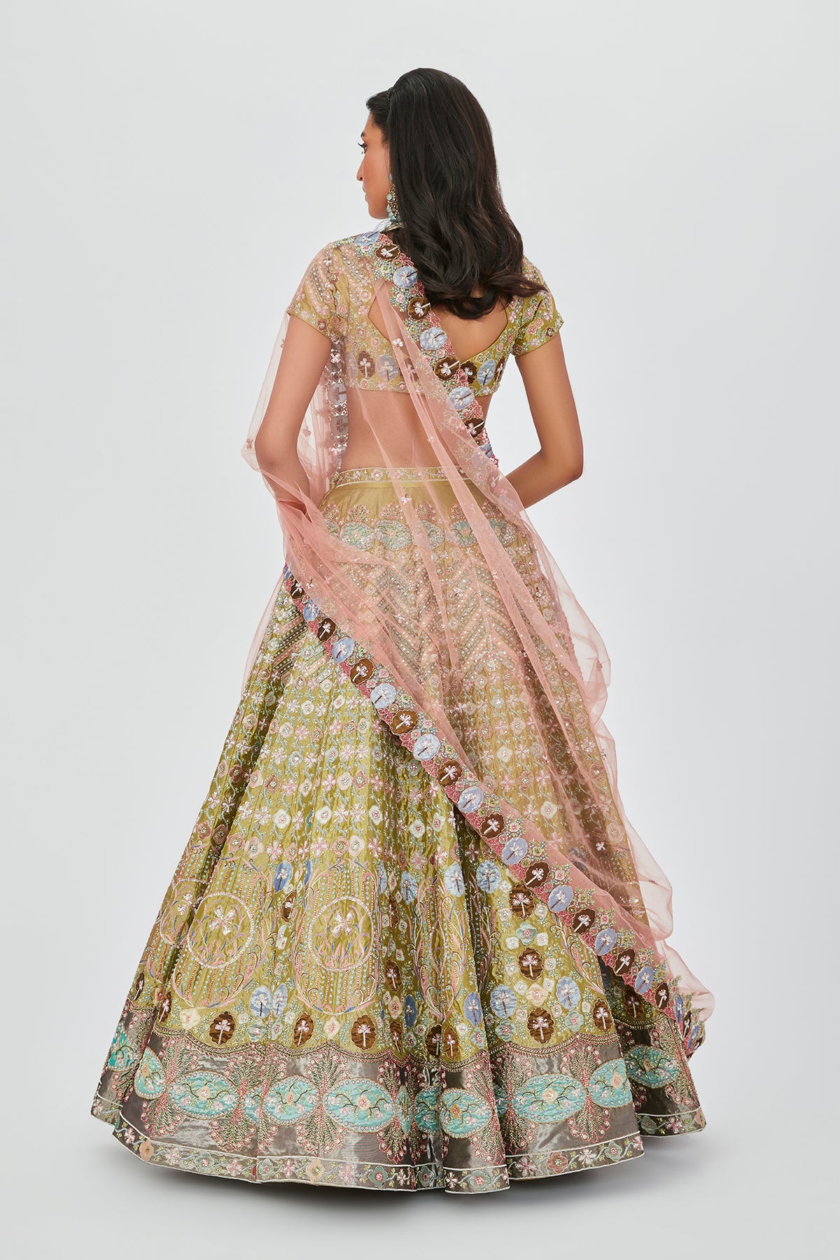 Multicoloured green heavy embellished and applique kali Tissue border lehenga with blouse & dupatta.