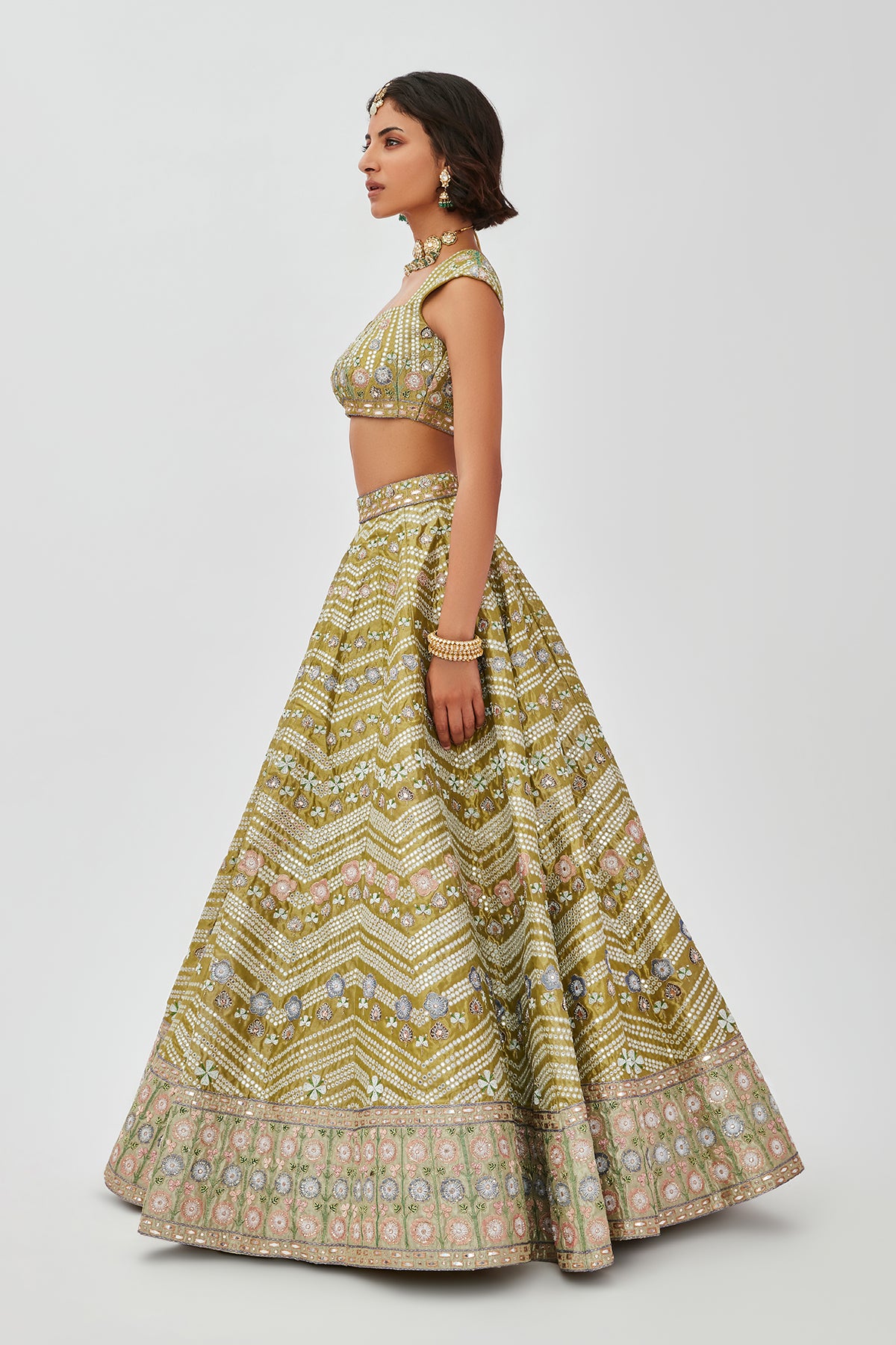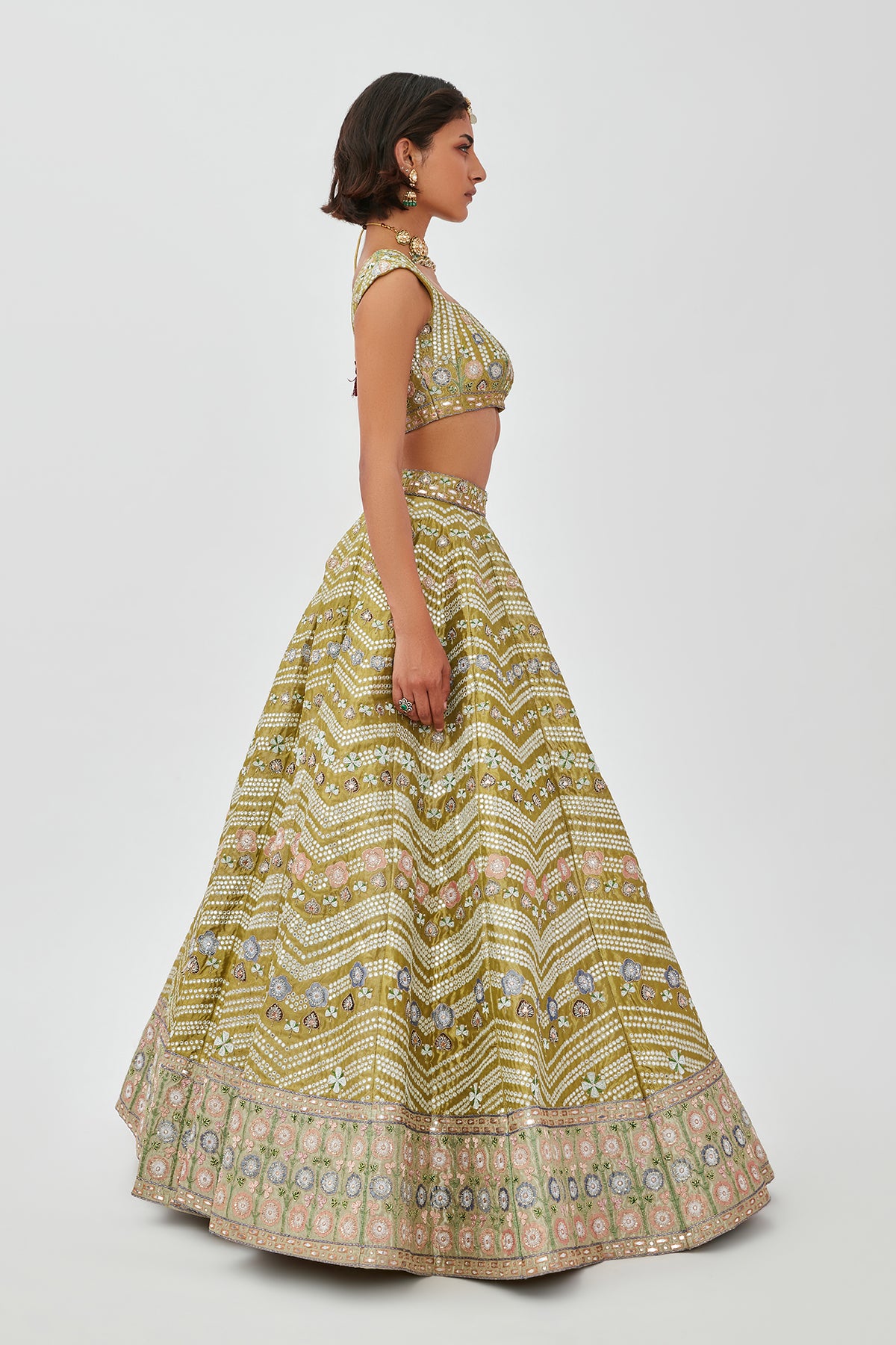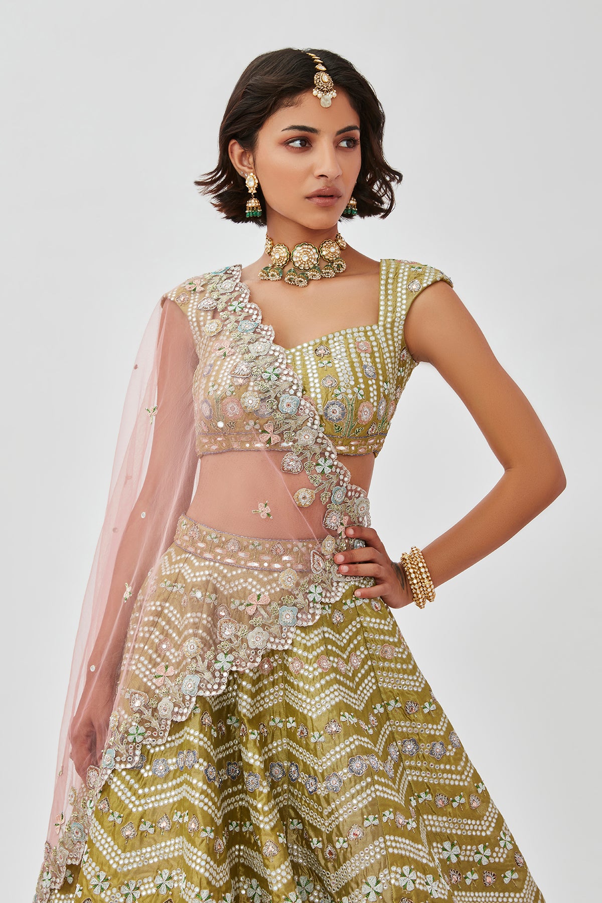 Lime Green embellished heavy kali Tissue Plastic Mirror Work lehenga with sleeveless blouse & dupatta.