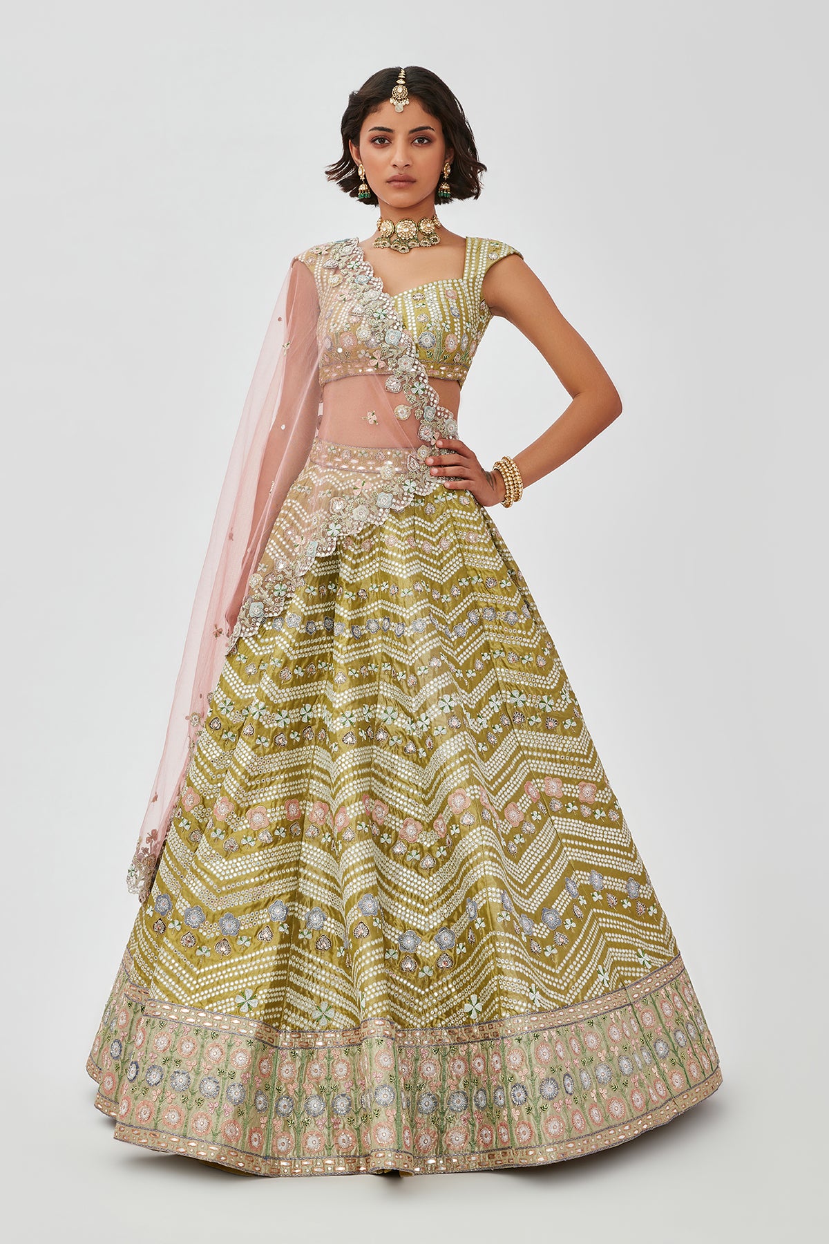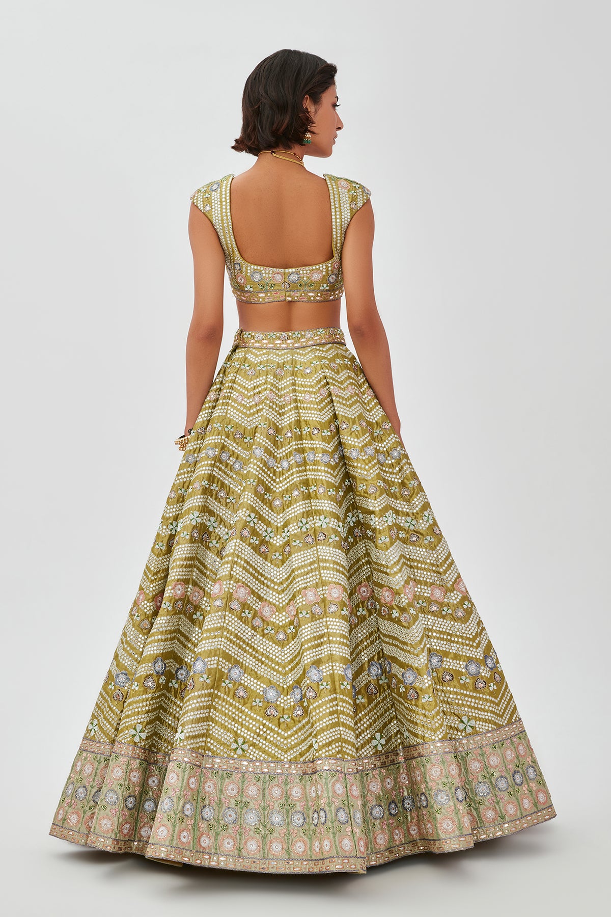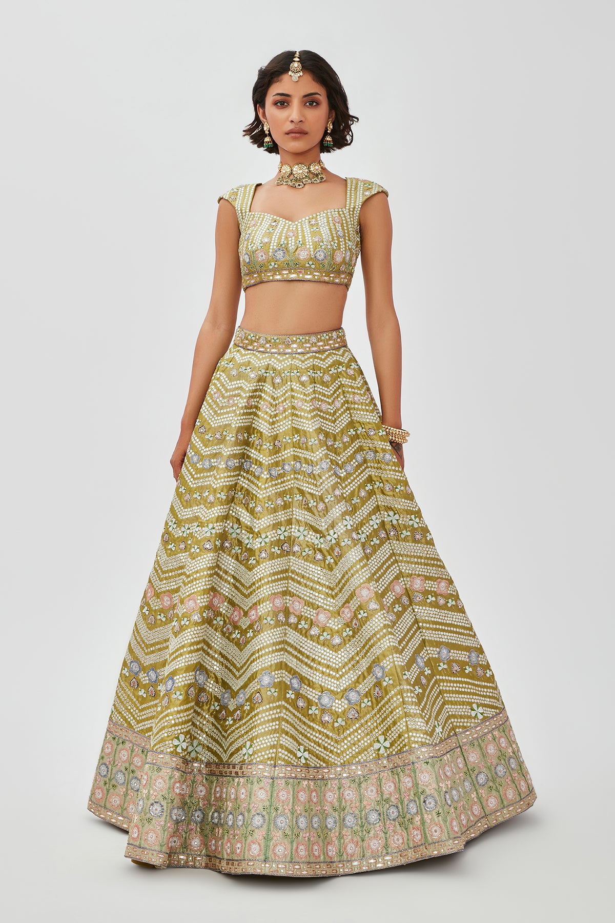 Lime Green embellished heavy kali Tissue Plastic Mirror Work lehenga with sleeveless blouse & dupatta.