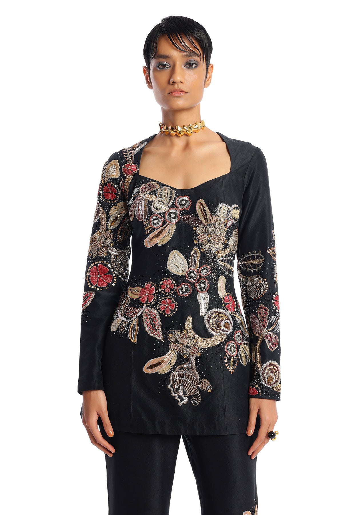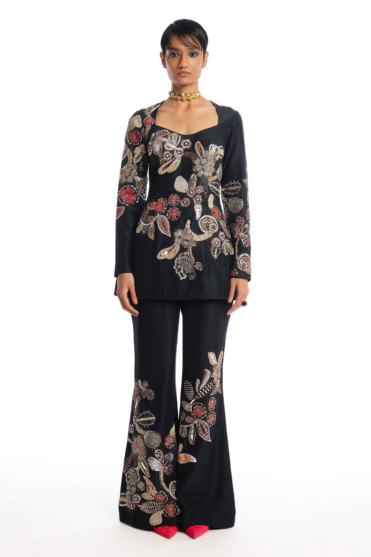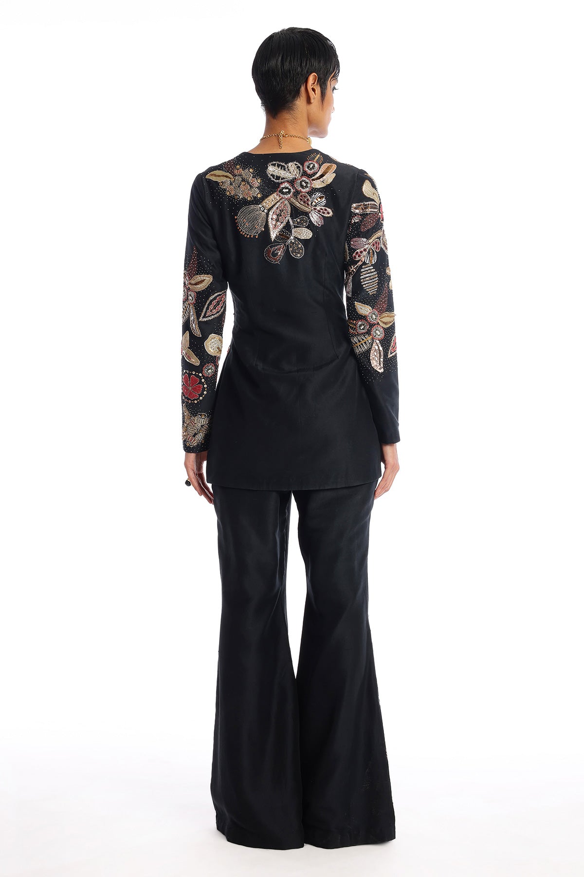 Kinfolk black applique embellished chanderi silk tunic-pant set