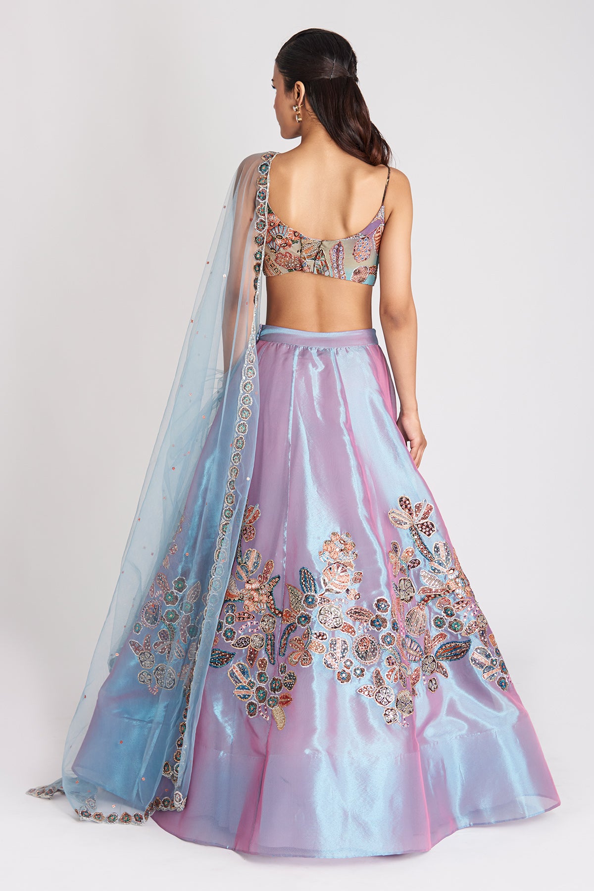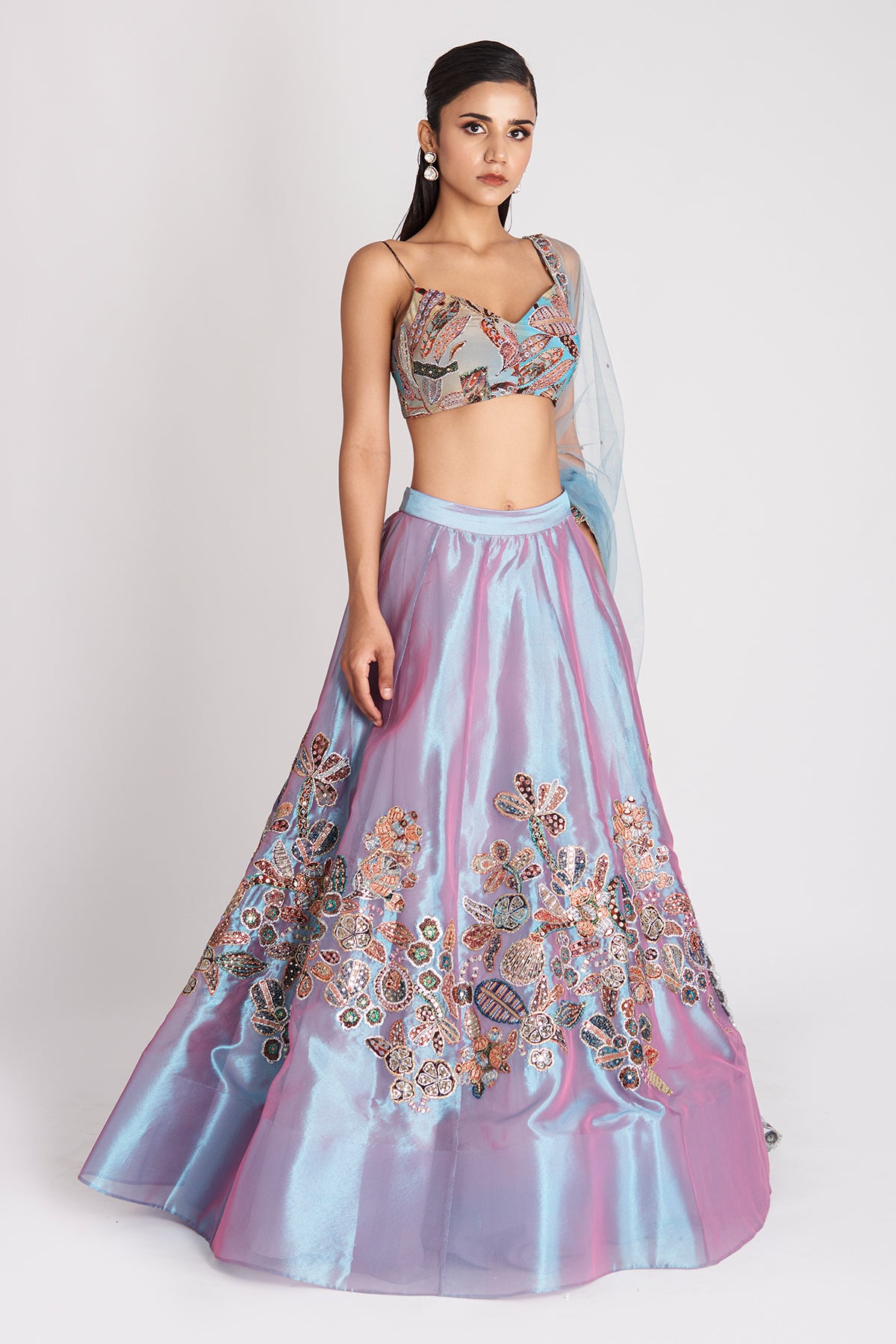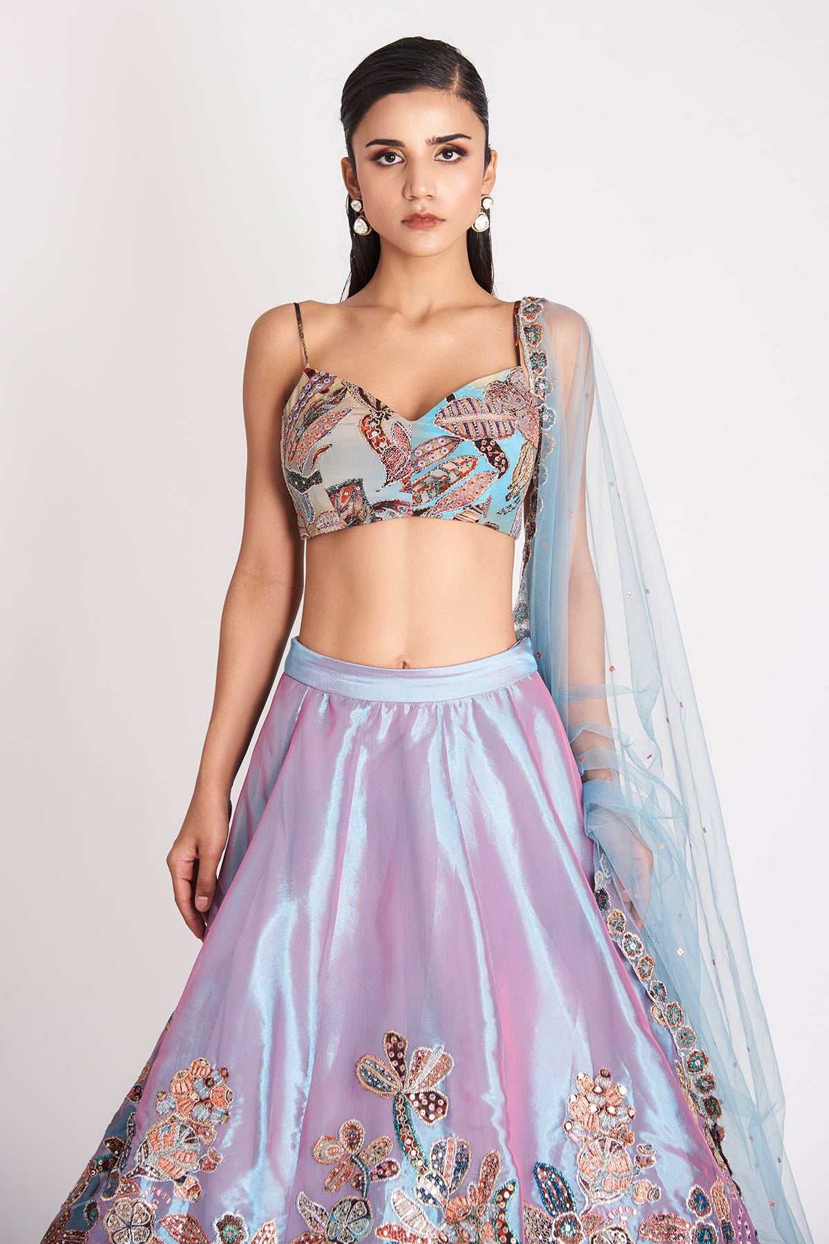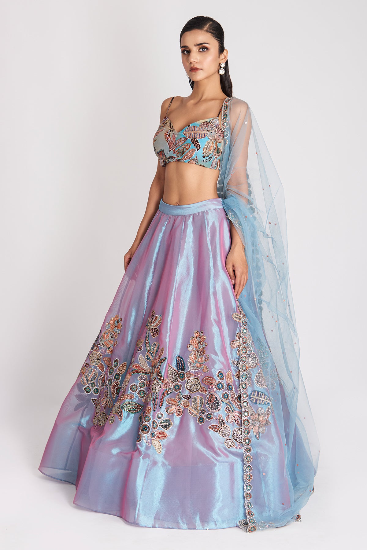 Kinfolk wisteria blue applique embellished tissue mk lehenga, blouse & tulle dupatta