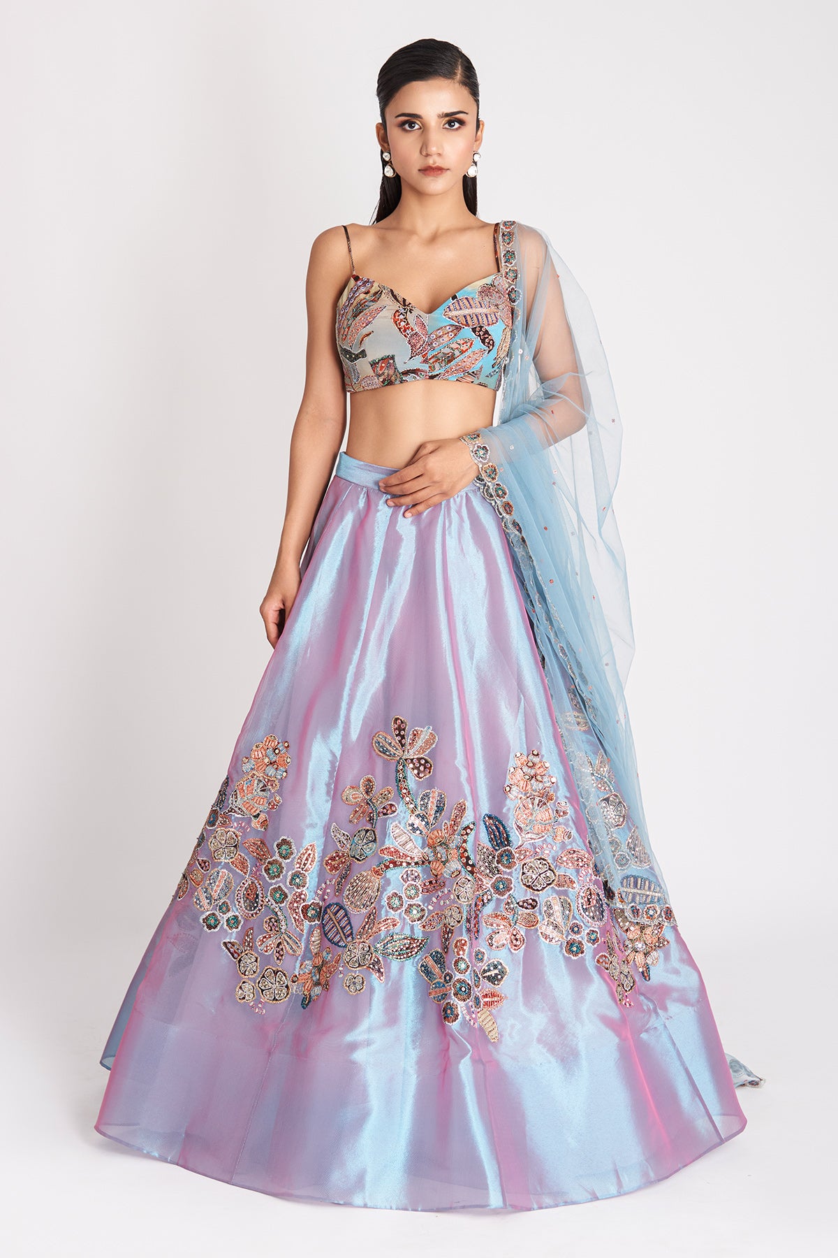Front view of Kinfolk wisteria blue tissue MK lehenga set