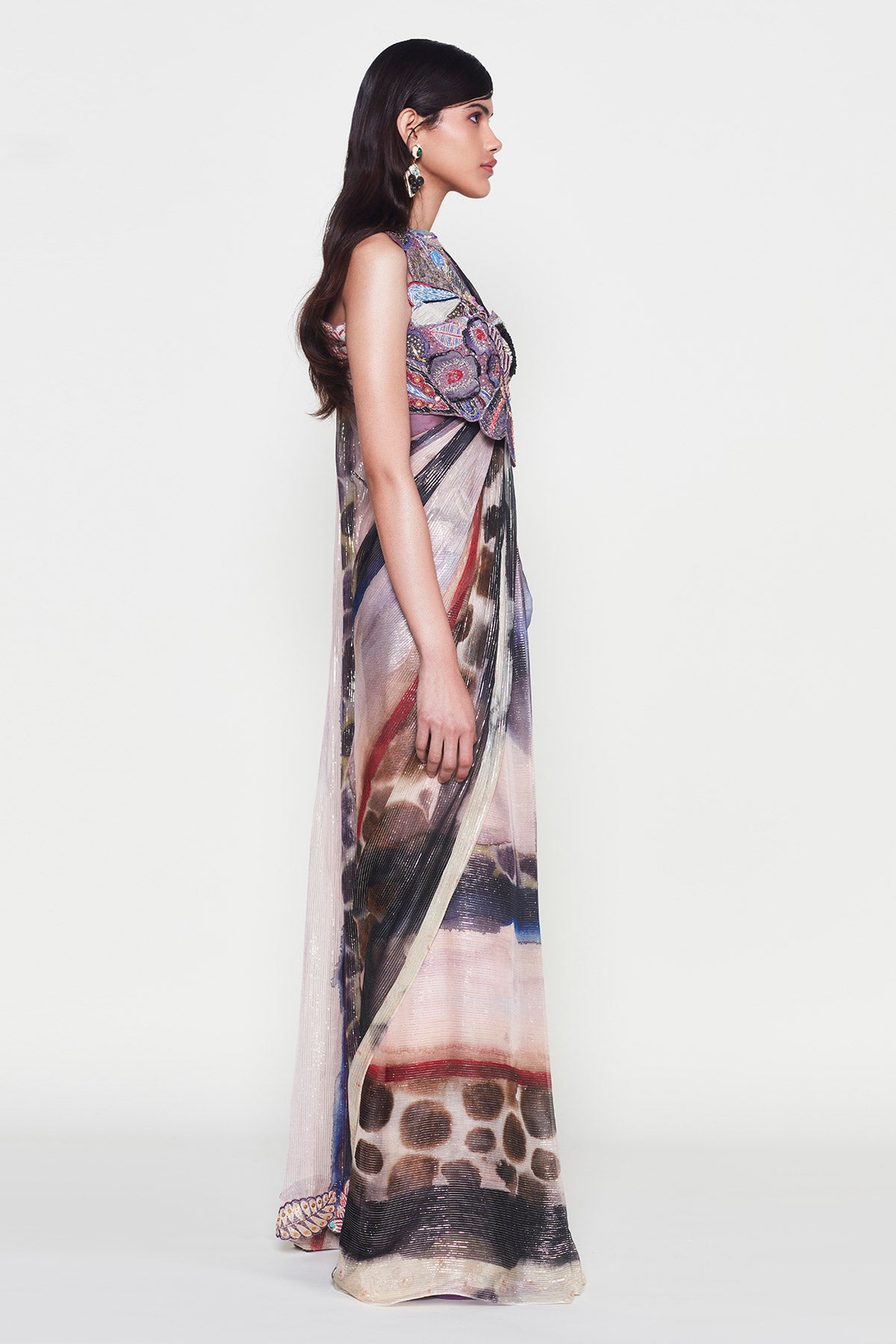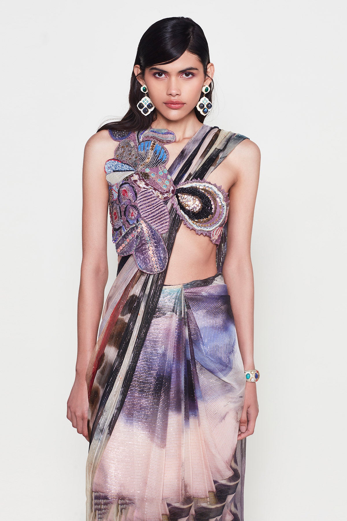 Kinfolk mist purple applique embellished lurex pre draped saree with cutwork blouse