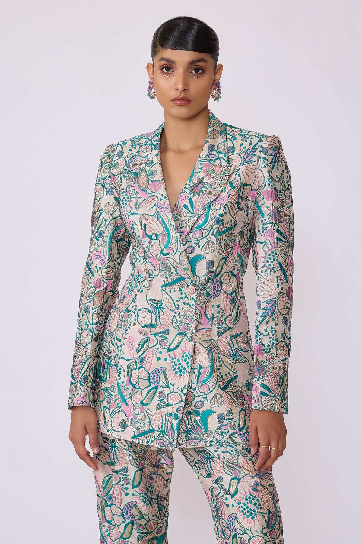 Woman wearing Kinfolk pink-green jacquard pantsuit