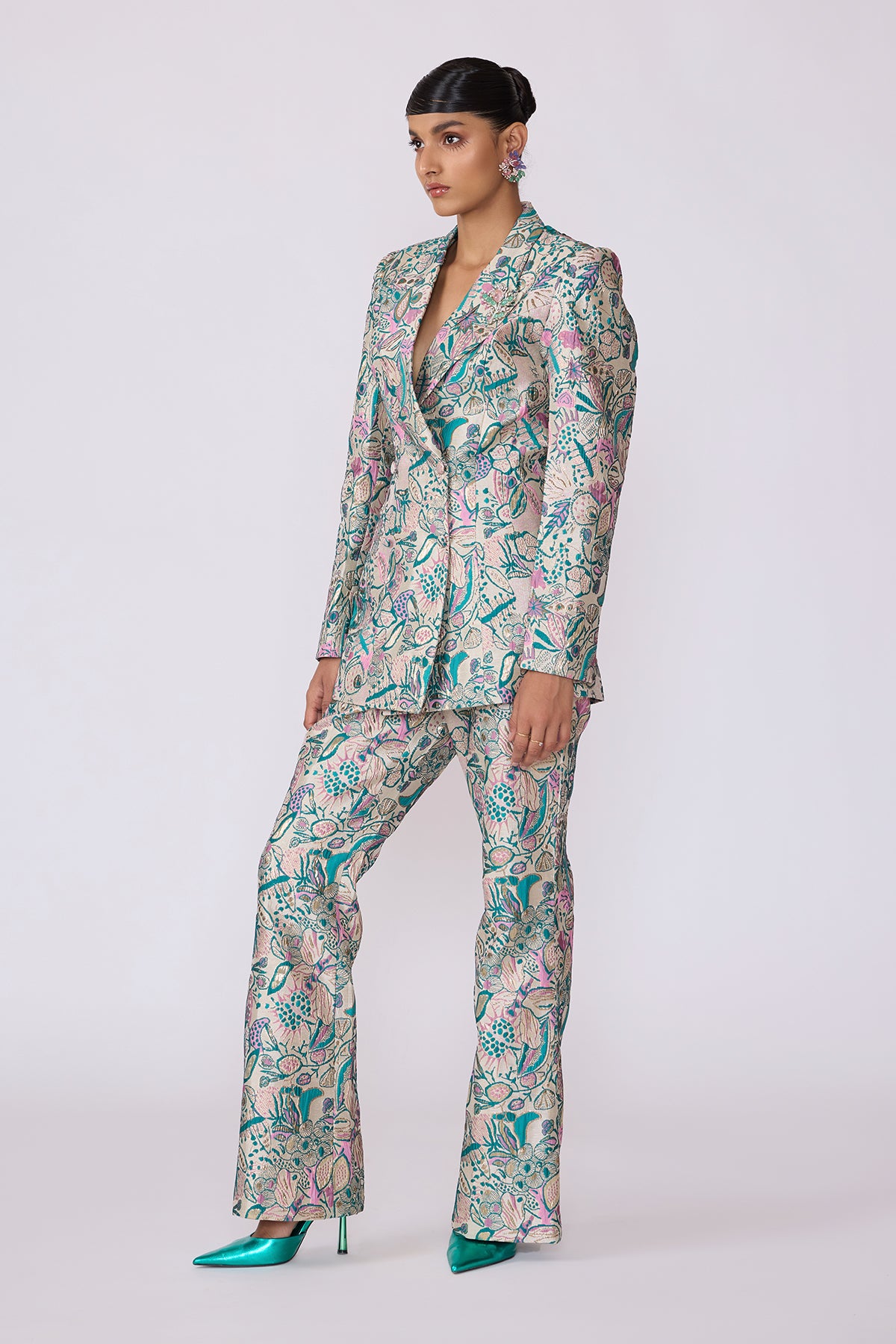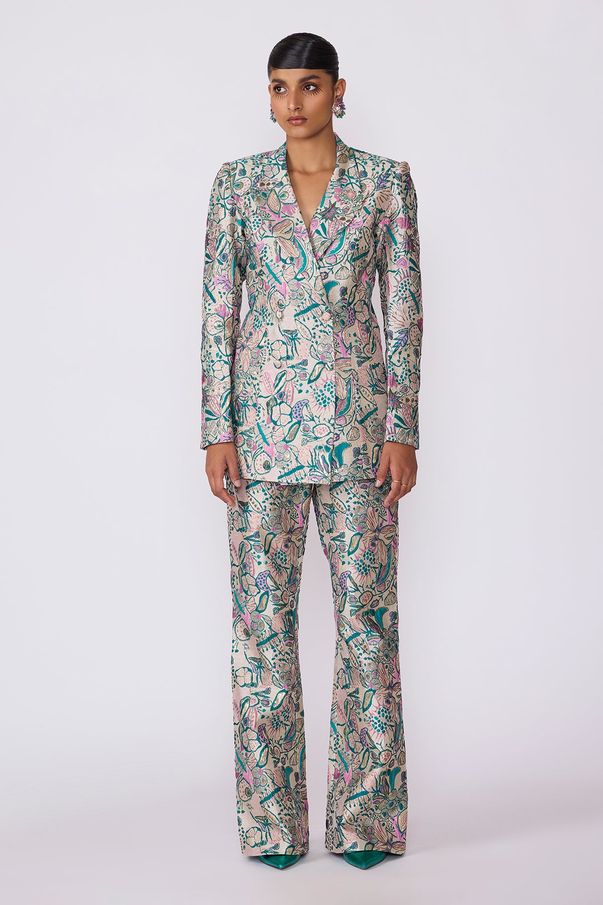 Kinfolk pink-green pantsuit with jacquard fabric design