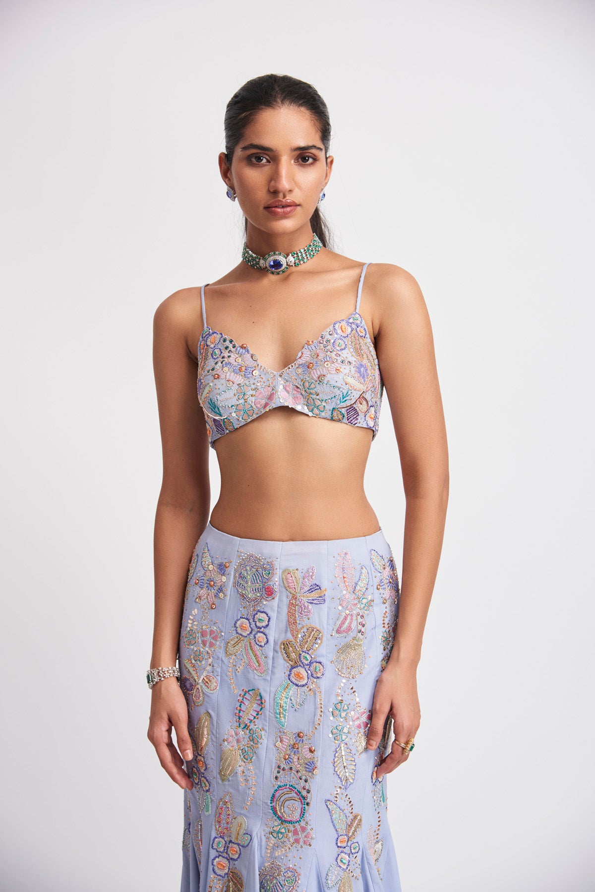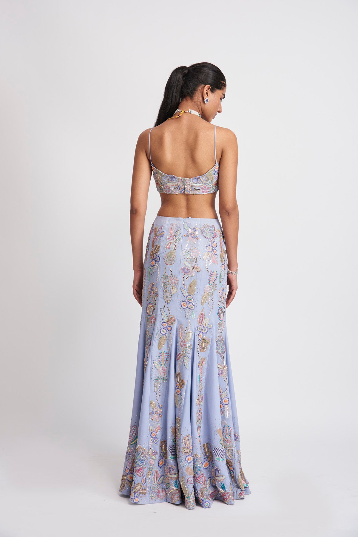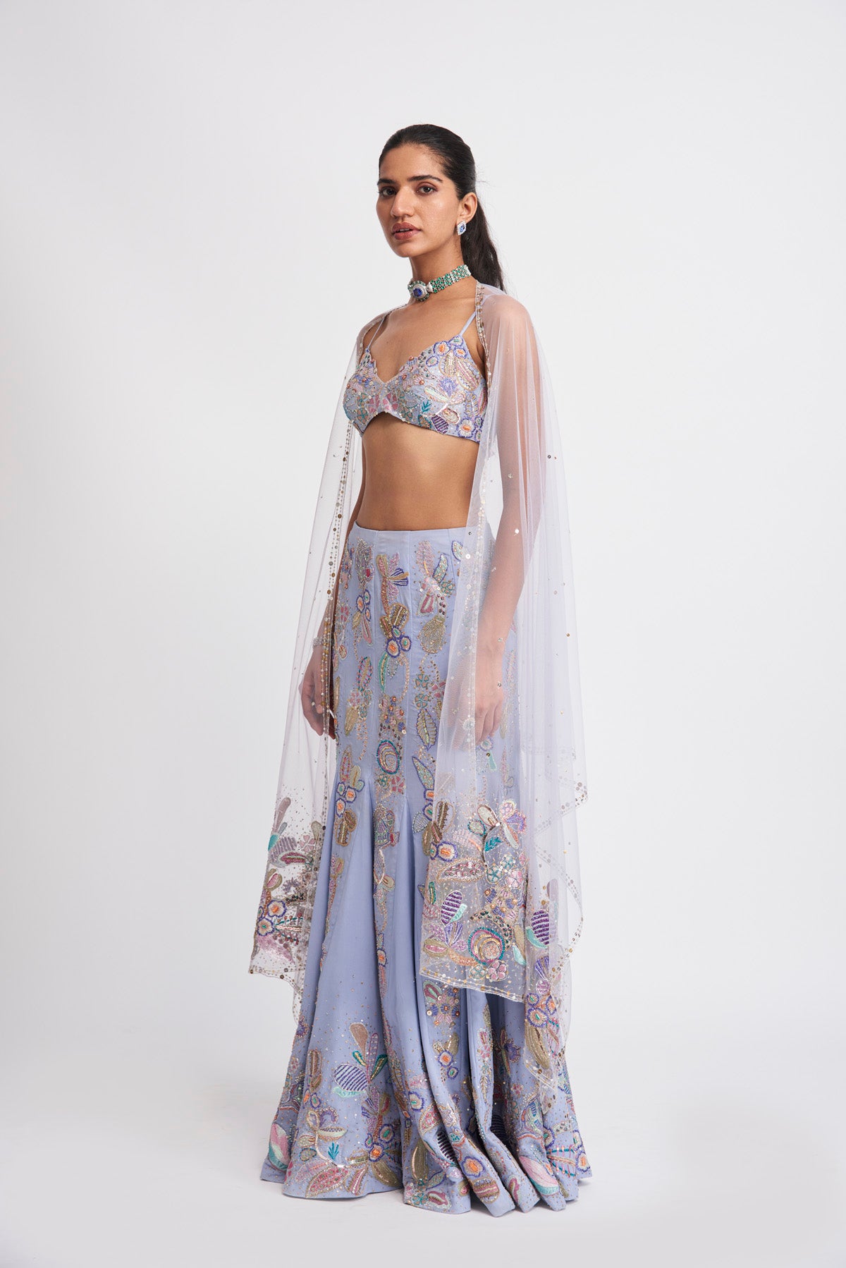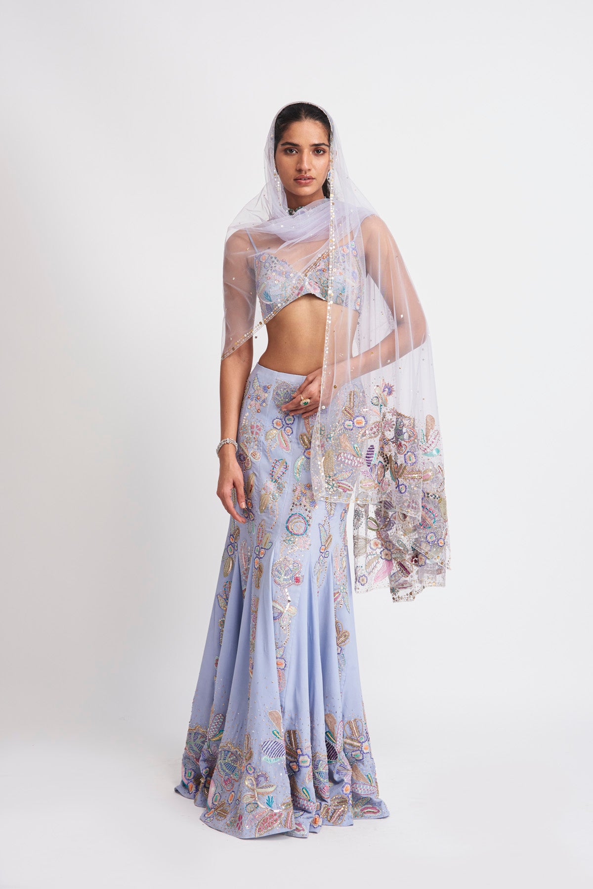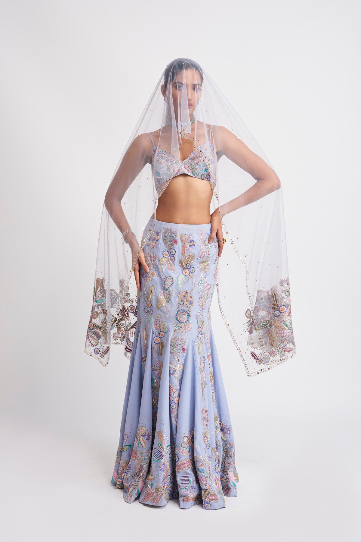 Kinfolk livid blue applique embellished georgette mermaid skirt, bustier & dupatta