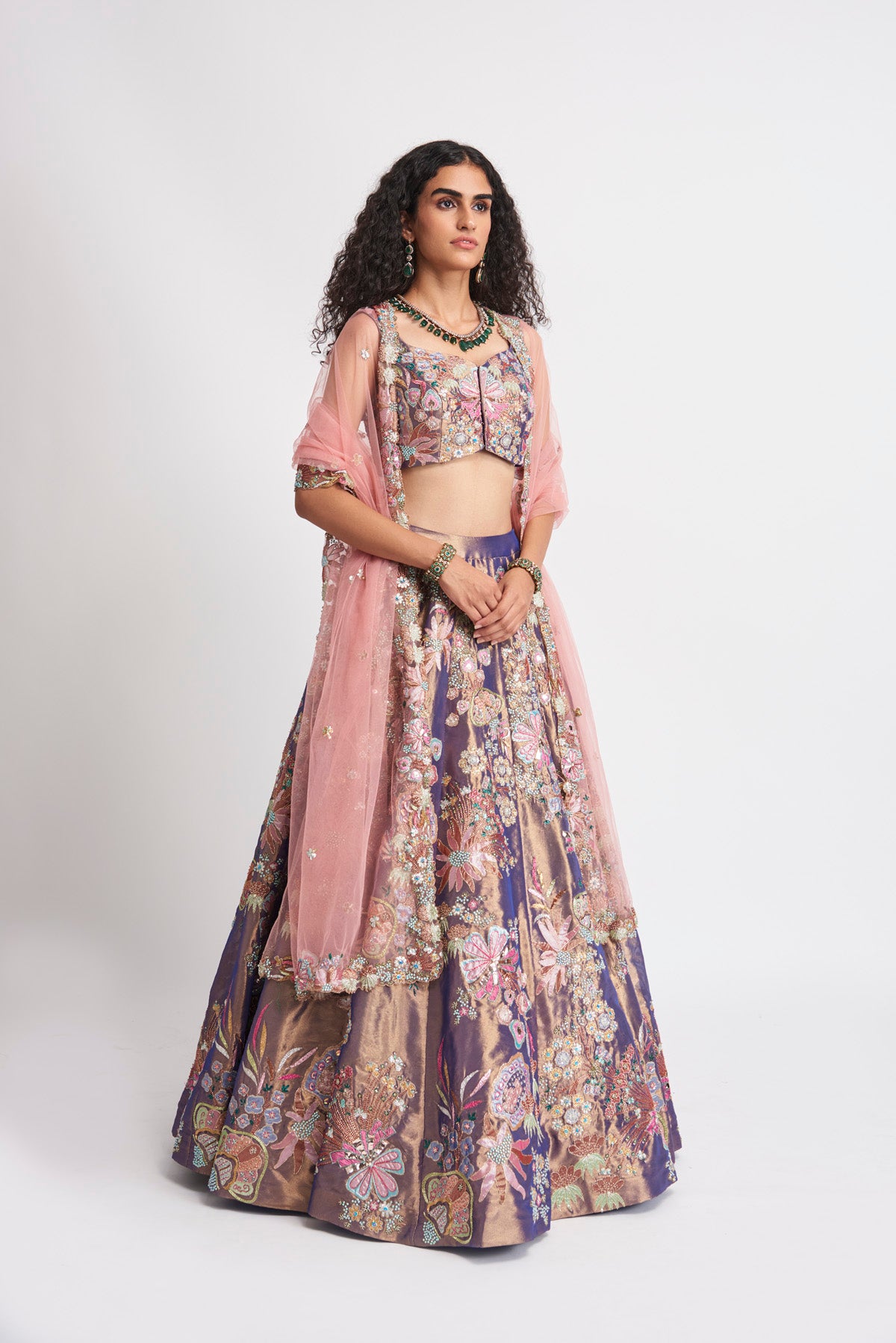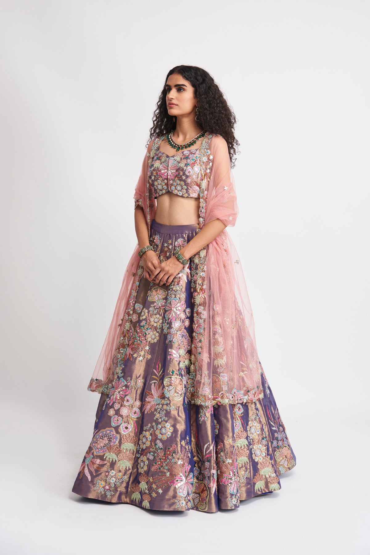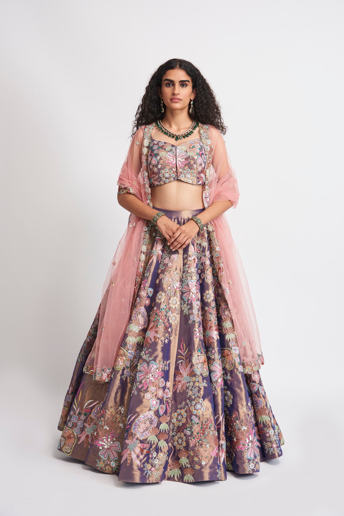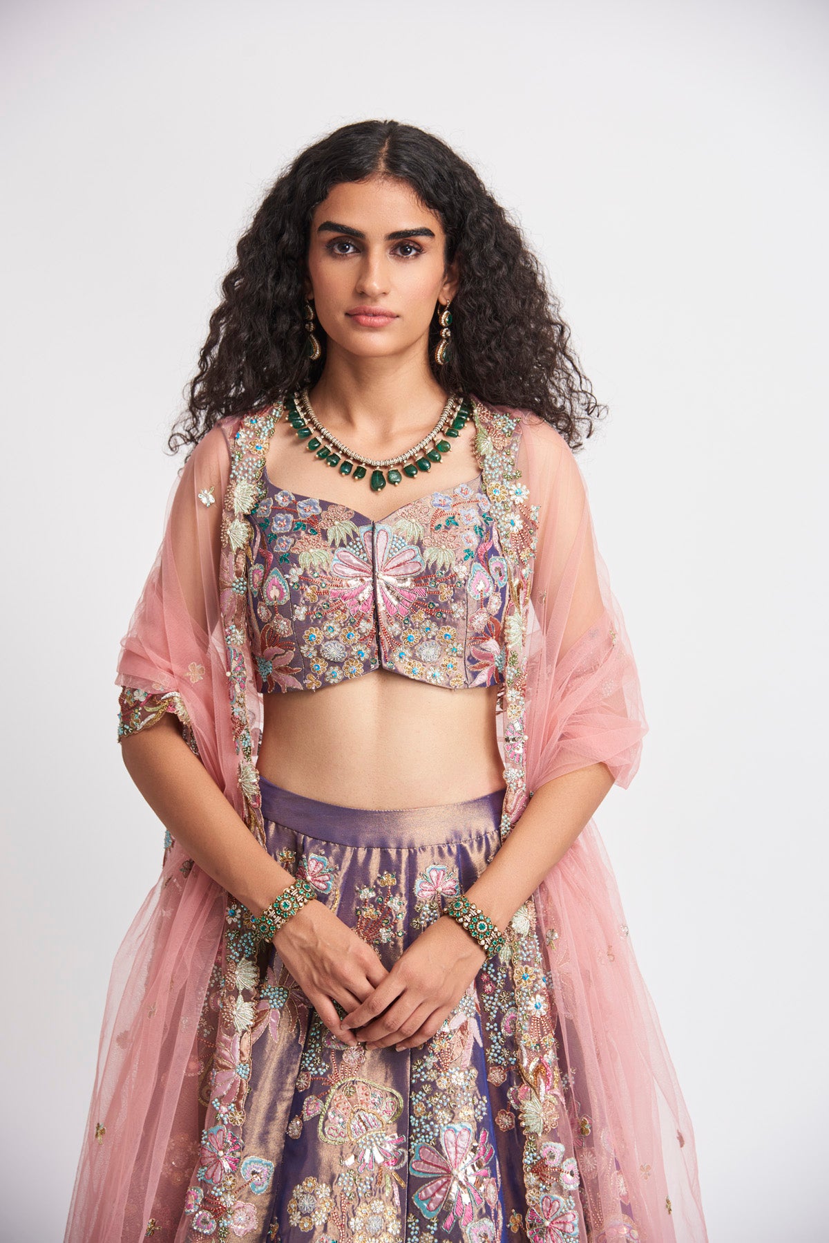 Banafsh Plum applique embellished tissue lehenga, blouse & tulle dupatta.