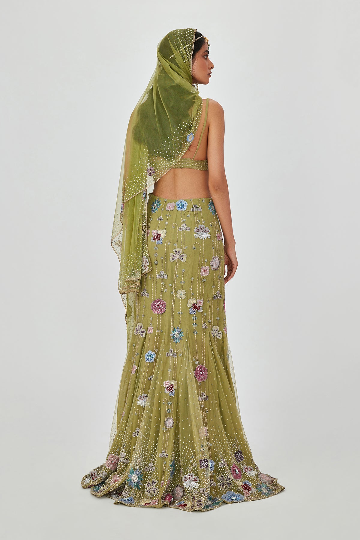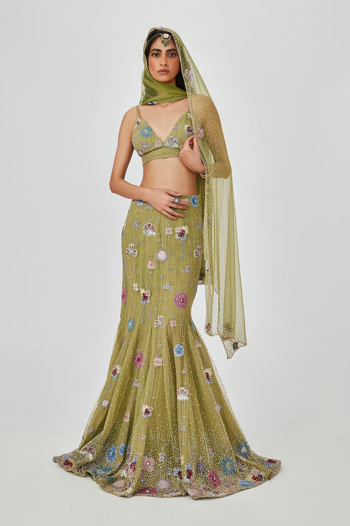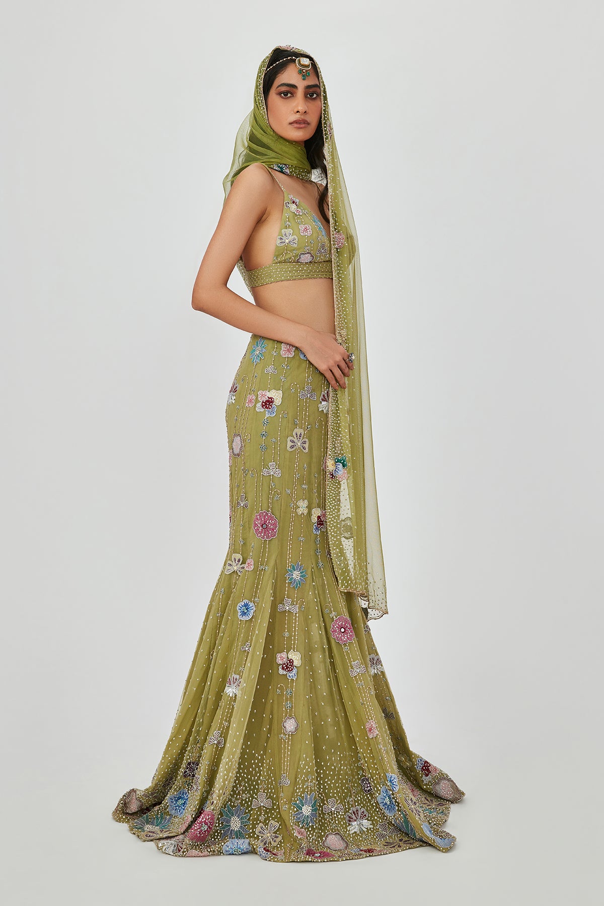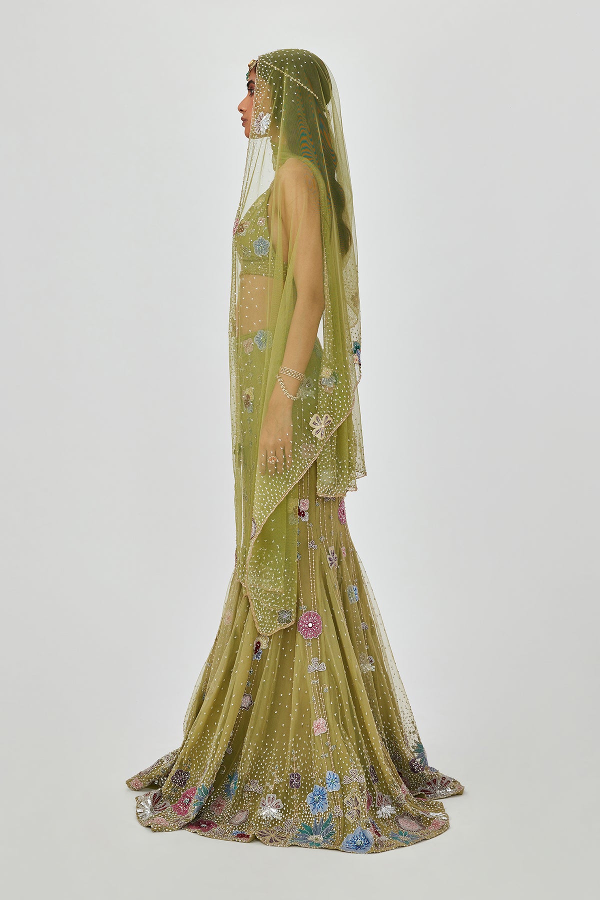 Olive tulle mermaid skirt and bustier embellished, appliqued, and mirror-worked.