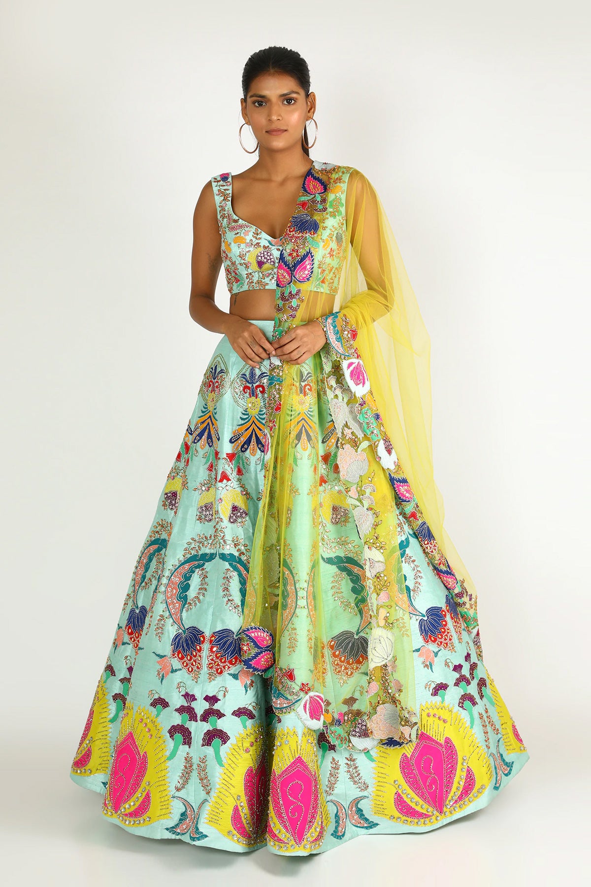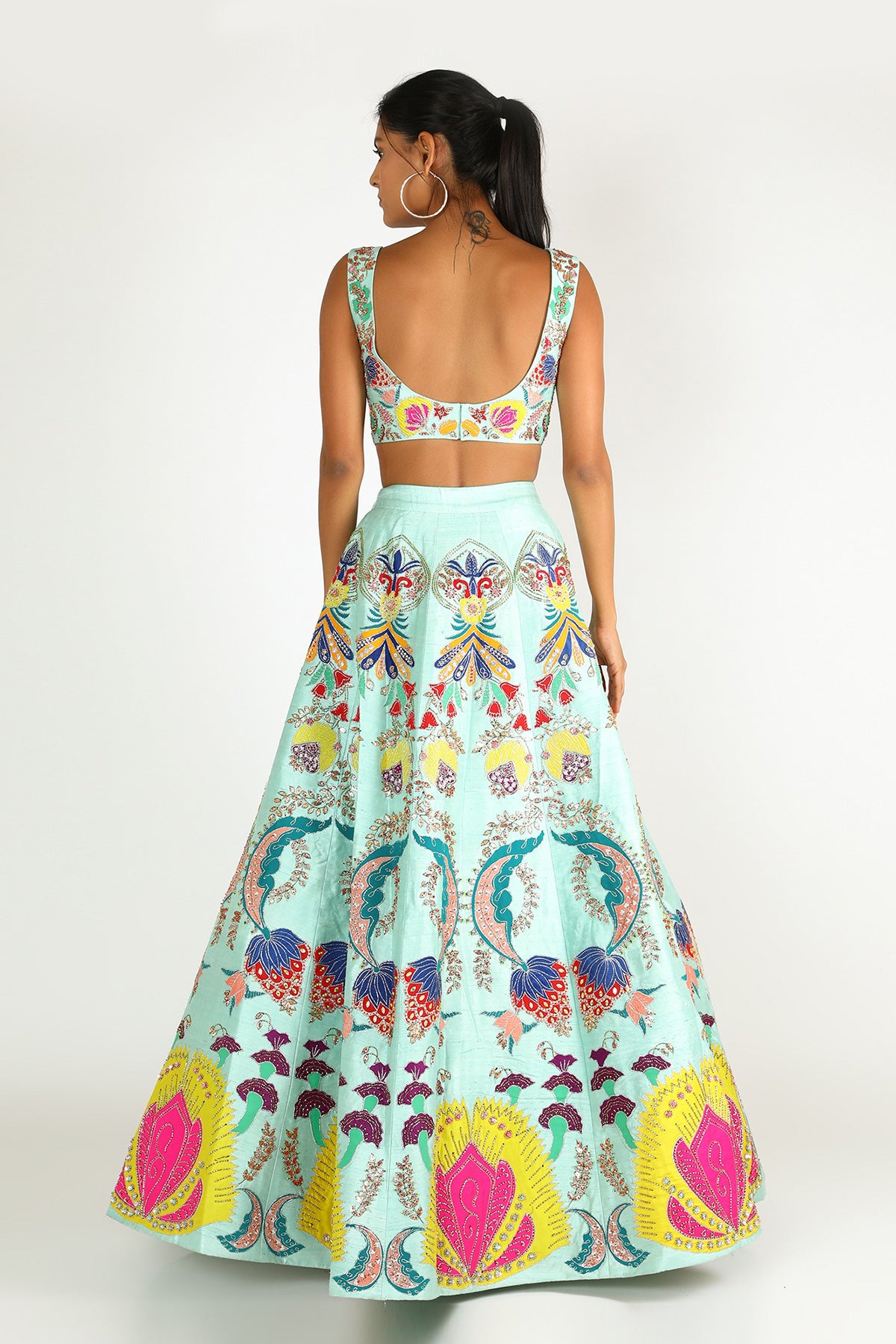 Scuba blue nadenka raw silk appliquéd and embellished lehenga with blouse and cutwork tulle dupatta