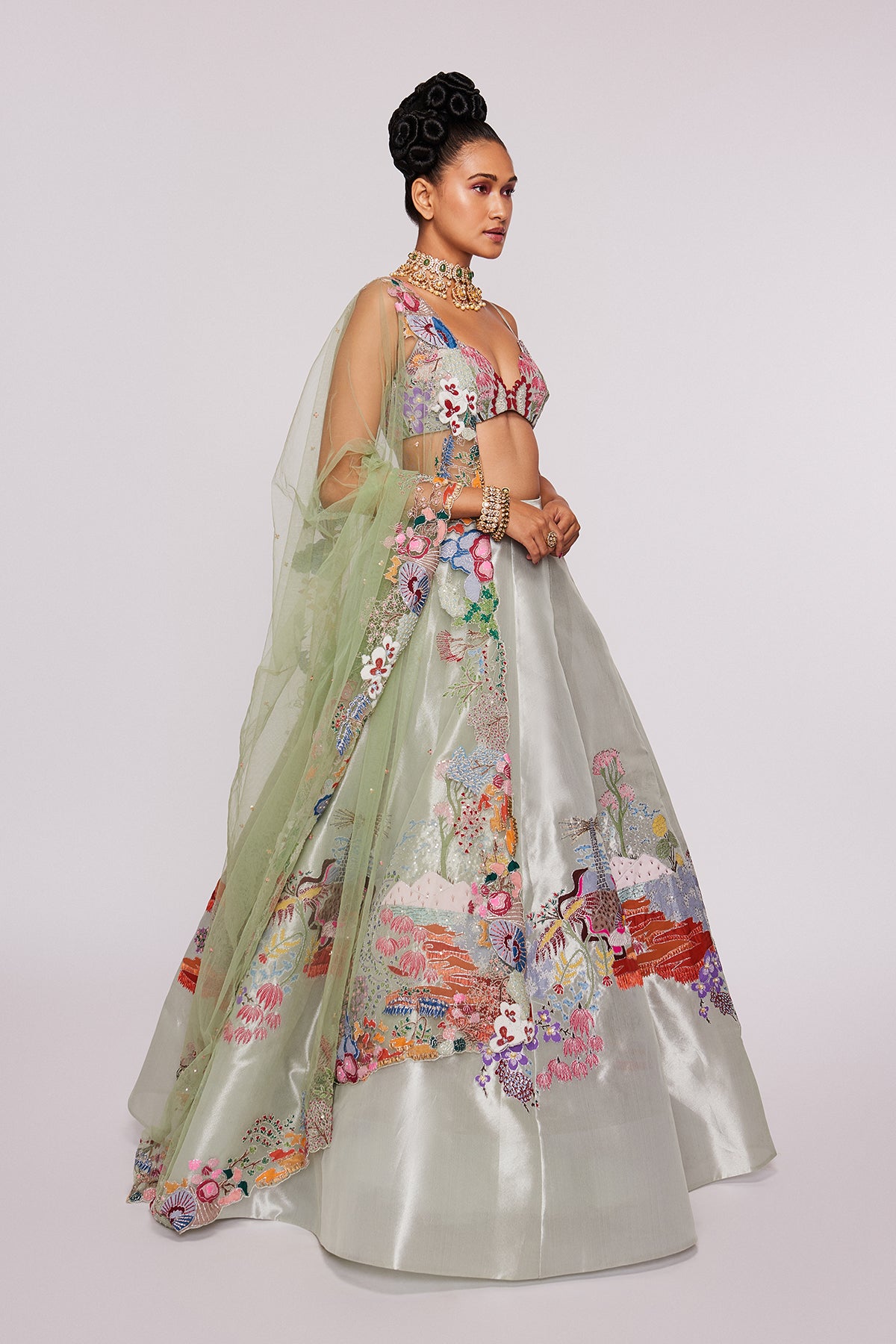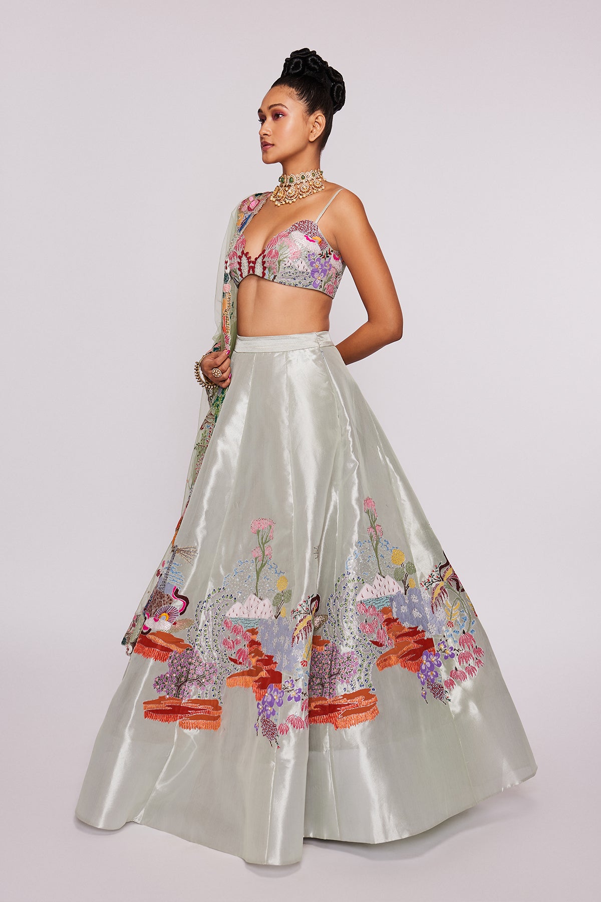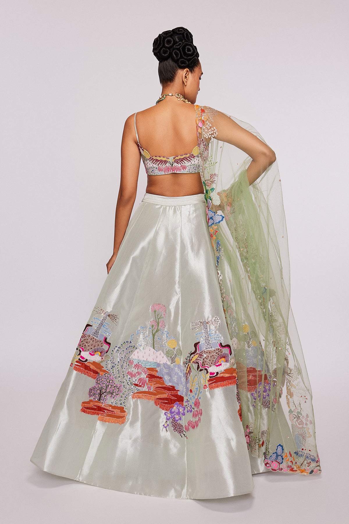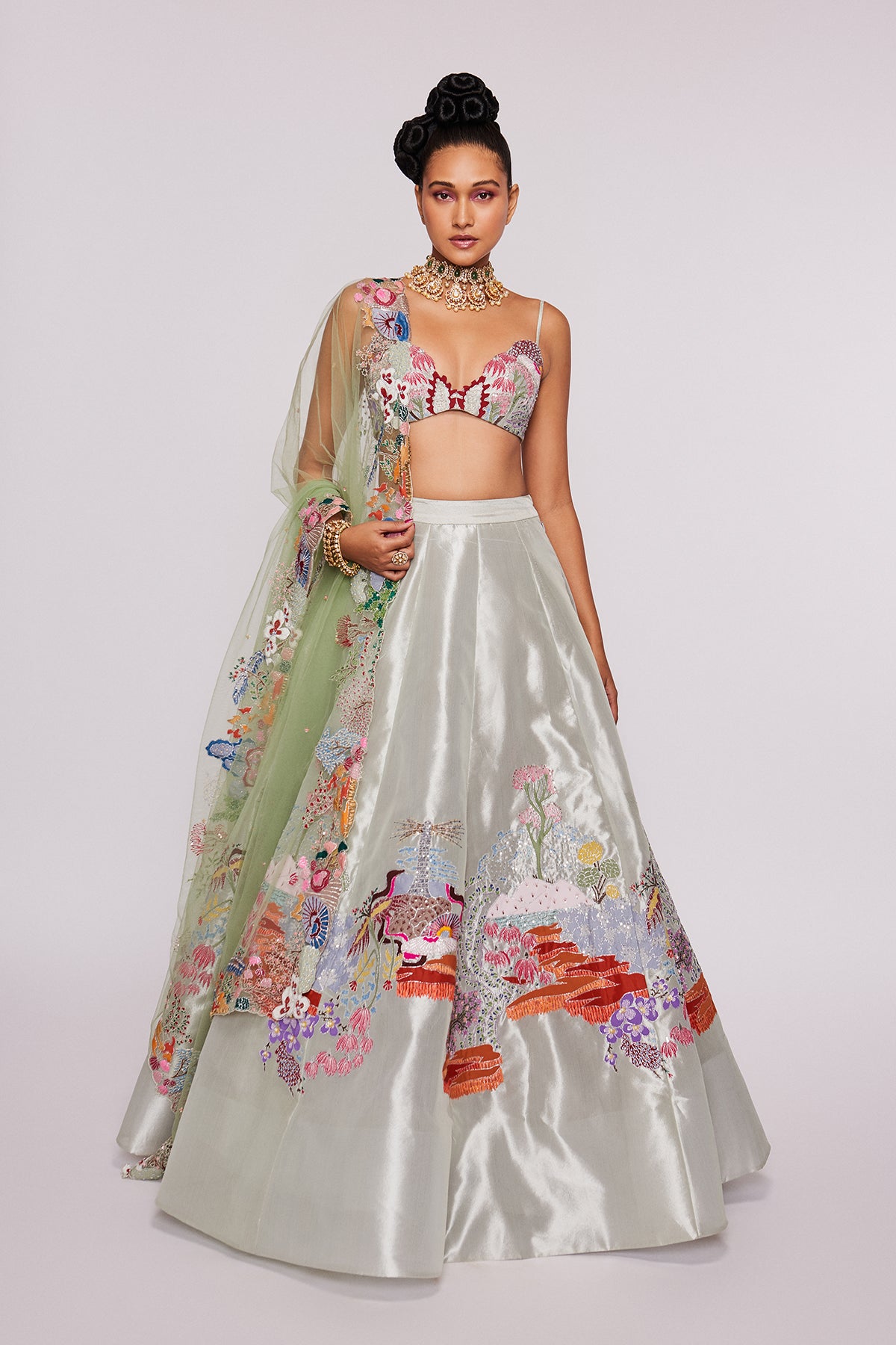 Ivory divergence tissue appliquéd and embellished lehenga with blouse and dupatta