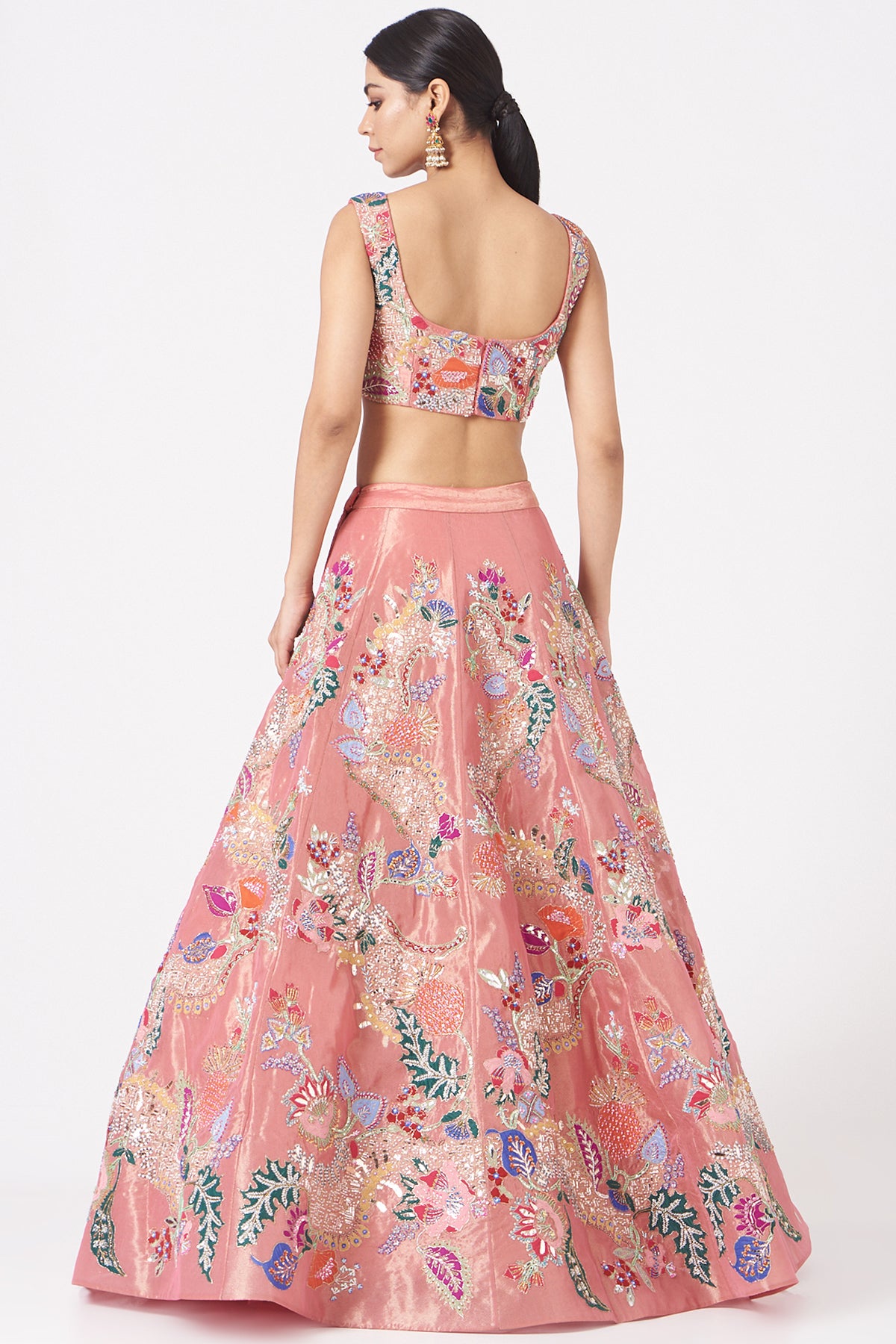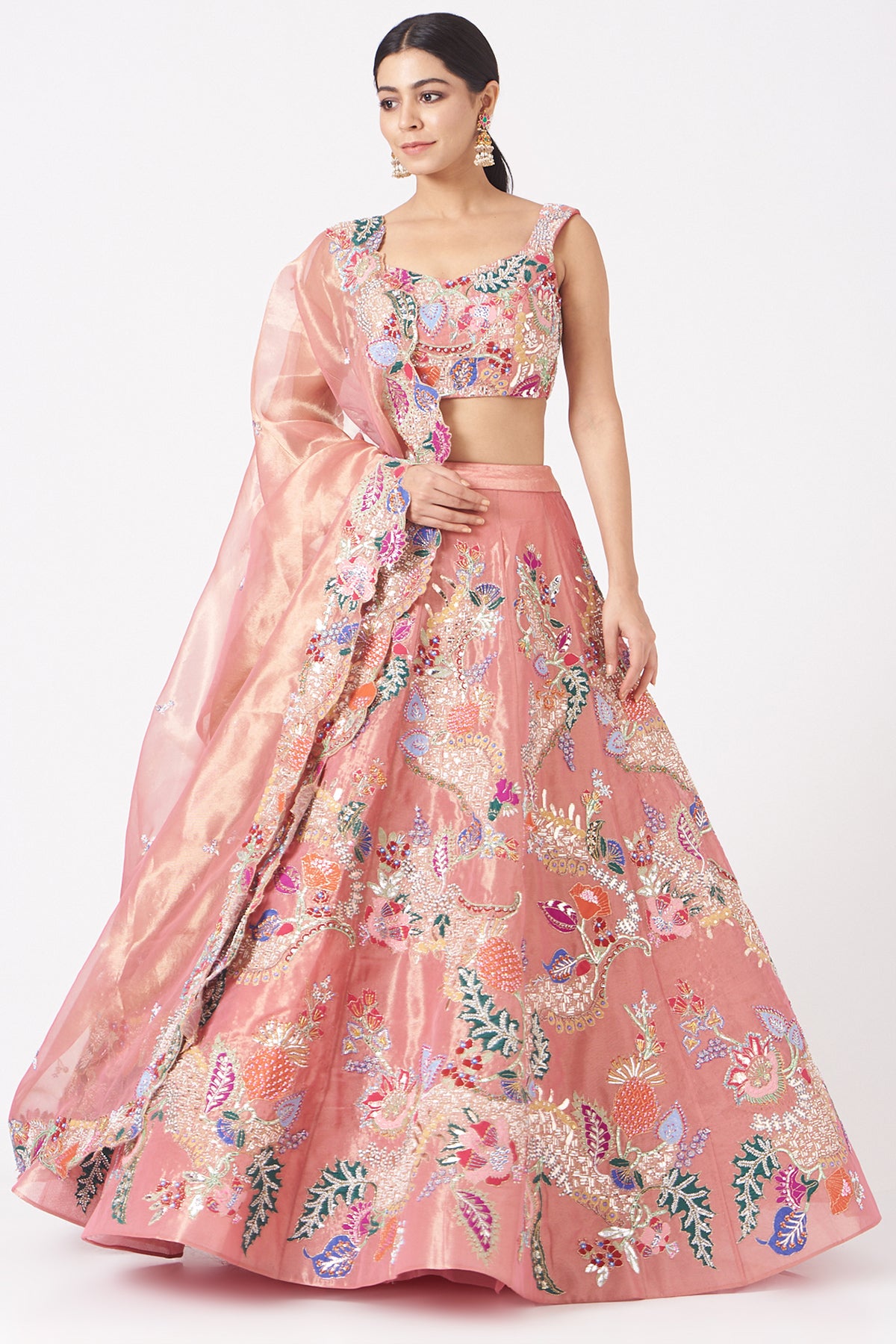 Pink juna tissue appliquéd and embellished lehenga with blouse and cutwork tissue dupatta