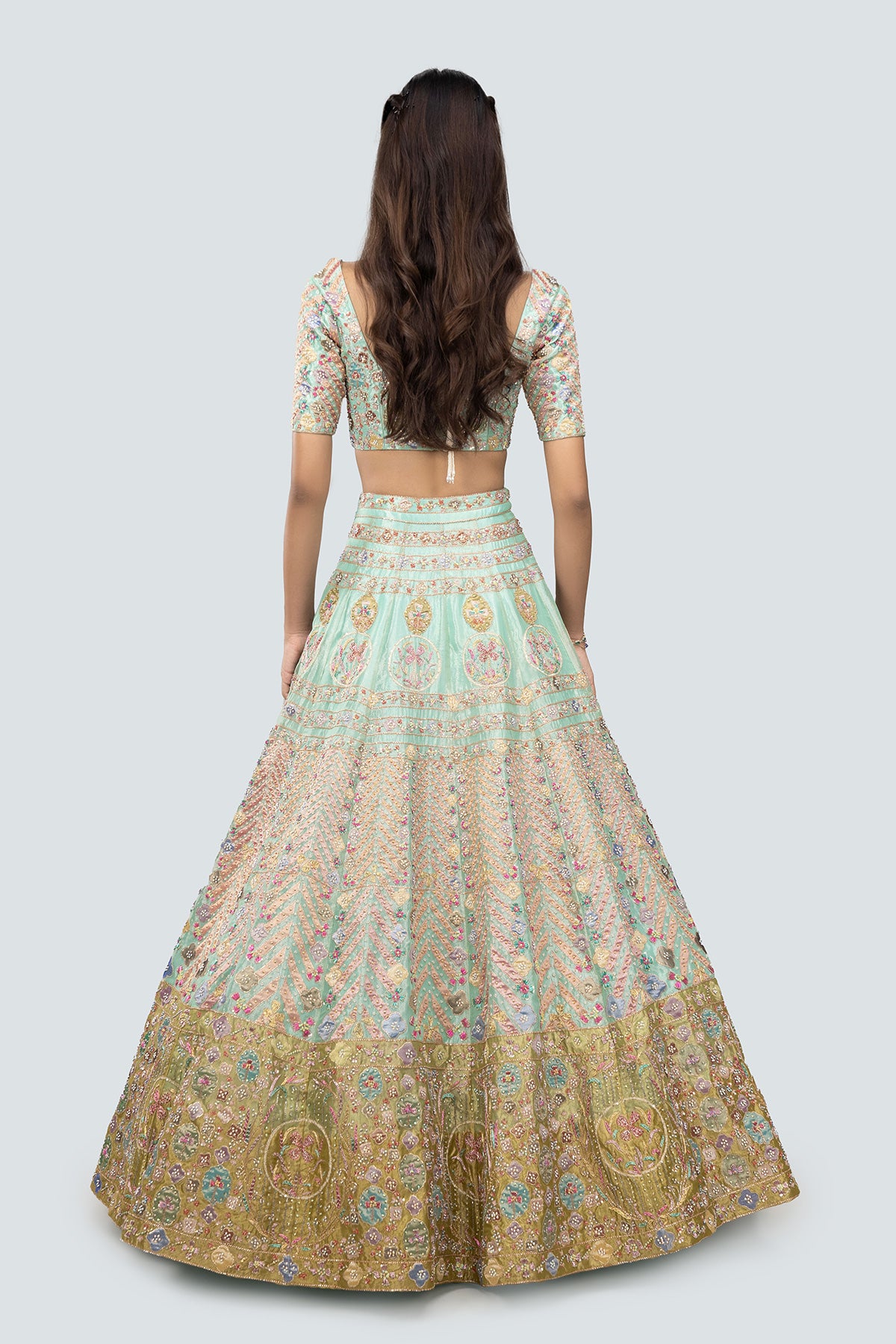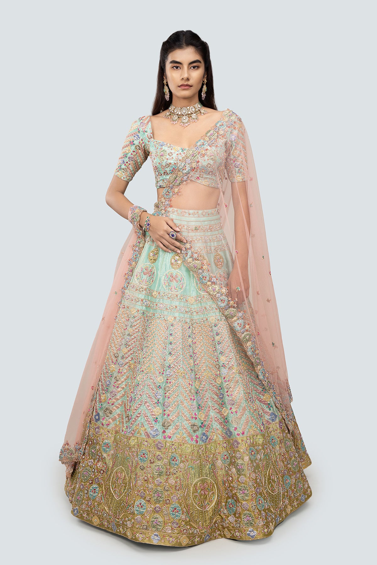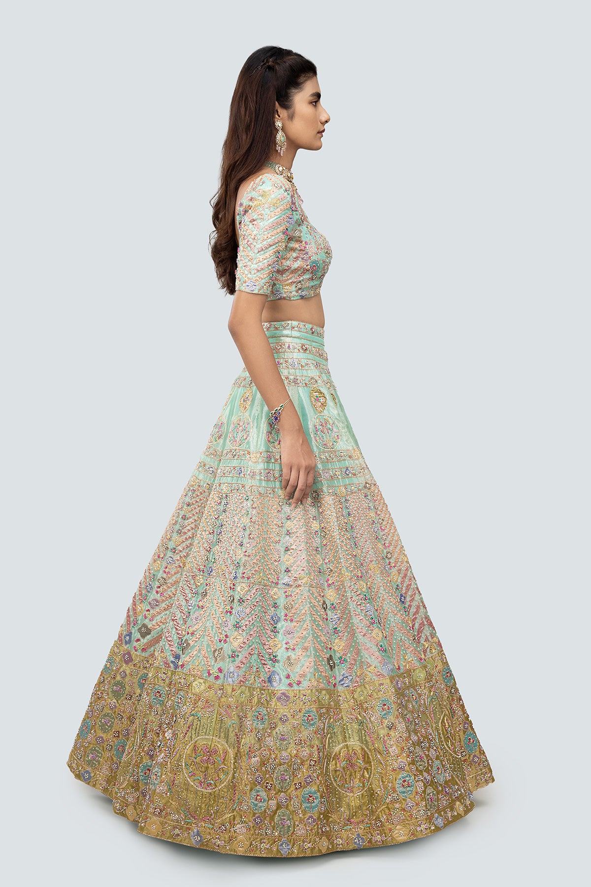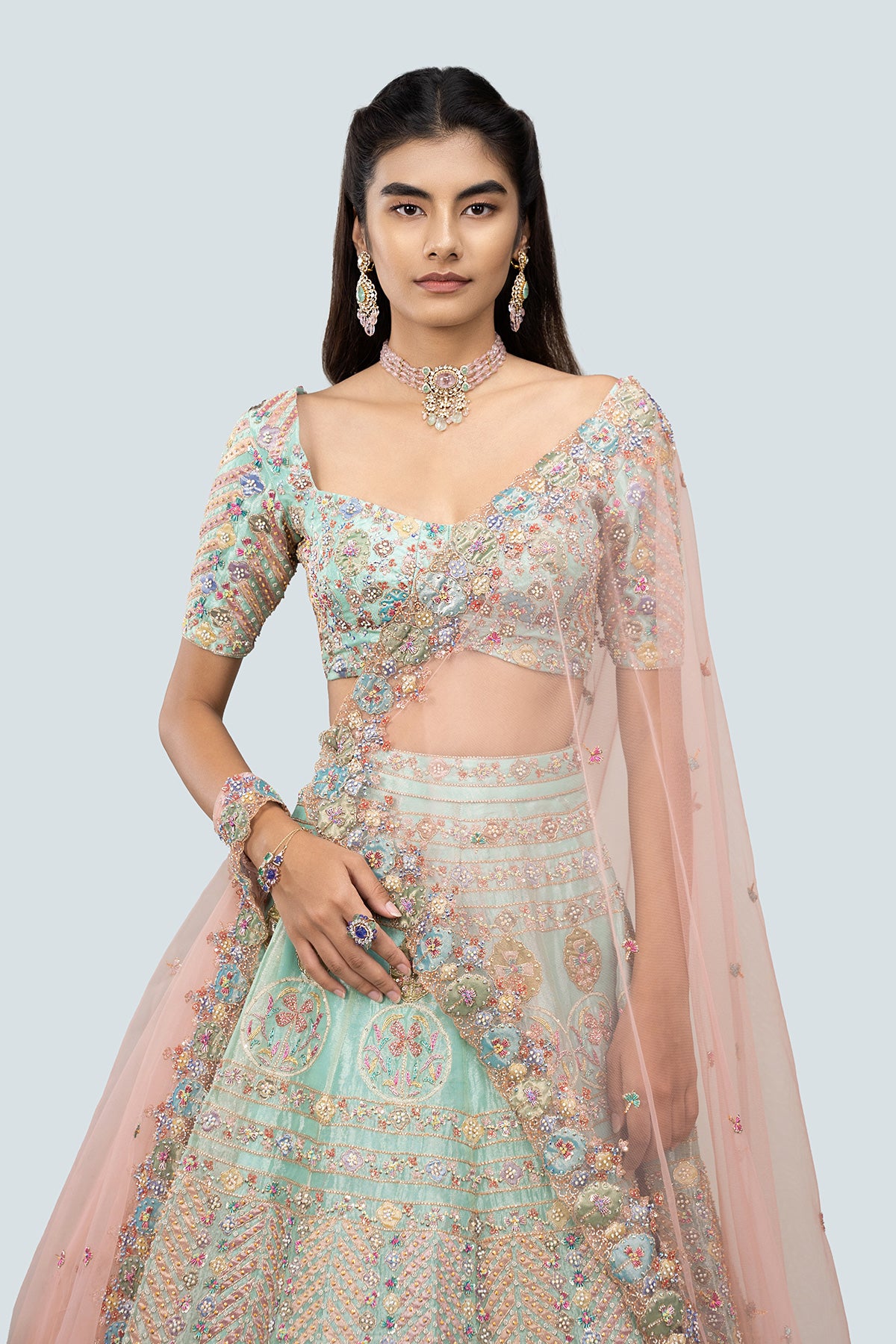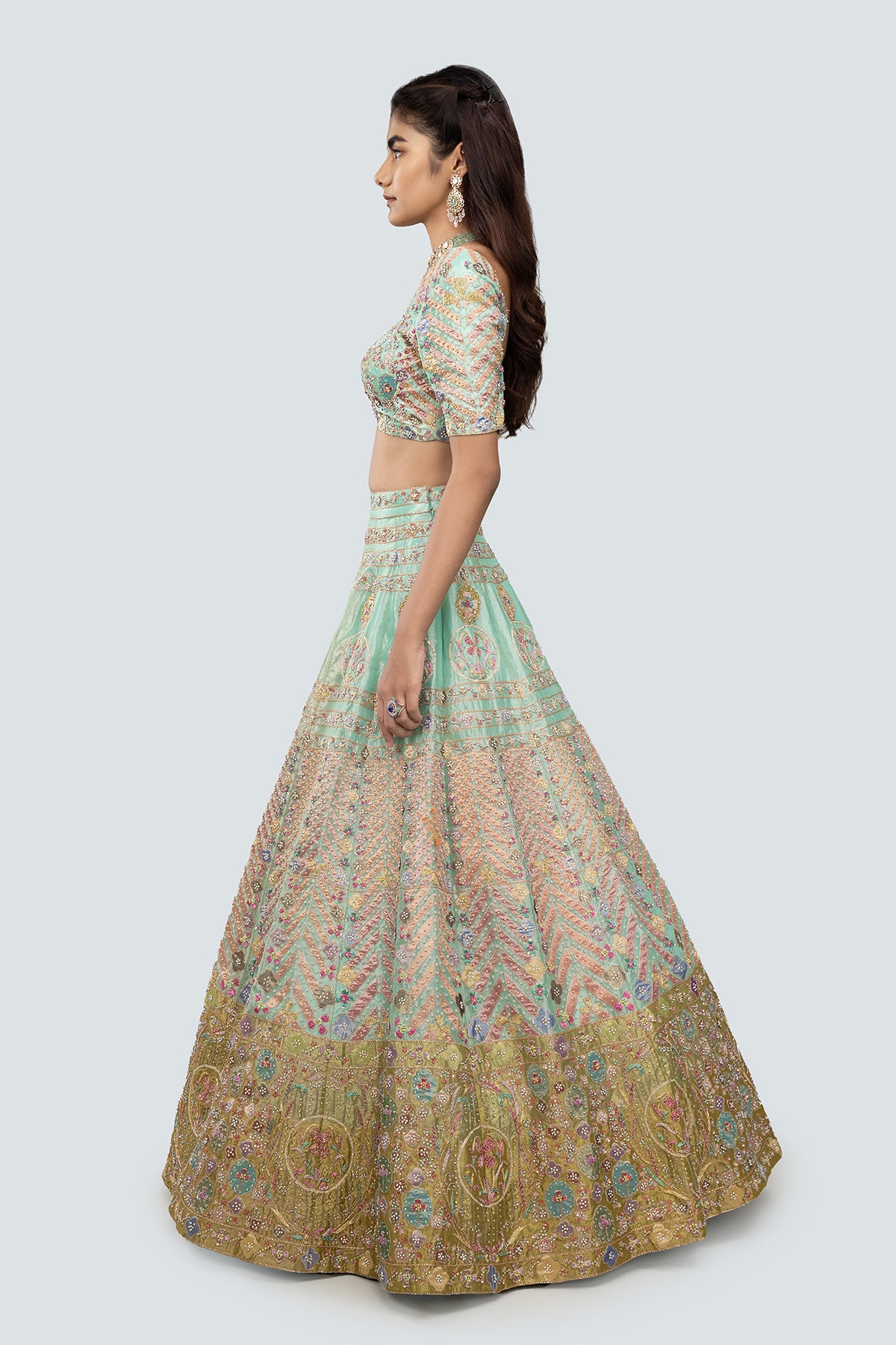 Multicoloured embellished heavy kali tissue lehenga with blouse and net dupatta with border.
