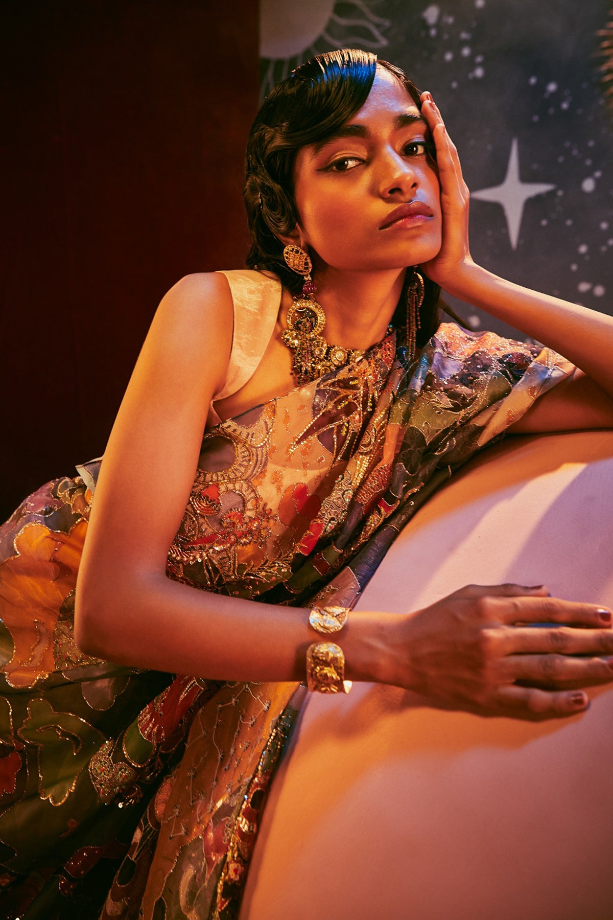Peach paper dolls organza printed and embellished tissue saree and blouse.