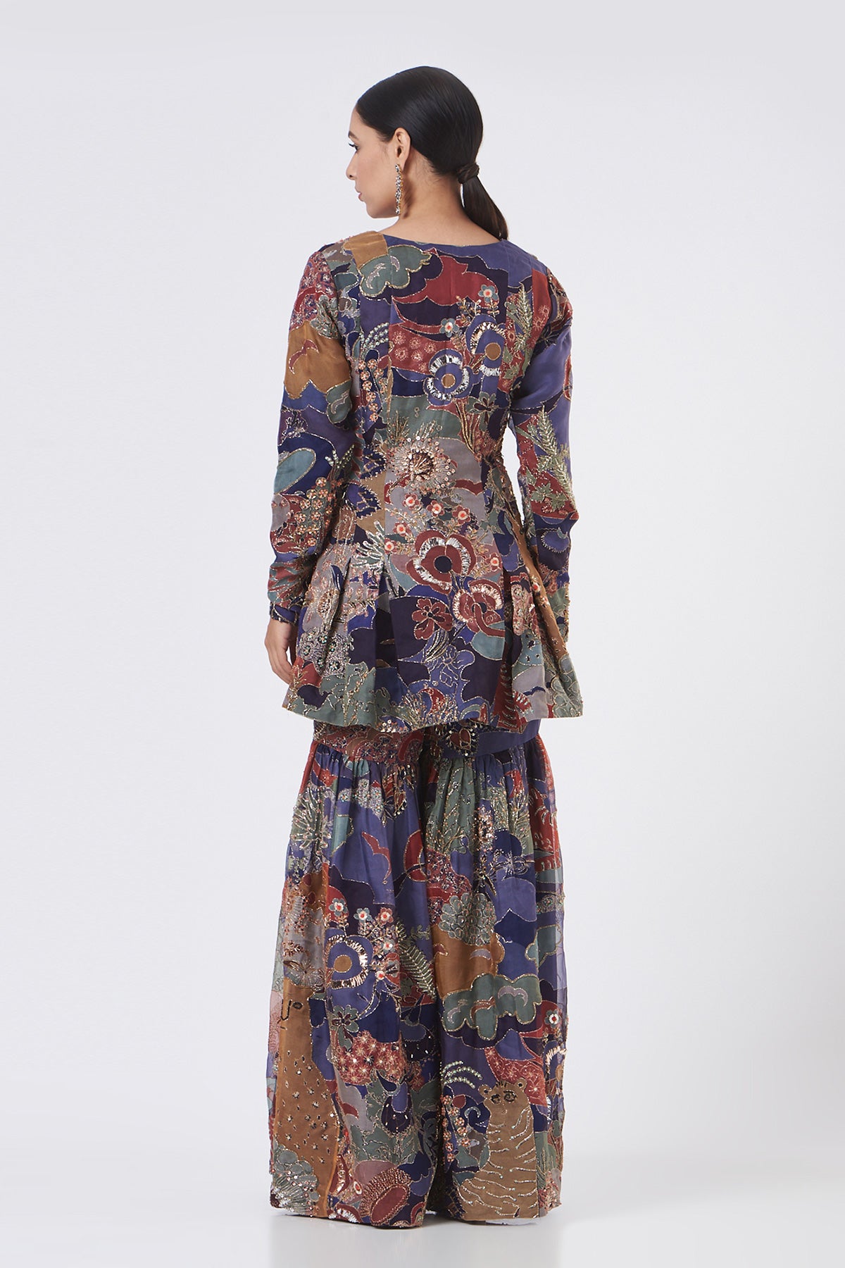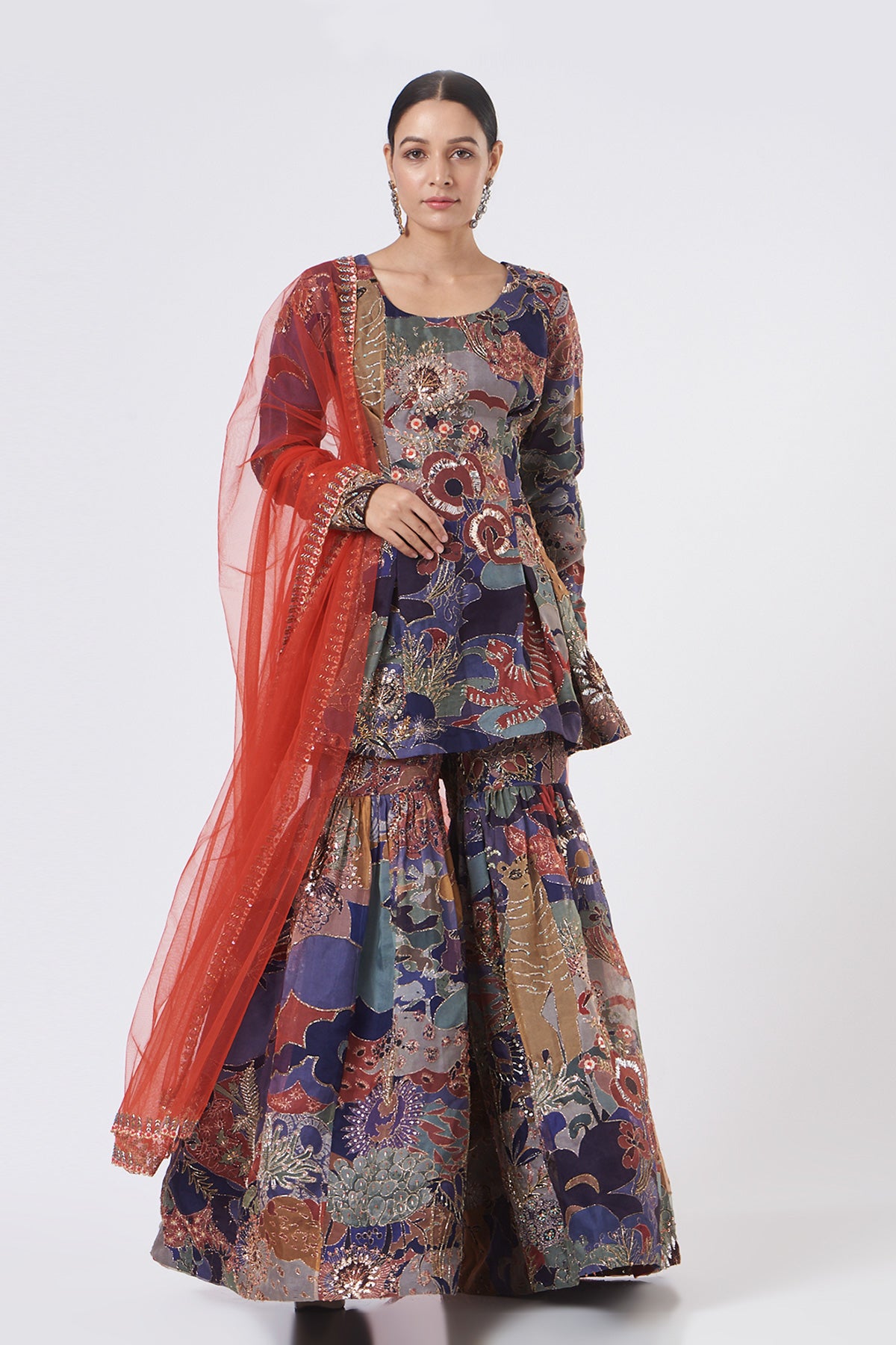 Blue paper dolls organza printed and embellished sharara set with dupatta