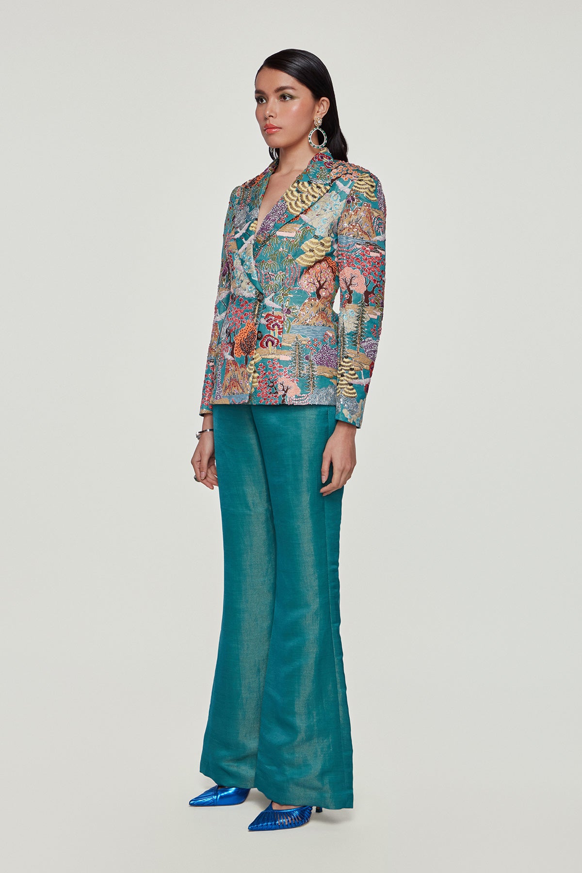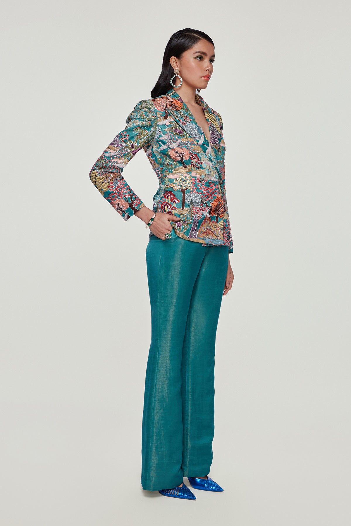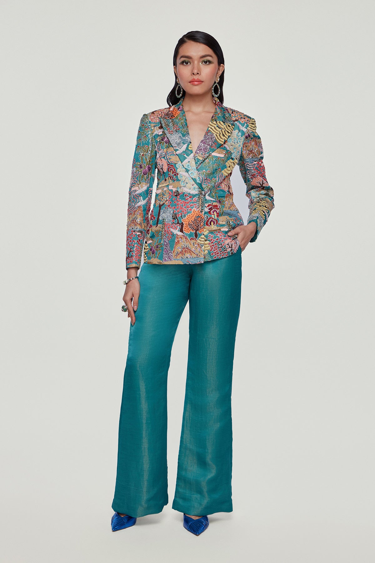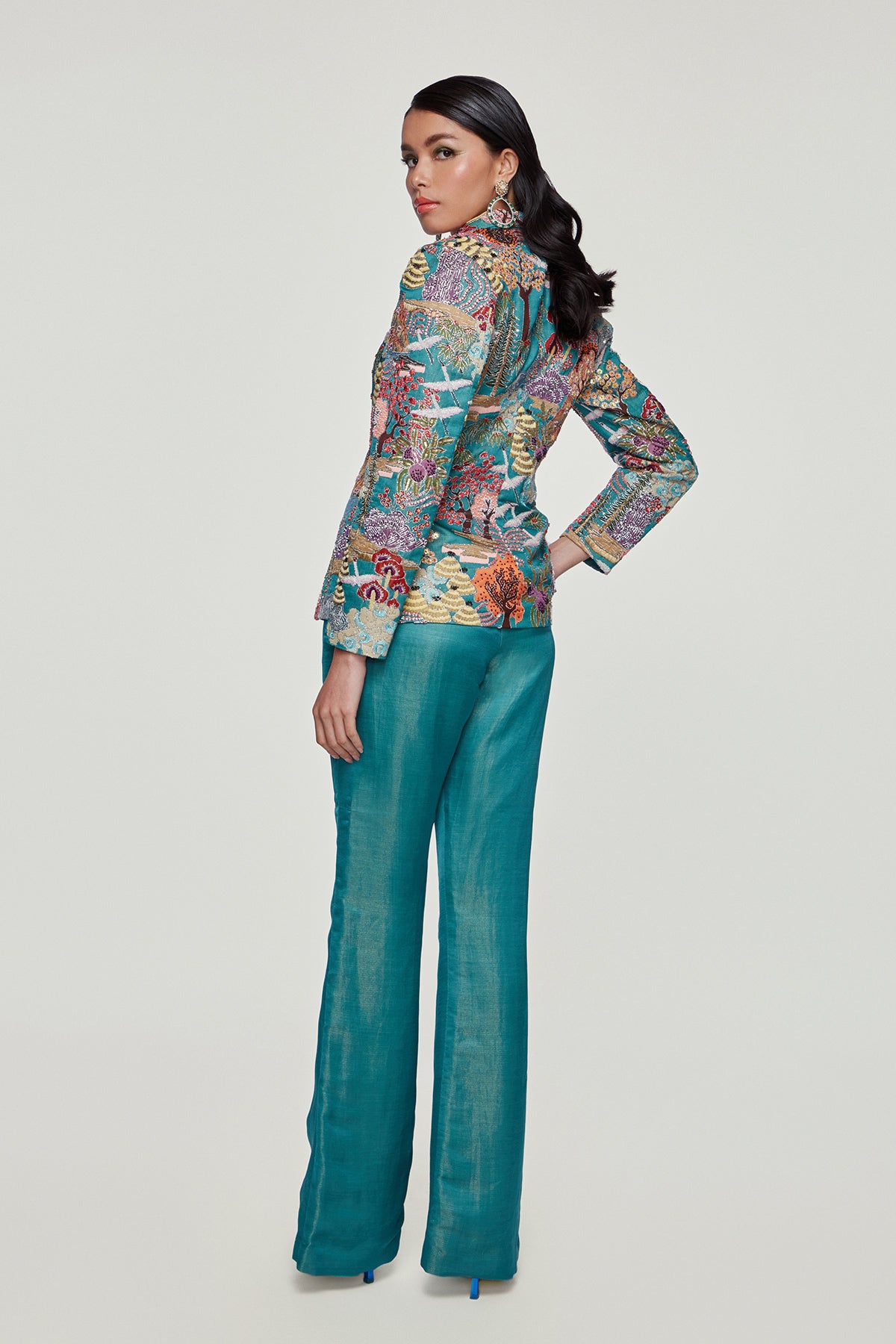 Our 'Divergence' turquoise appliquéd and embellished kasab satin pantsuit.
