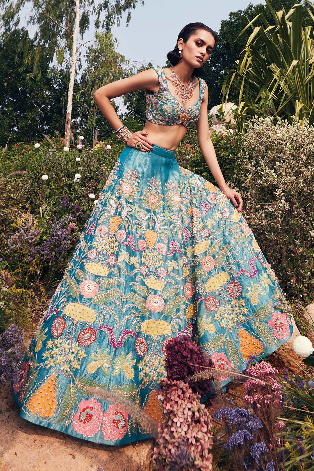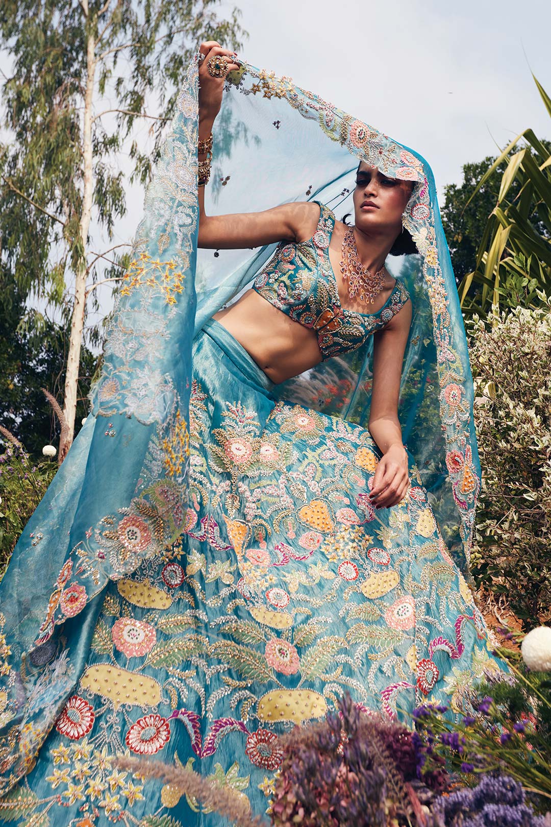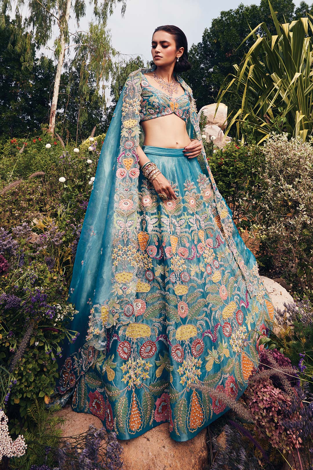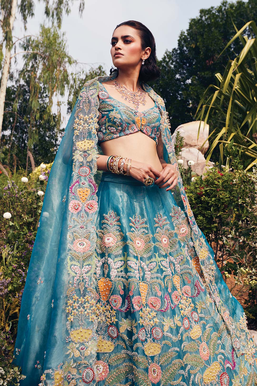 Teal Juna tissue appliqued and embellished lehenga with blouse & dupatta