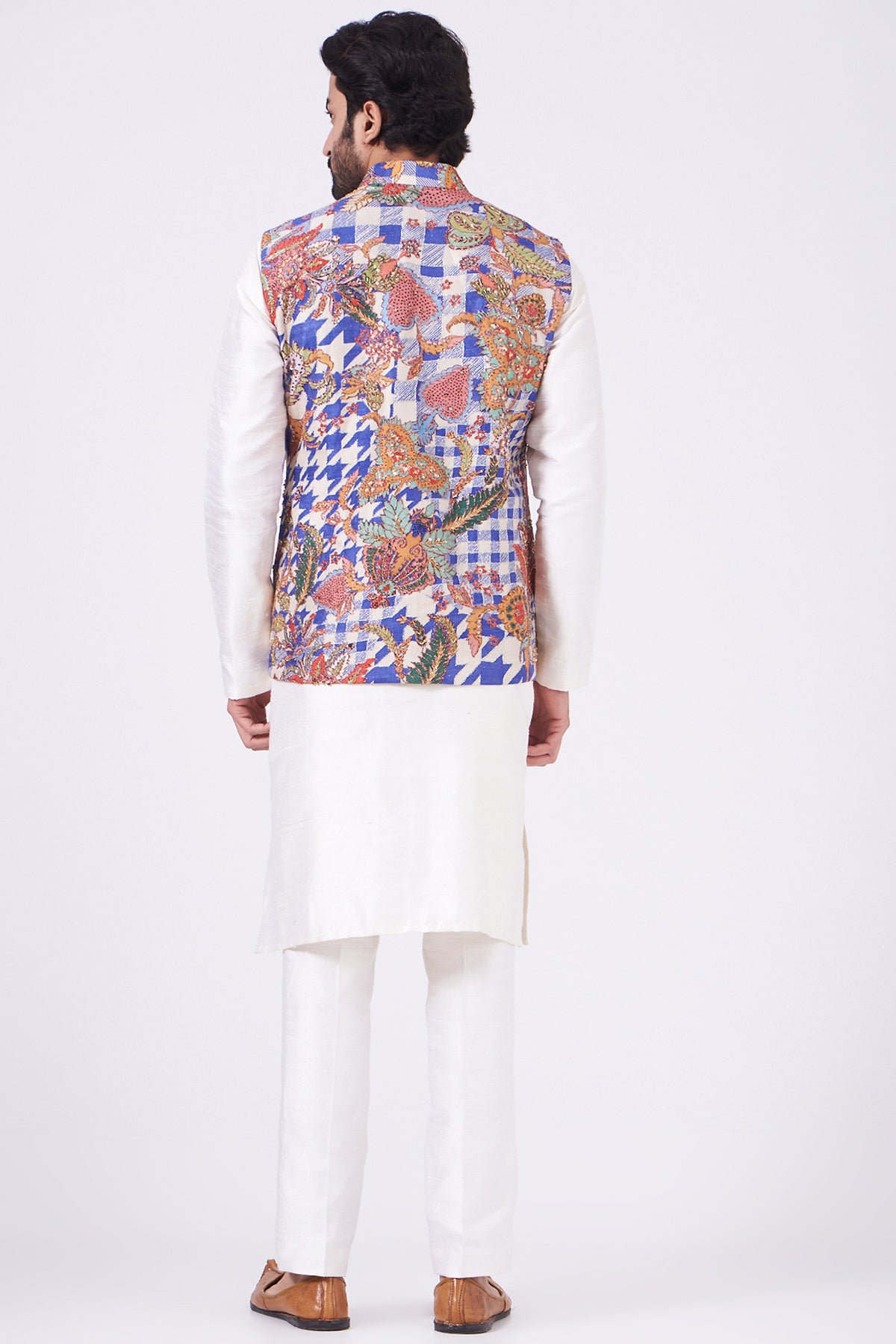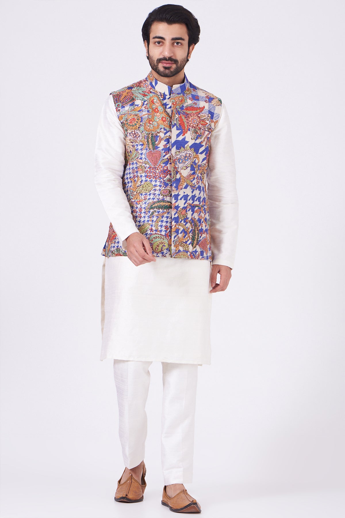 Violet Juna raw silk printed and embellished bundi with white raw silk kurta and pants