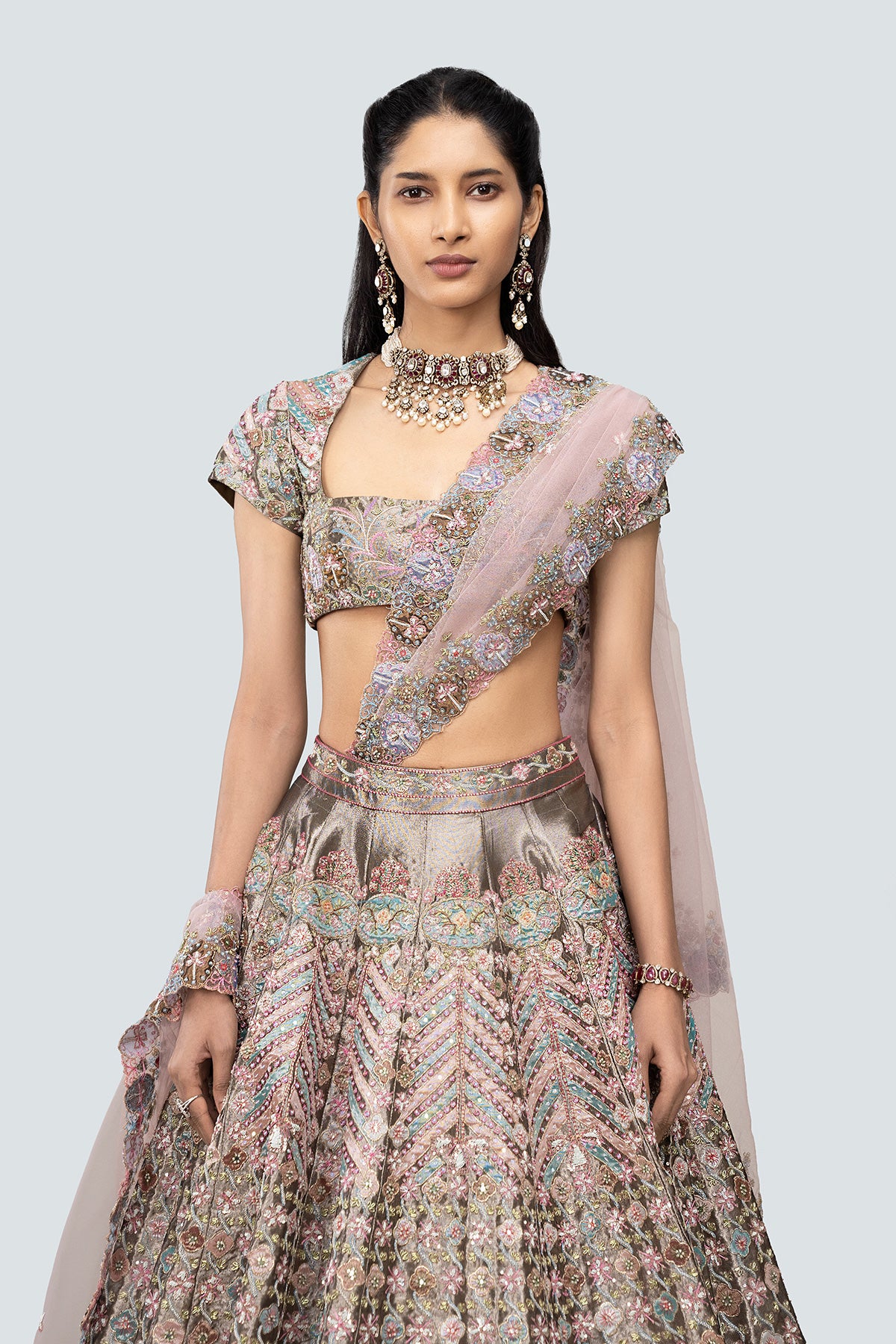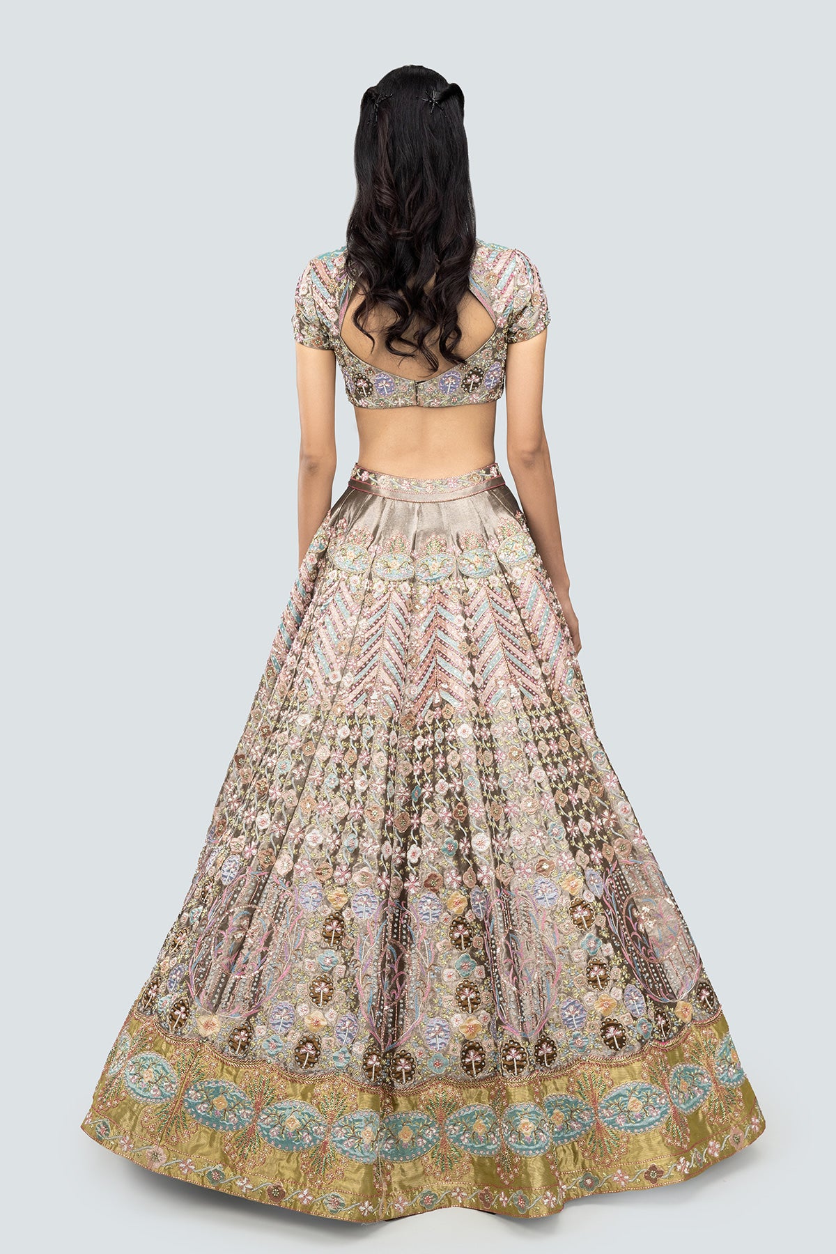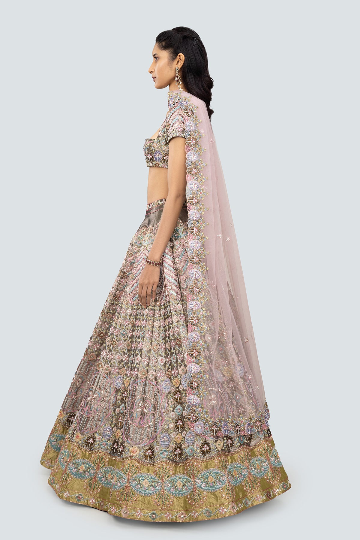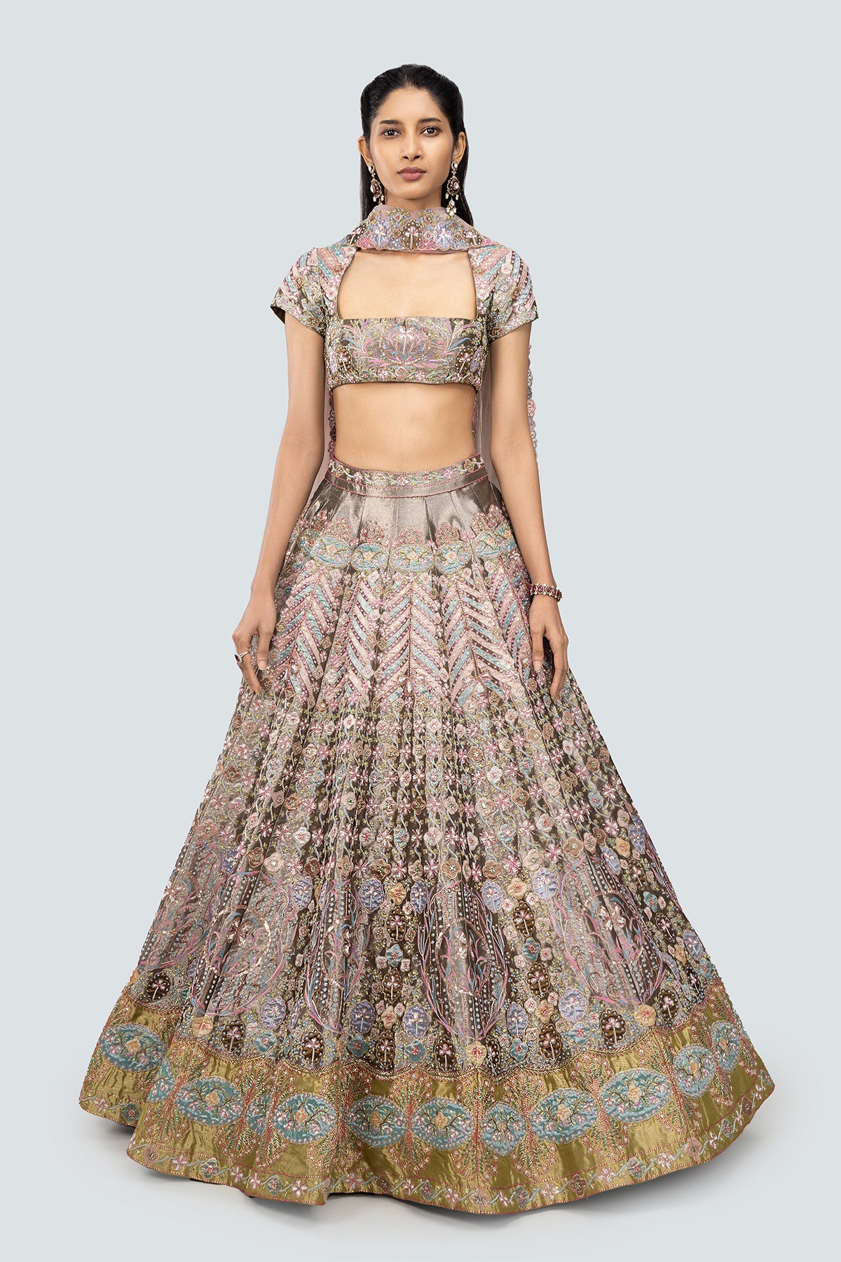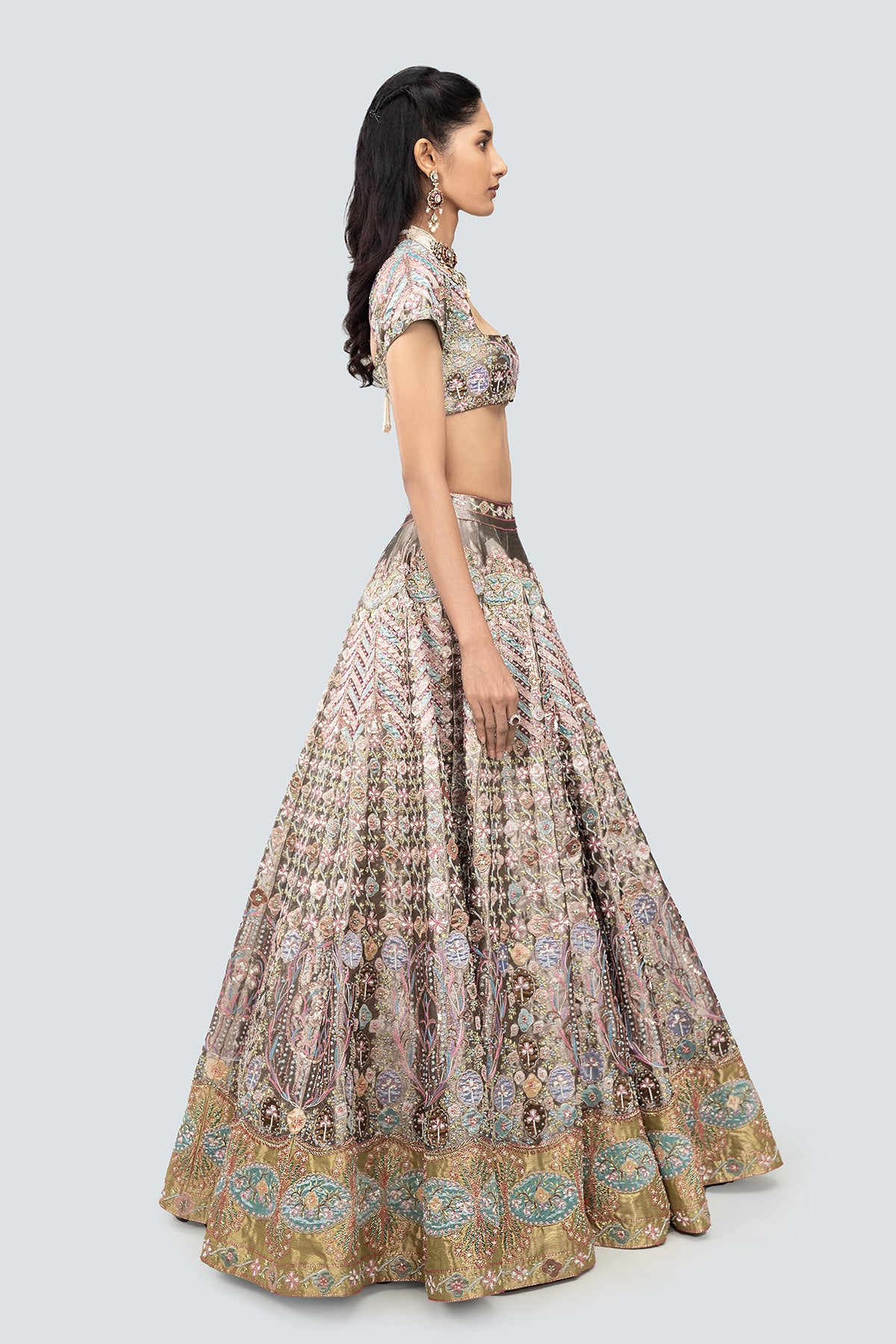 Multicoloured heavy embellished and applique kali tissue lehenga with blouse & tulle dupatta.