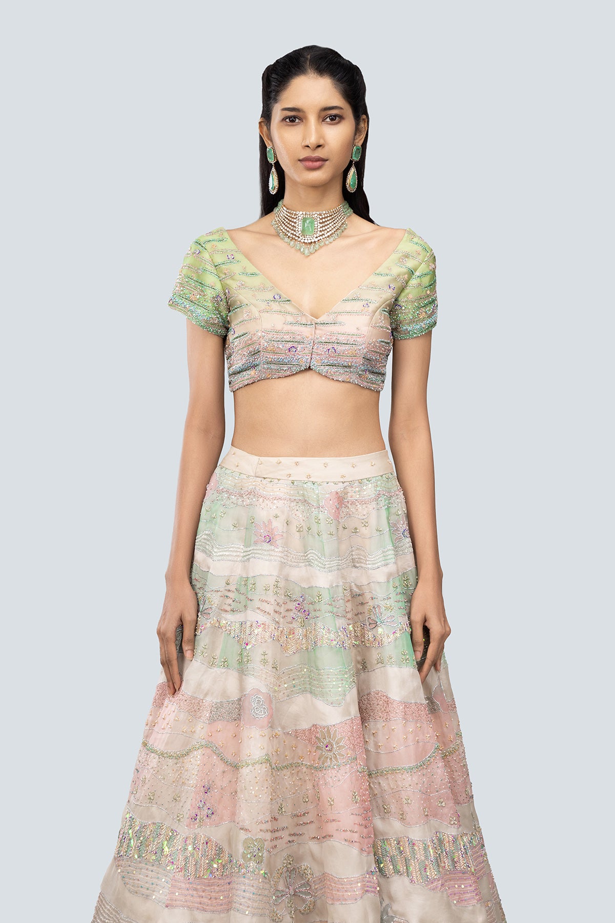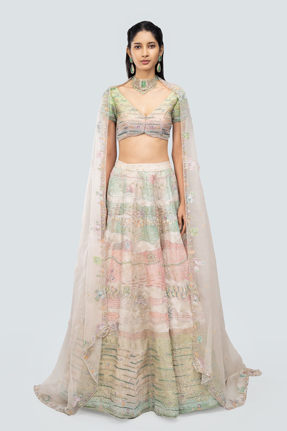 Pastel organza applique and embellished satin organza Lehenga with blouse and floral border dupatta.