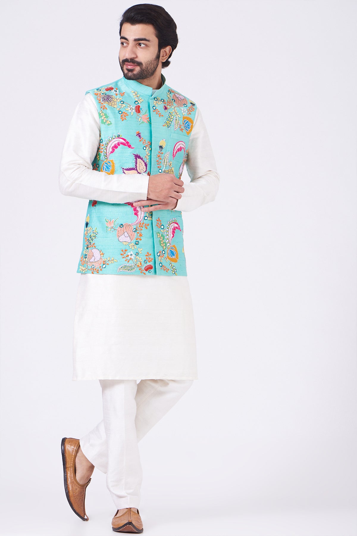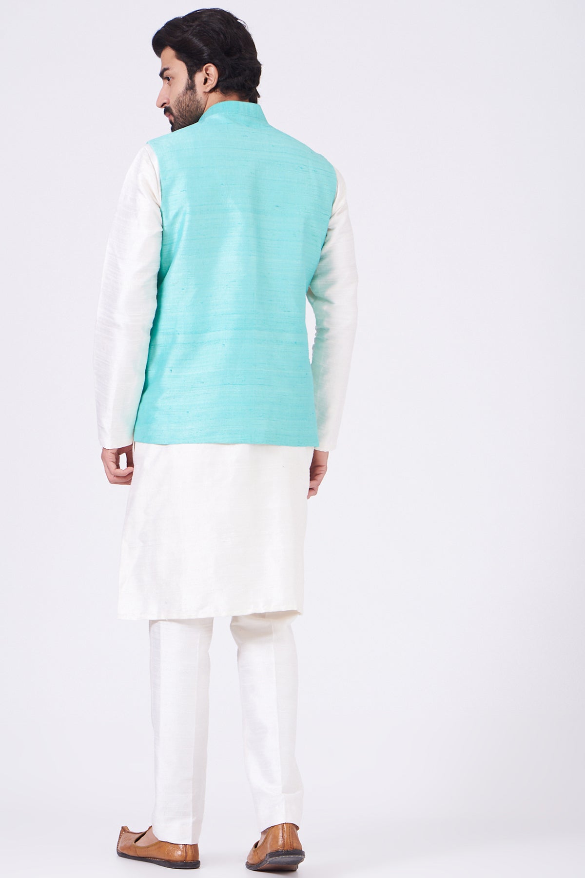Scuba blue nadenka raw silk appliquéd and embellished bundi with white raw silk kurta and pants