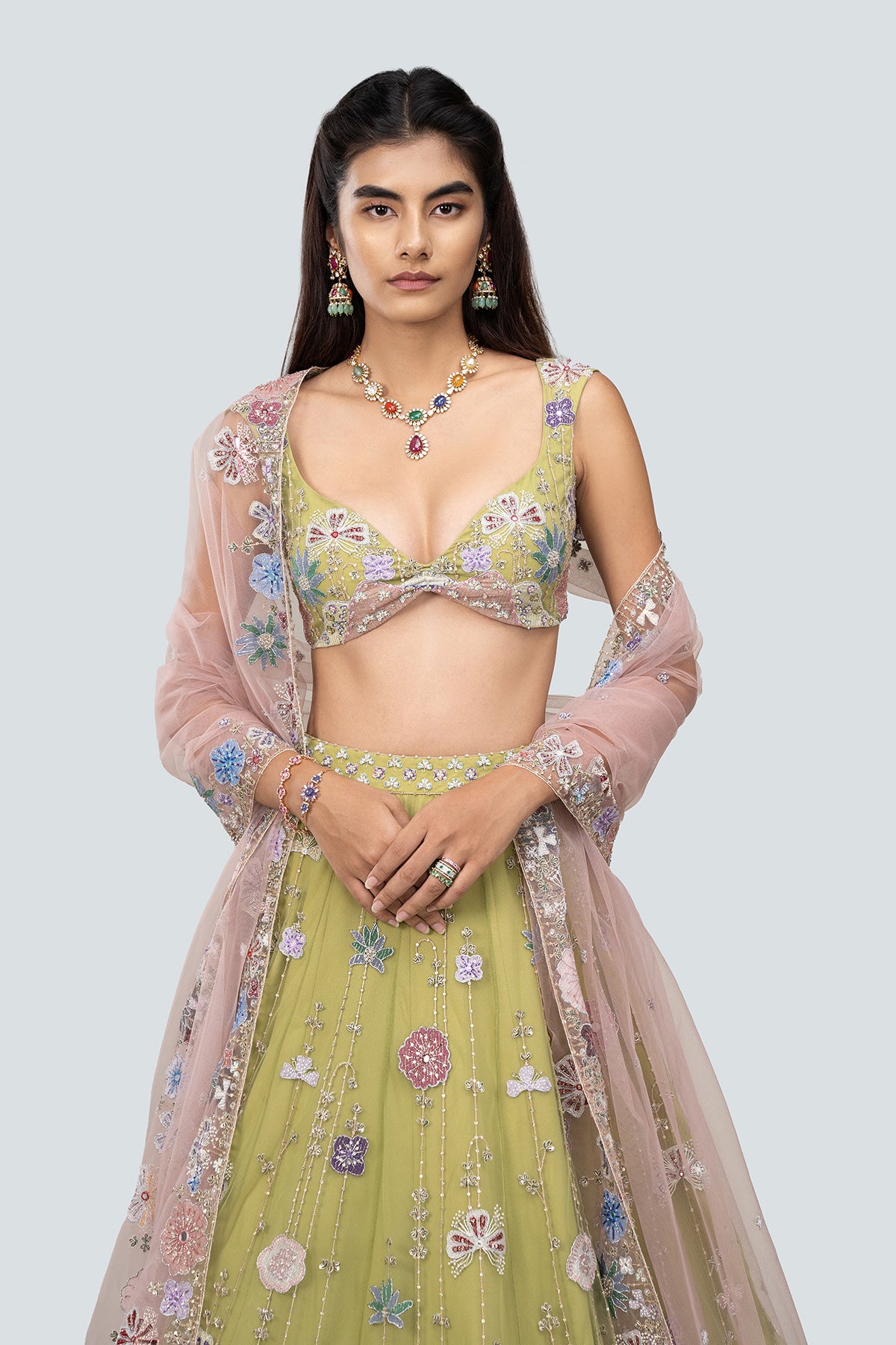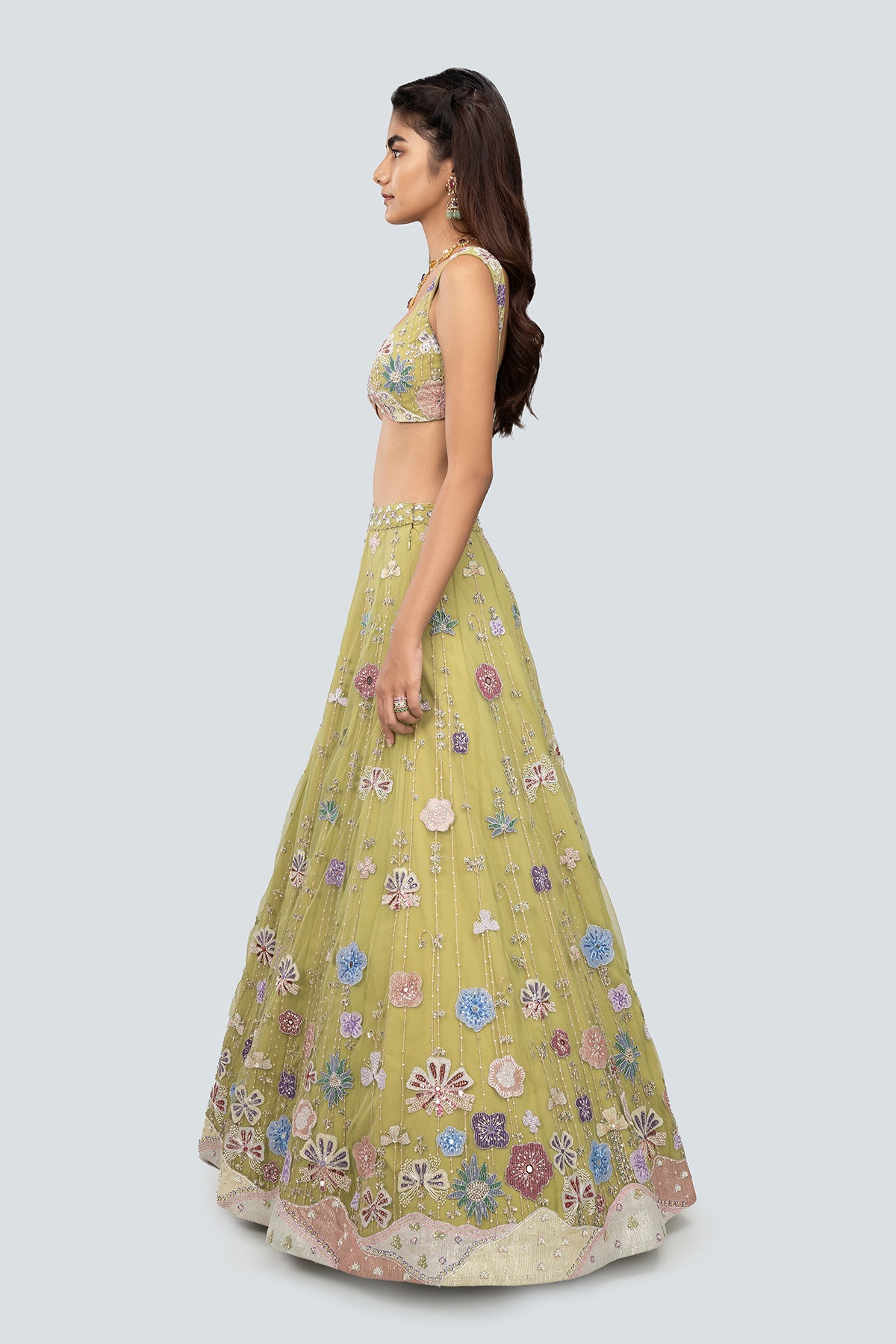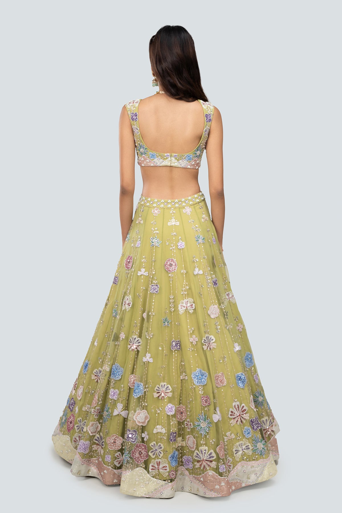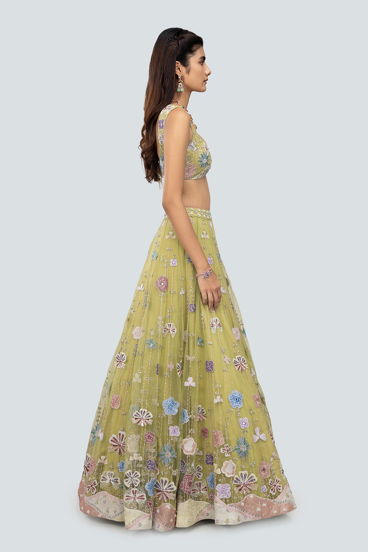 Citron net embellished, applique and mirror work kali mountain lehenga with blouse and floral border tulle dupatta.