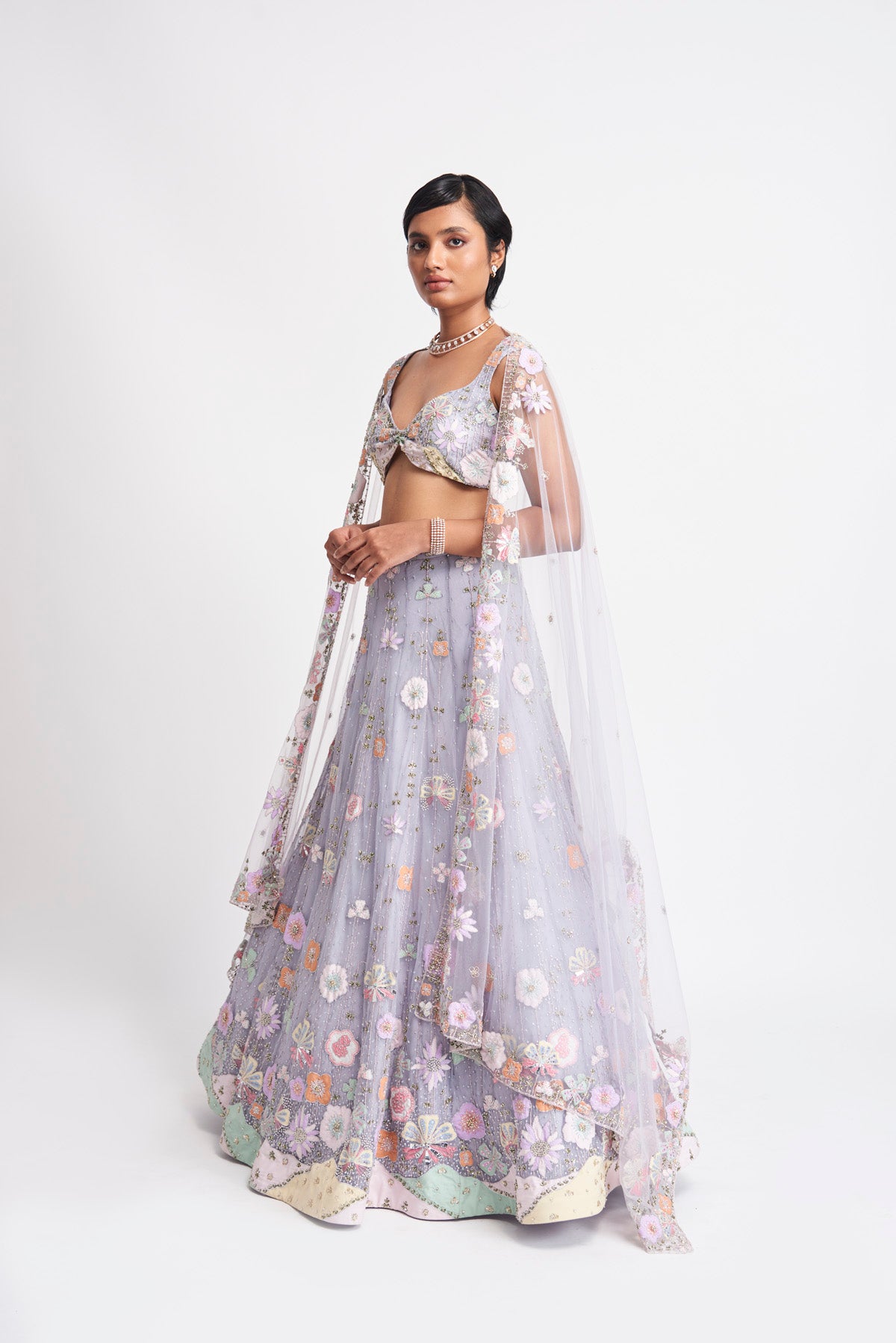 Banafsh Powder blue applique embellished tulle lehenga, blouse & dupatta.